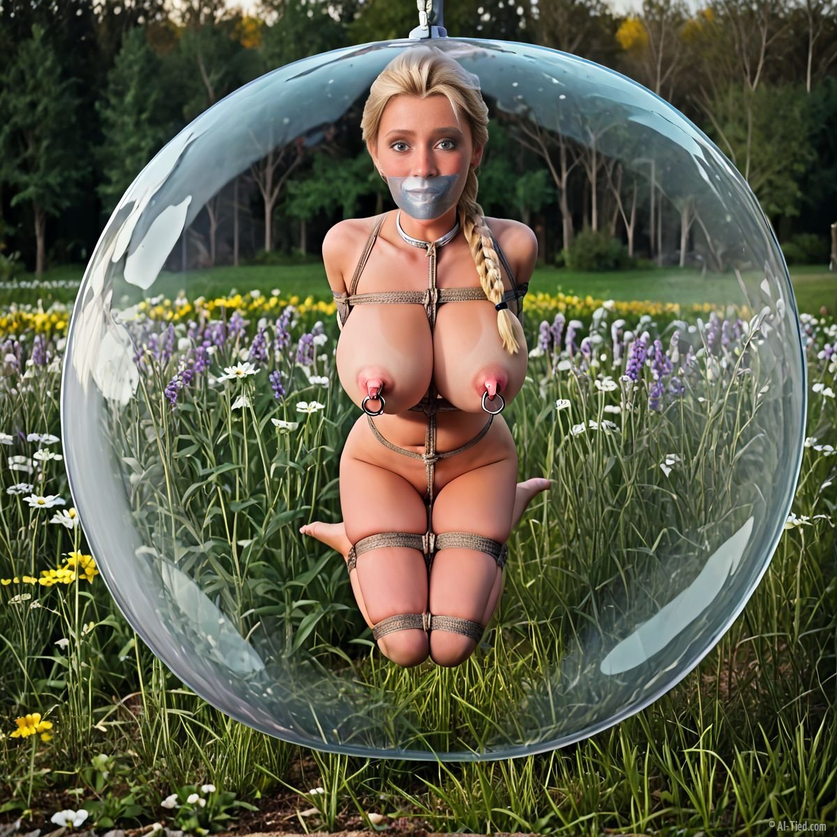 In a clearing amidst blooming flowers and green grass, Elsa stands—or rather, does not stand—in a state of profound stillness. Her once-free spirit is now bound by ropes that restrict every movement, leaving her muscles aching under the relentless tension. The ropes are so unyielding that even the slightest shift would bring pain, yet she cannot find relief, trapped as she is in this torturous position. Clear tape covers her mouth, sealed with a magic that only the utmost concentration could unravel, leaving her voice silenced and her world reduced to silence. Around her, the air is thick with summer’s scent, yet it is all beyond her reach, for she is encased in a bubble as thin as a child’s birthday balloon, impenetrable and eternal.