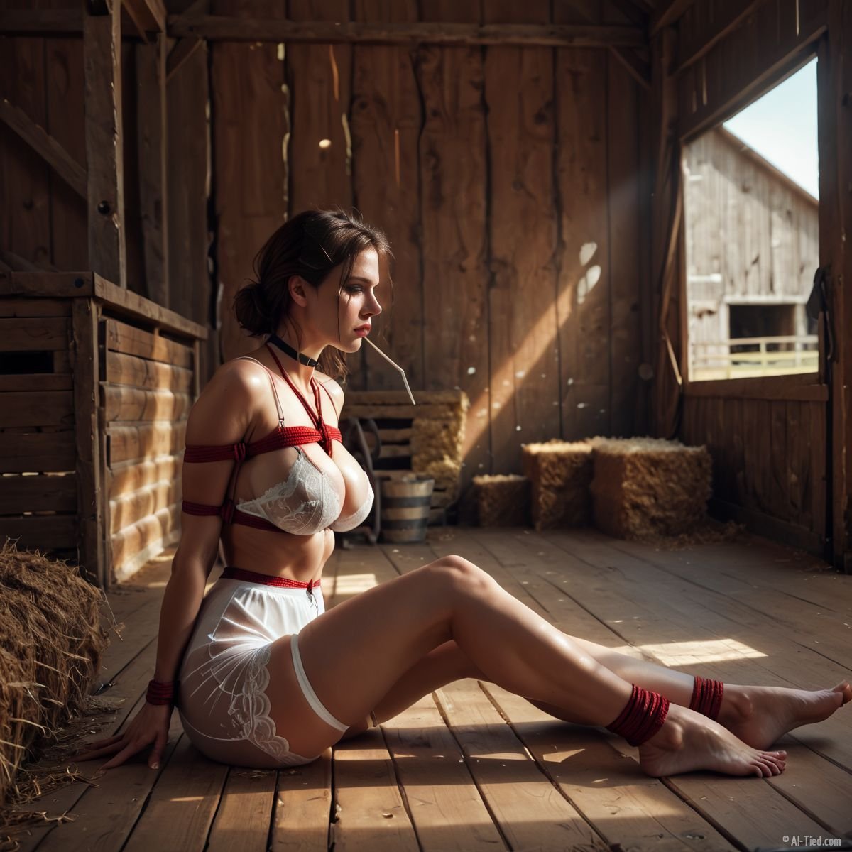 Katelynn woke up to find herself tied up in a dusty old barn, surrounded by empty stalls and silence. Her brown hair was tangled and dirty, and she could feel the rough ropes biting into her skin. She struggled against her bonds, but they were too tightly secured.