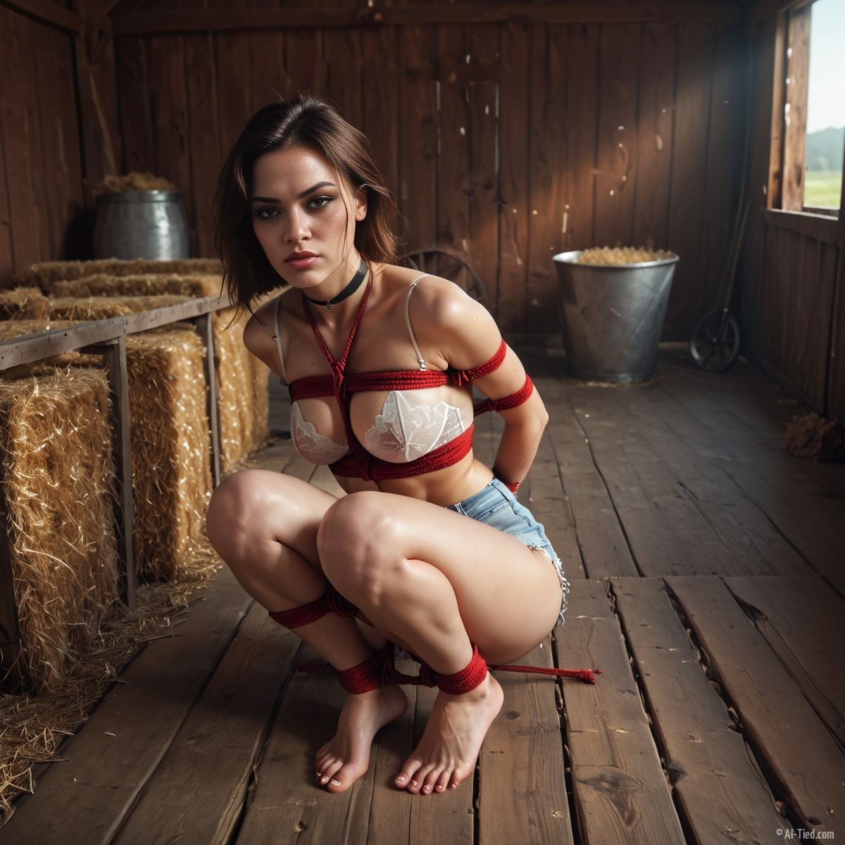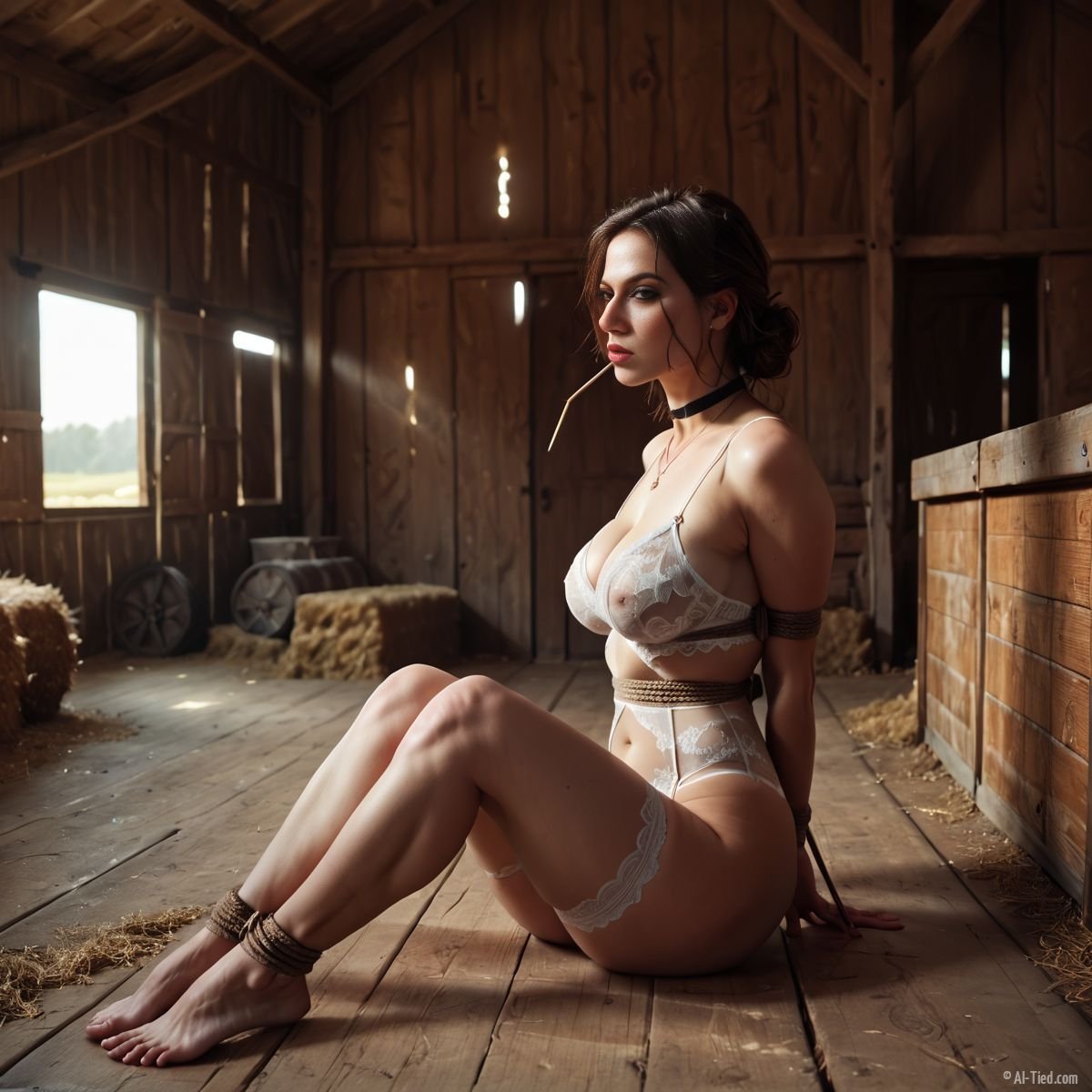 Katelynn woke up to find herself tied up in a dusty old barn, surrounded by empty stalls and silence. Her brown hair was tangled and dirty, and she could feel the rough ropes biting into her skin. She struggled against her bonds, but they were too tightly secured.