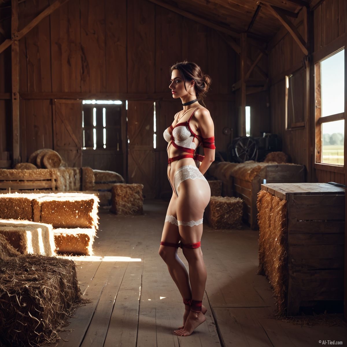 As she struggled against her bonds, Katelynn realized that she was wearing only a lace bra and panties, but no other clothing. The cool air of the barn chilled her bare skin, making her shiver in spite of the warm summer sun beating down on the roof.