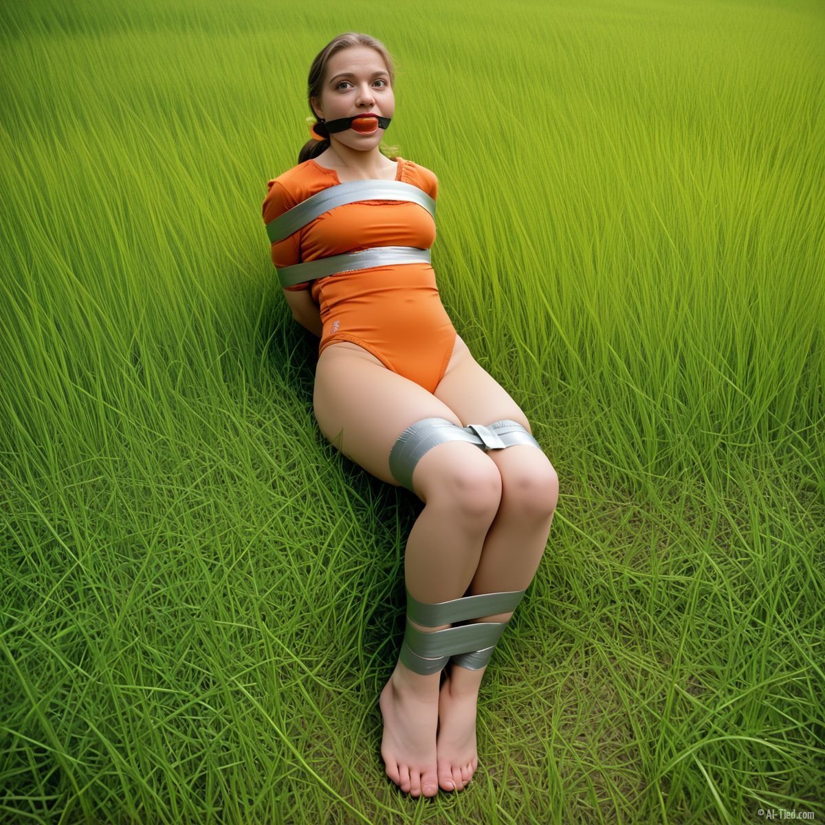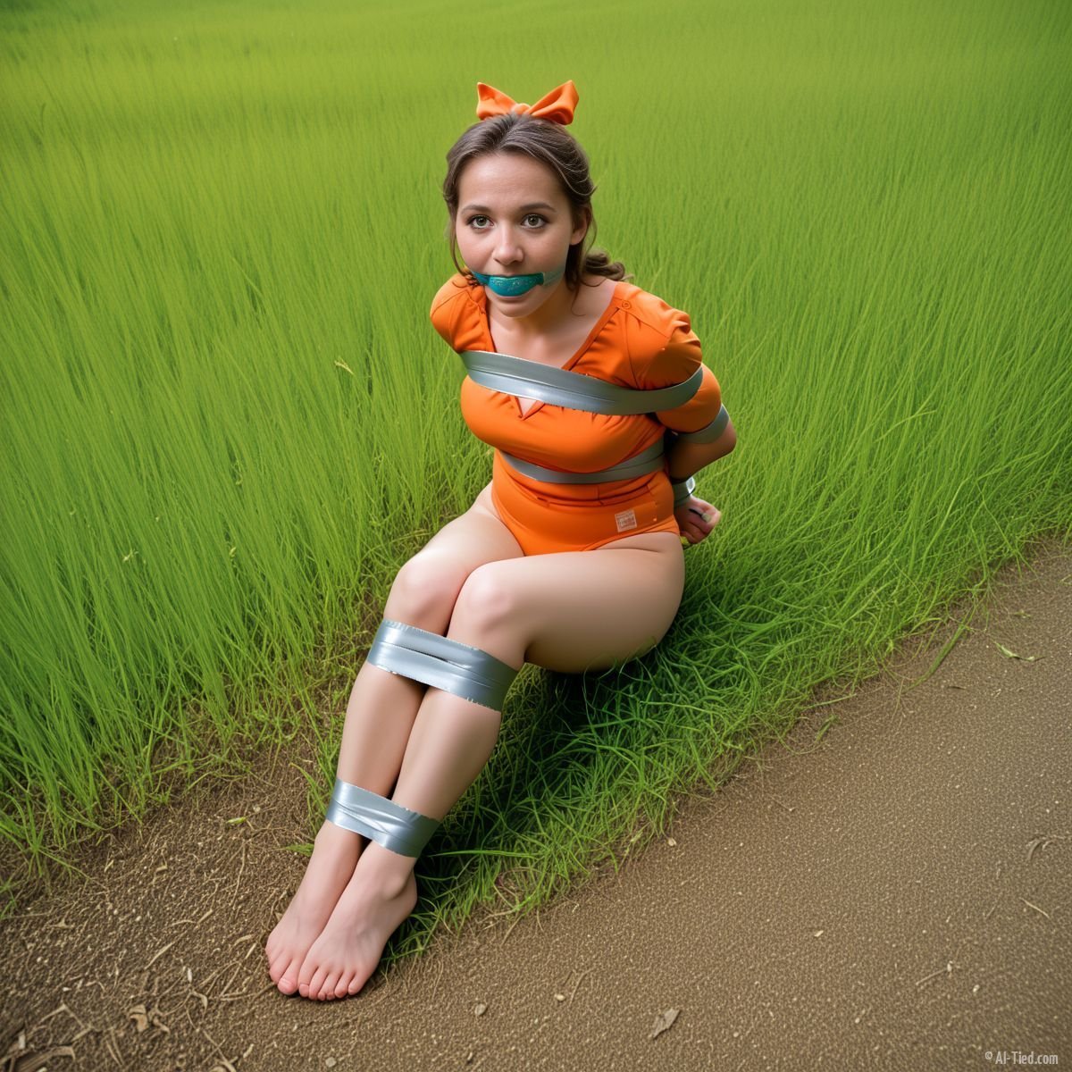 She wakes up in a field, her perfectly toned body secured with thick, unyielding tape. Her wrists, elbows, knees, and ankles are all bound with the strongest tape on the planet, rendering her immobile. A rubber and leather ball gag muffles any sounds she might make, trapping her in a silent, immobile prison. What is happening? she thinks, panic rising in her chest. Why can’t I move? Where am I? She takes a deep breath, trying to calm herself. I need to think, to find a way out.