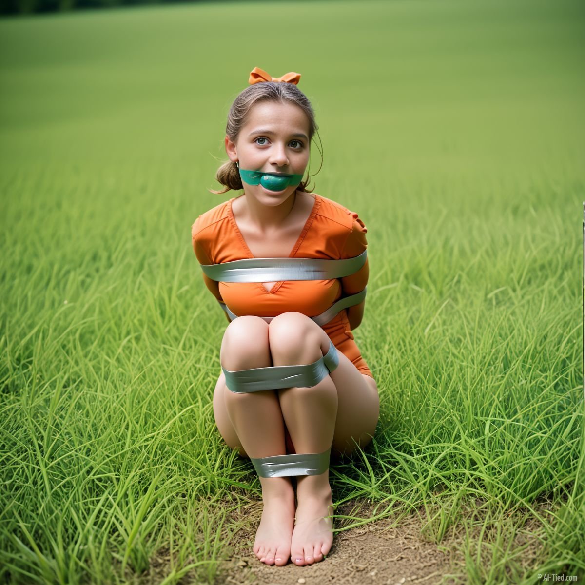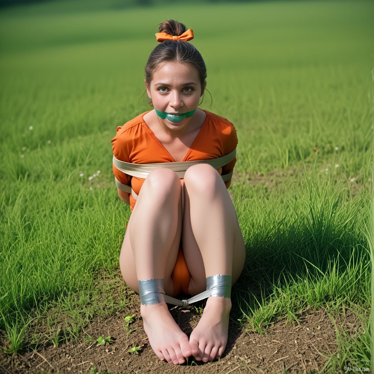 But the tape is unrelenting, and she soon realizes that she needs something sharp, something that can cut through her bindings. With a newfound determination, she starts to move, inching her way across the ground like a worm. It’s a slow, agonizing process, her bound body dragging through the grass, leaving a trail of disturbance behind her. Her perfectly toned body, usually a source of pride and strength, now feels like a cage, her muscles straining against the unyielding tape. The bow in her hair, a once-cheerful accessory, now seems like a mockery, a reminder of the normalcy she has lost.