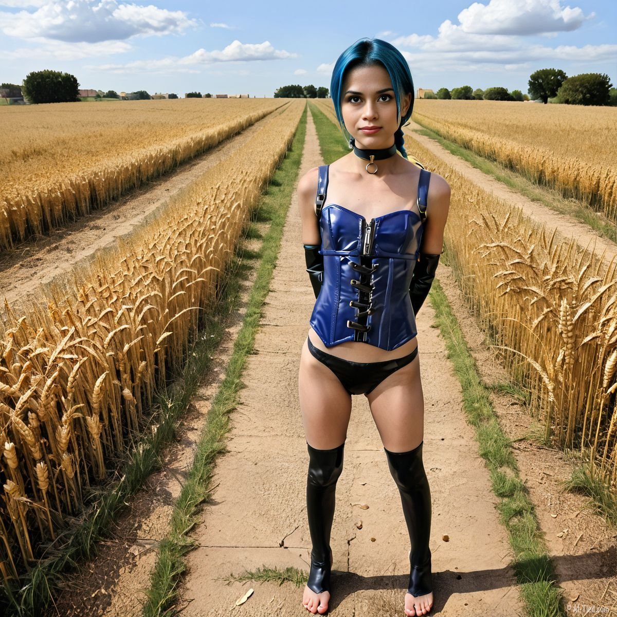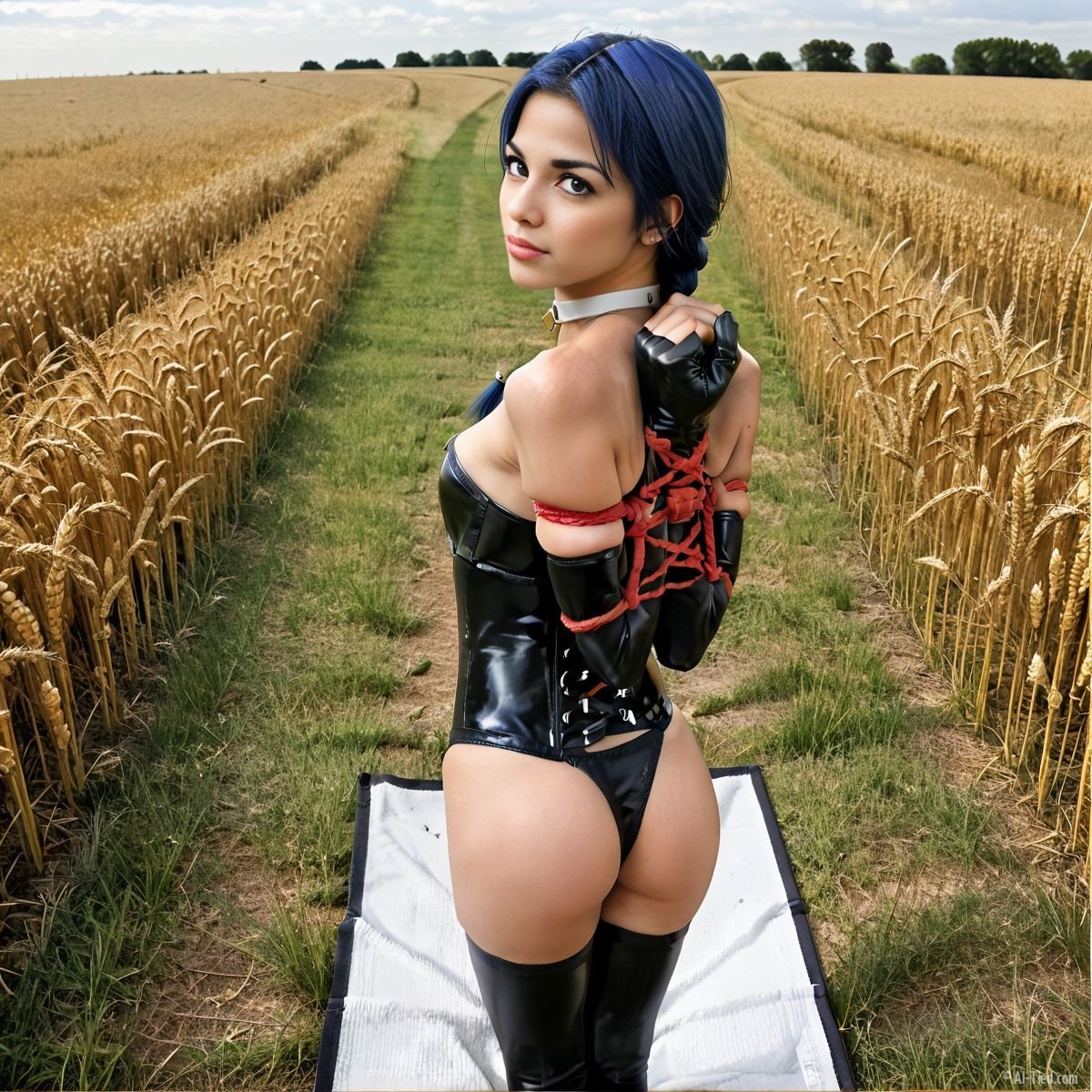 Under the endless blue skies of mid-September, McKayla knelt in the heart of a golden Kansas wheat field, the crisp autumn air brushing her skin. Her electric blue hair glowed against the amber stalks, and her latex corset gleamed, accentuating her curves as she held a reverse prayer pose, her arms bound tightly behind her by ropes of braided hemp. The sun bathed the field in warmth, though a cool breeze hinted at the turning season. She was alone—or so it seemed—her heart pounding with purpose.