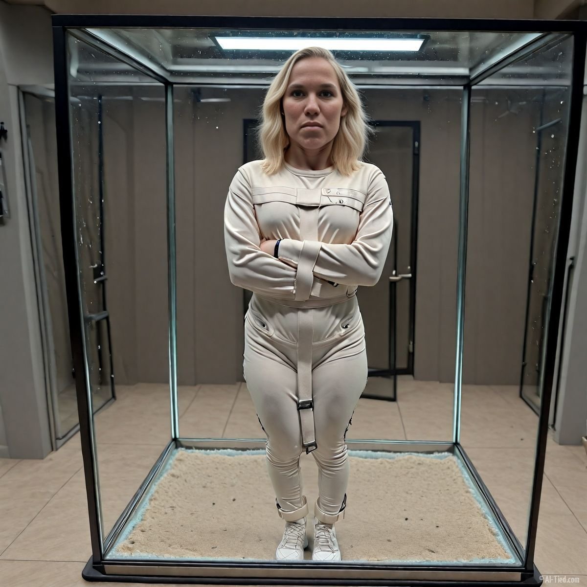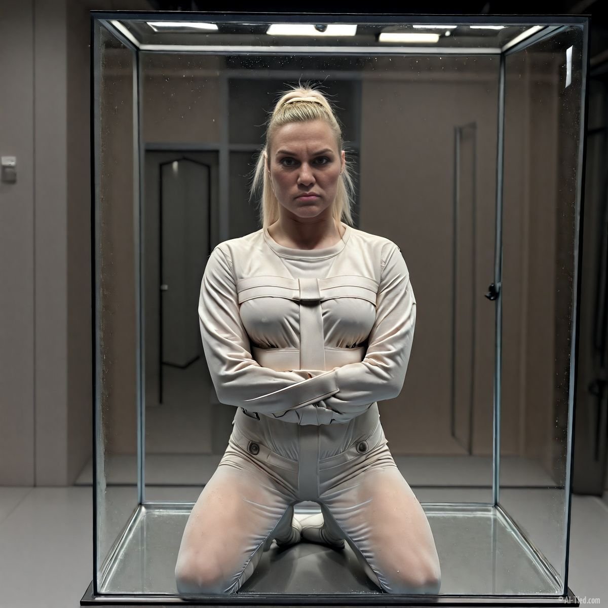 My head pounds as I come to, my body fighting before my vision clears. I am Jade, my blonde locks tangled, mile-long legs quivering, and massive, juicy tits, so huge they strain this white canvas straightjacket, nipples stiff against the rough material. They ripped off my panties, leaving my bare ass and sensitive pussy defenseless against this cruel strap. Years of gymnastics sculpted this body to perfection, every muscle honed for strength, but it is useless now, trapped by this fucking unyielding canvas and locked in a thick glass box, barely bigger than a dog kennel, just enough room to stand or take a few steps.