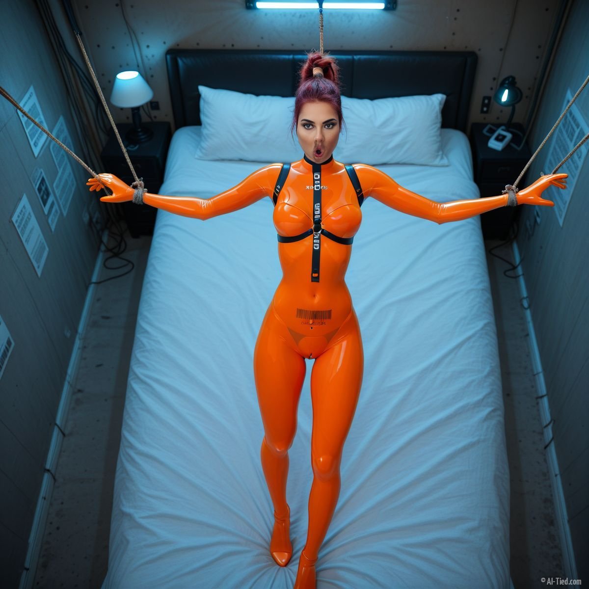 My orange latex skin stretches, every inch alive with unwanted arousal, betraying me in this grim shithole. The rusted bedframe bites my back, the dank air choking me. My legs are yanked open, ropes exposing me, my latex thighs gleaming, pulsing with heat I can’t fight. My soaked face-gape twitches, wet, ready against my will. I’m screaming inside, rage and despair colliding, dreading my name’s power. The room’s magic hums, ropes tightening, my barcode searing me. I hate being this bound, gleaming thing, my warped mouth a betrayal waiting to be triggered.