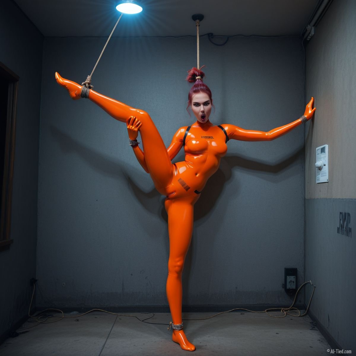 The ropes pull, my orange latex skin rippling, sending jolts of heat I can’t stop. My thighs gleam, latex amplifying every tug, every pulse, against my will. The barcode burns, marking me a fuckable thing. I’m pissed, despair drowning me, my body a traitor. The room’s oppressive magic owns me, turning me into a toy. I fight, but the ropes jerk, my latex skin catching every move, making me feel too raw, a gleaming object in this dark shithole. My warped mouth pulses, a constant reminder of my lost control.