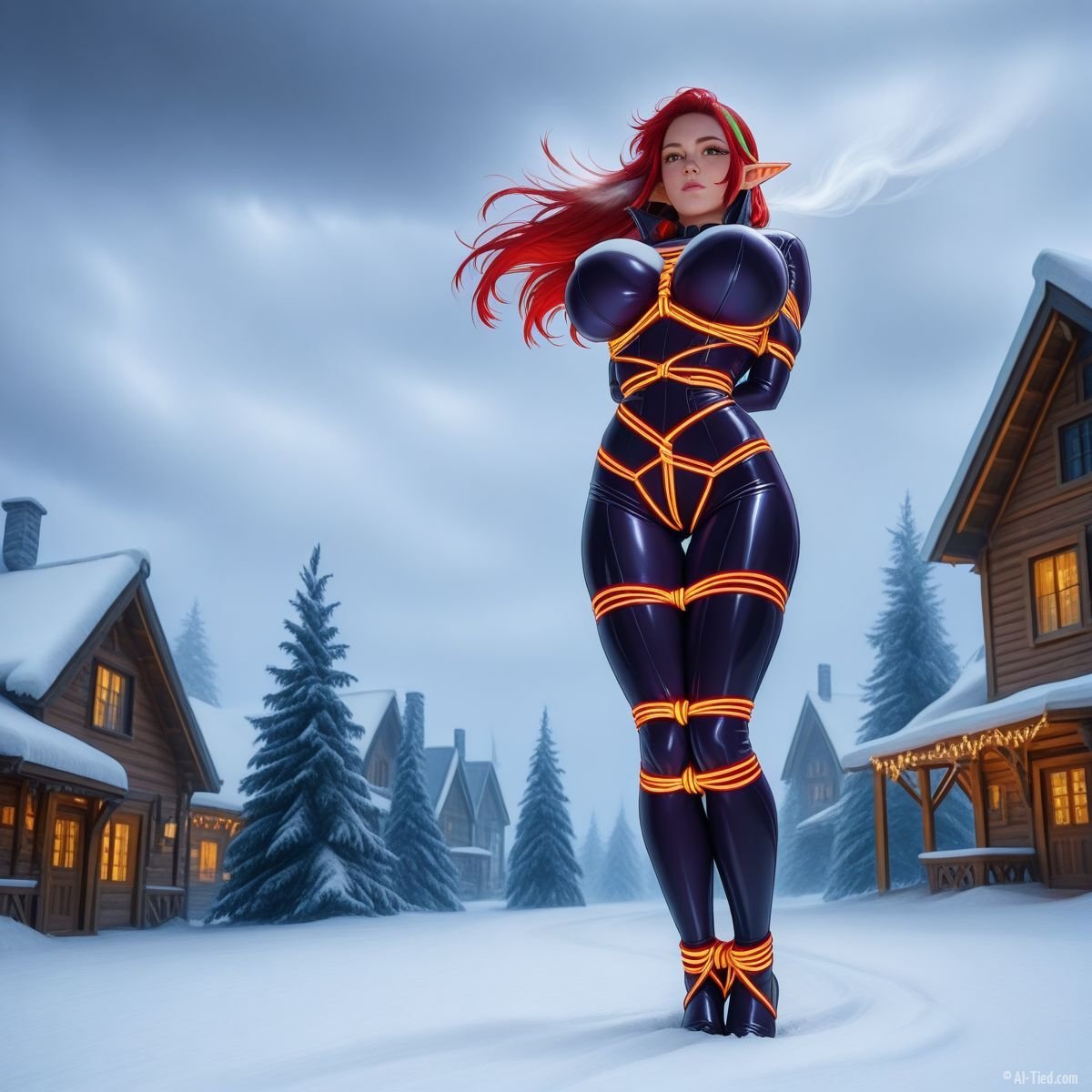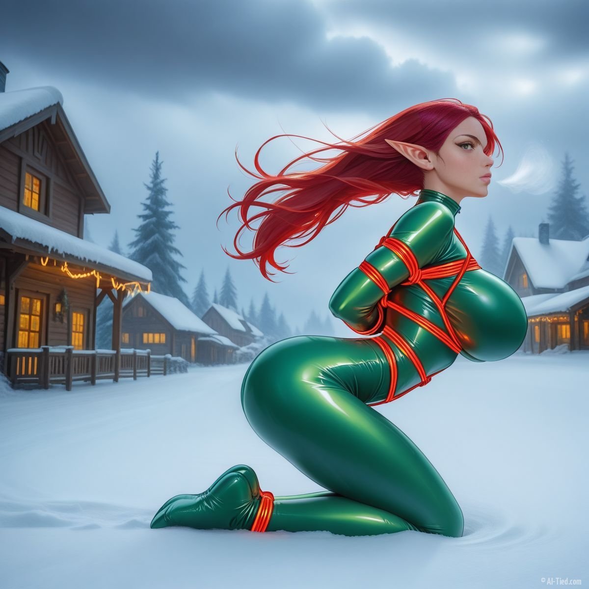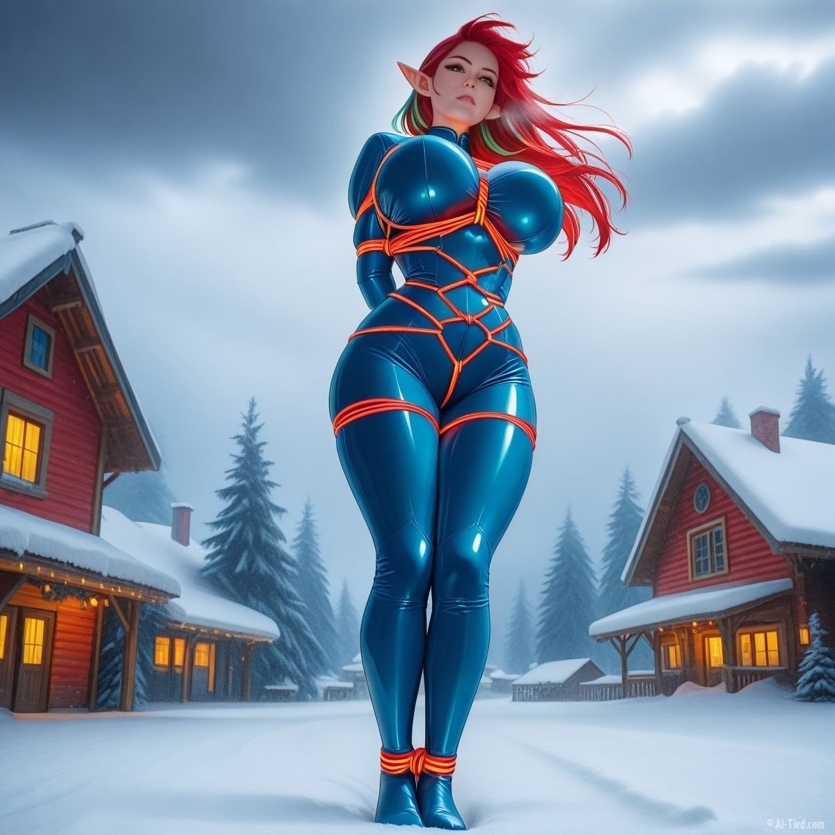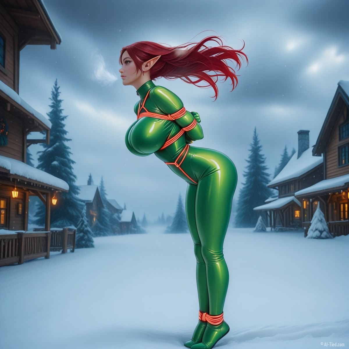 My body’s a battlefield of unrelieved agony and violent motion. Every villager’s climax is a fresh stab, the fused catsuit channeling their bliss into my nerves, burning and pressing against my tits and pussy, a reminder of my fucking greed. A third pulse, brilliant blue, sends my head tipping back, a desperate cry escaping as my muscles clench, chasing a peak that won’t come. The ropes jerk me into a standing pose, arms in front, the tight bindings biting deep as the suit dances through indigo, then violet, its rainbow cycle a constant lesson in my stupid misuse of Christmas magic. My breaths come in ragged pants, sweat beading despite the light snowfall, the suit’s magic making every inch of me hypersensitive. Another climax, red again, rips through me, the ropes snapping me into a hogtied pose, wrists and ankles bound together behind me, my vision blurring as I writhe, the bindings creaking with my futile struggles. “Fuck these elves,” I snarl, but my sarcasm’s cracking, anguish seeping in.