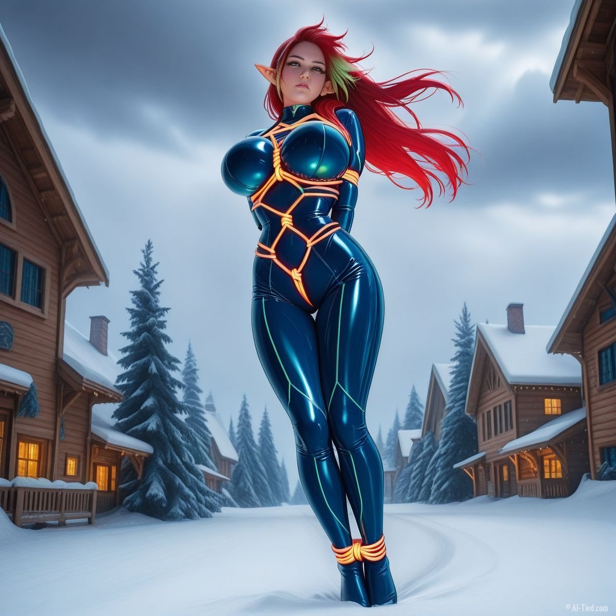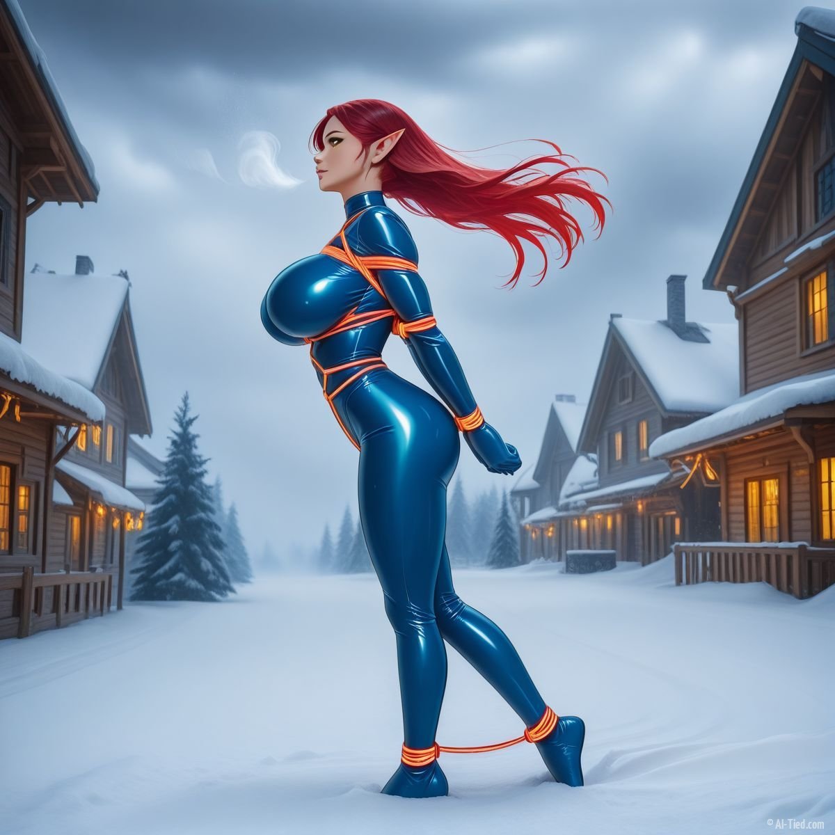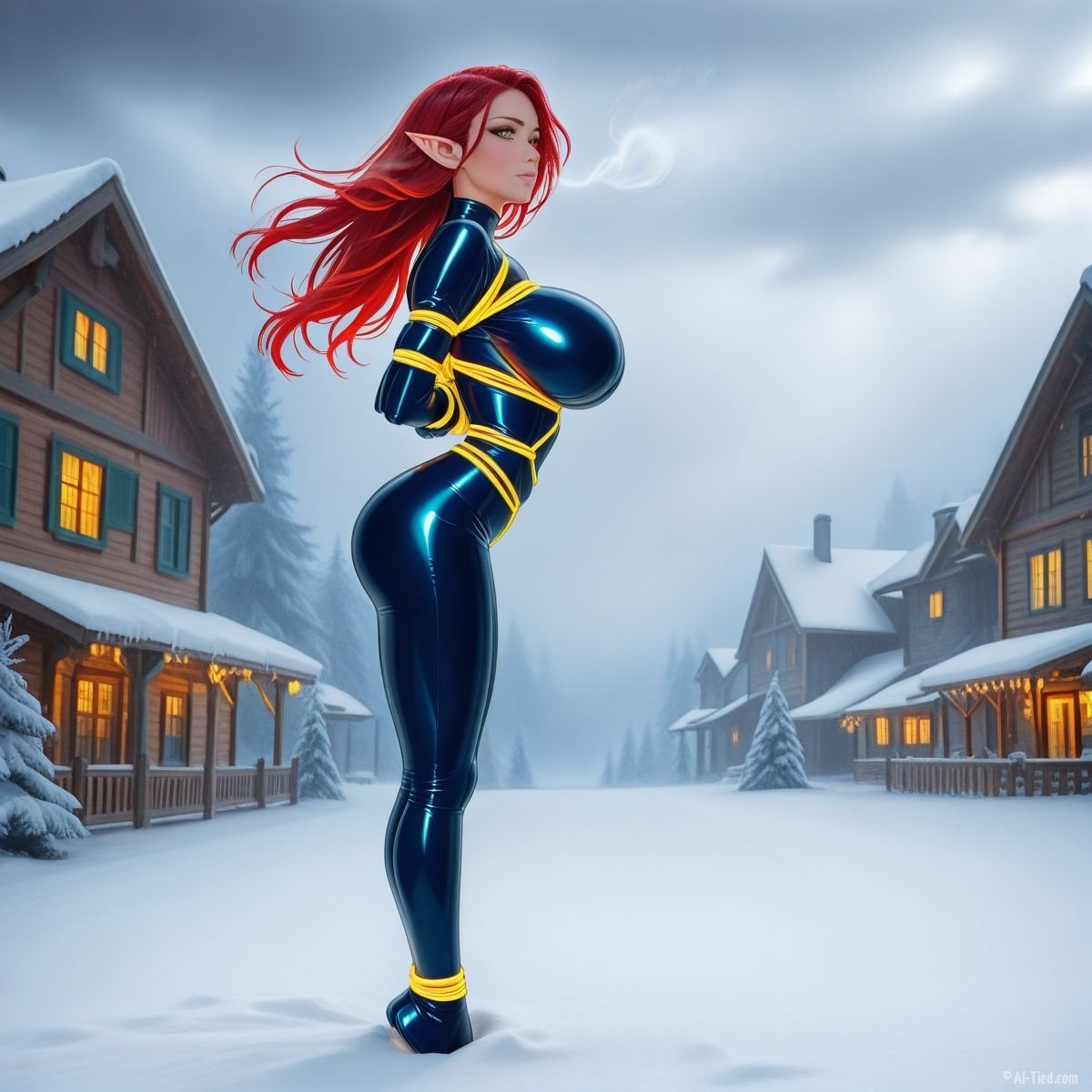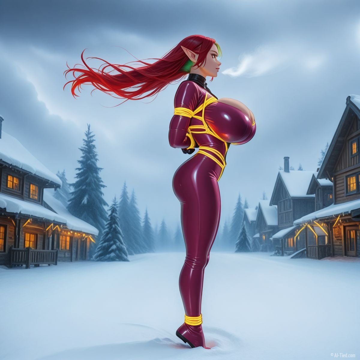 My body’s a battlefield of unrelieved agony and violent motion. Every villager’s climax is a fresh stab, the fused catsuit channeling their bliss into my nerves, burning and pressing against my tits and pussy, a reminder of my fucking greed. A third pulse, brilliant blue, sends my head tipping back, a desperate cry escaping as my muscles clench, chasing a peak that won’t come. The ropes jerk me into a standing pose, arms in front, the tight bindings biting deep as the suit dances through indigo, then violet, its rainbow cycle a constant lesson in my stupid misuse of Christmas magic. My breaths come in ragged pants, sweat beading despite the light snowfall, the suit’s magic making every inch of me hypersensitive. Another climax, red again, rips through me, the ropes snapping me into a hogtied pose, wrists and ankles bound together behind me, my vision blurring as I writhe, the bindings creaking with my futile struggles. “Fuck these elves,” I snarl, but my sarcasm’s cracking, anguish seeping in.