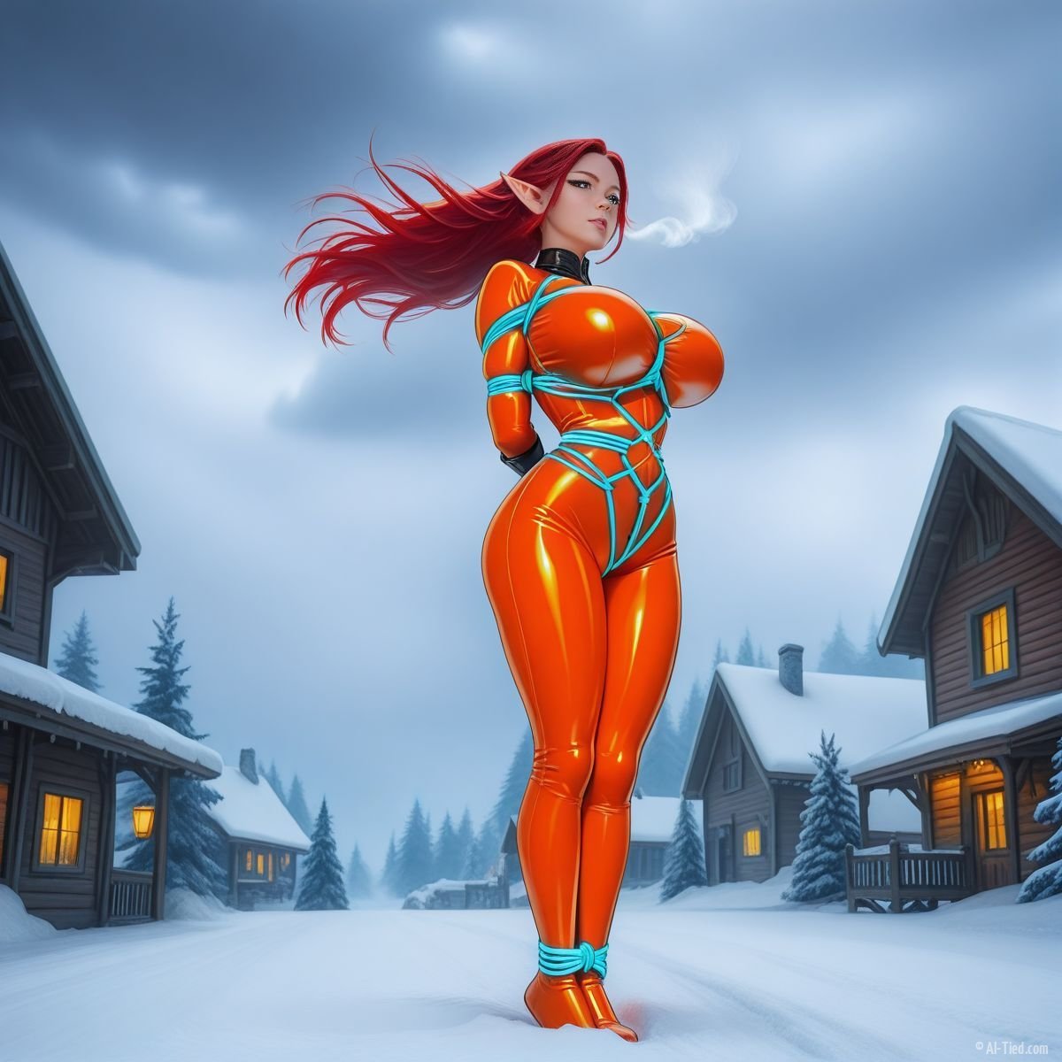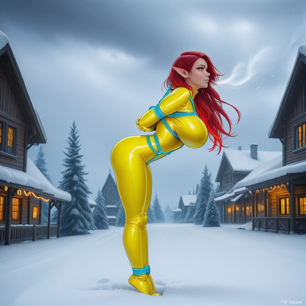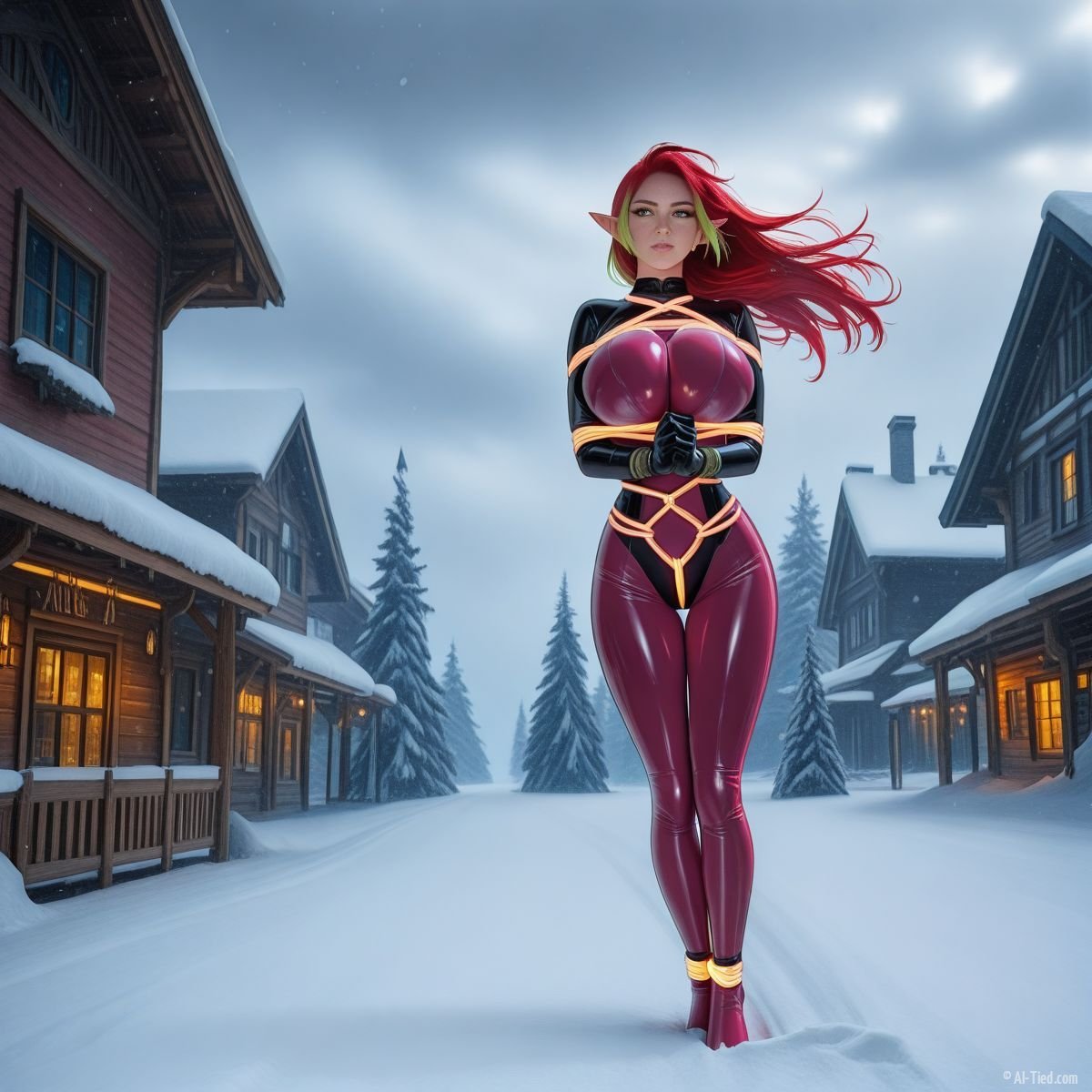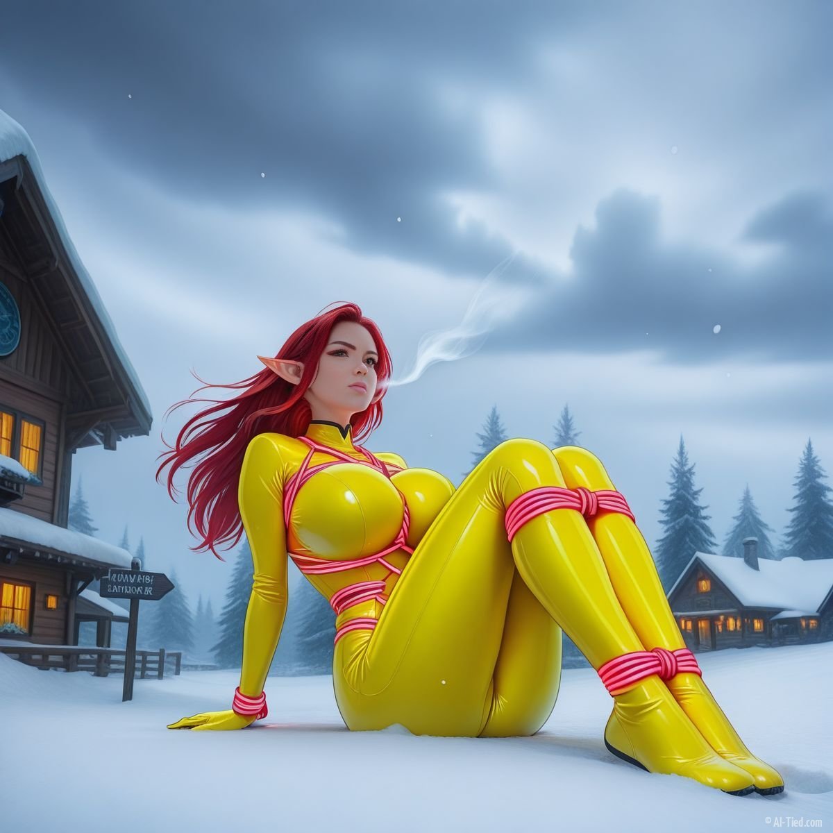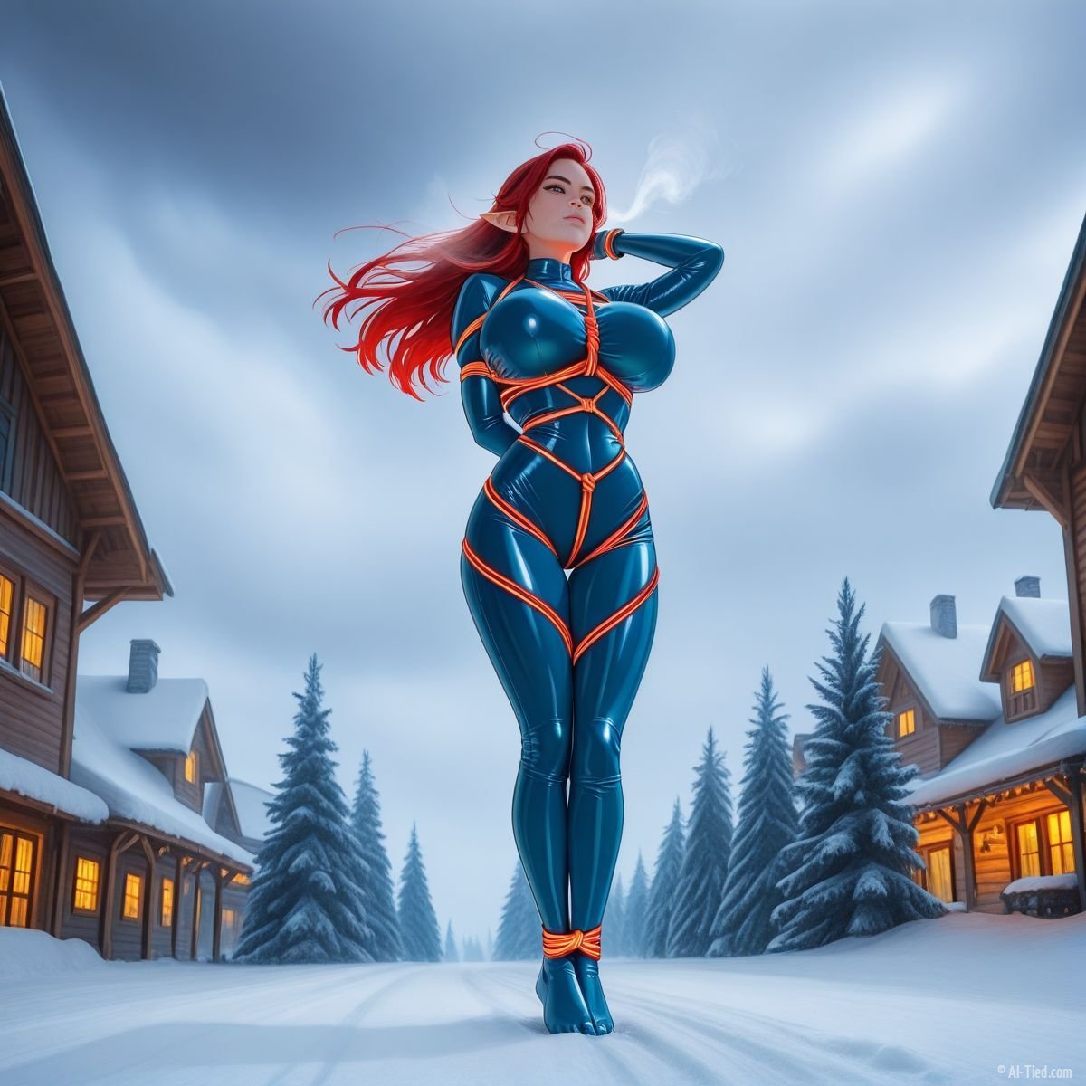 My body’s a battlefield of unrelieved agony and violent motion. Every villager’s climax is a fresh stab, the fused catsuit channeling their bliss into my nerves, burning and pressing against my tits and pussy, a reminder of my fucking greed. A third pulse, brilliant blue, sends my head tipping back, a desperate cry escaping as my muscles clench, chasing a peak that won’t come. The ropes jerk me into a standing pose, arms in front, the tight bindings biting deep as the suit dances through indigo, then violet, its rainbow cycle a constant lesson in my stupid misuse of Christmas magic. My breaths come in ragged pants, sweat beading despite the light snowfall, the suit’s magic making every inch of me hypersensitive. Another climax, red again, rips through me, the ropes snapping me into a hogtied pose, wrists and ankles bound together behind me, my vision blurring as I writhe, the bindings creaking with my futile struggles. “Fuck these elves,” I snarl, but my sarcasm’s cracking, anguish seeping in.