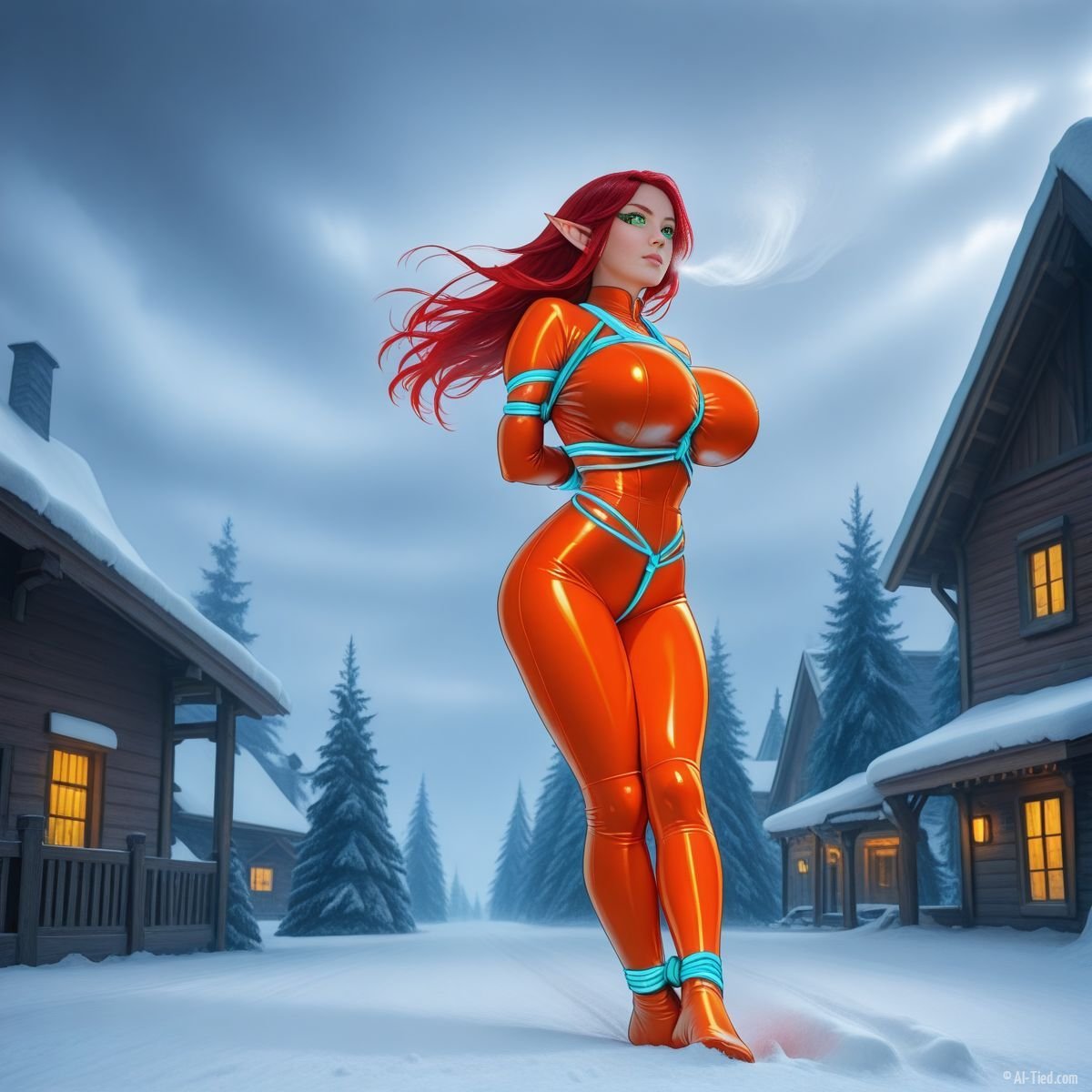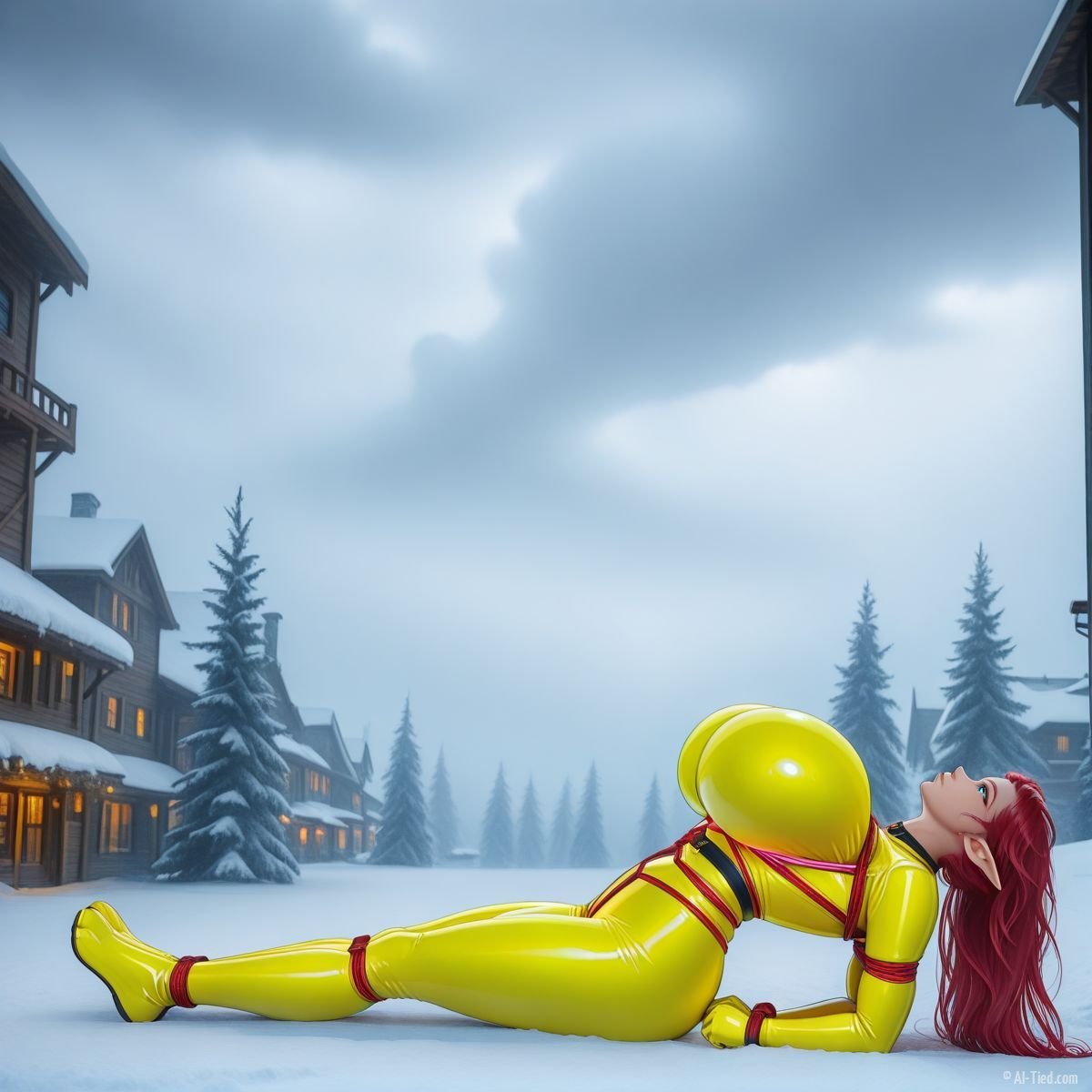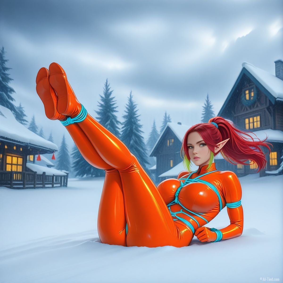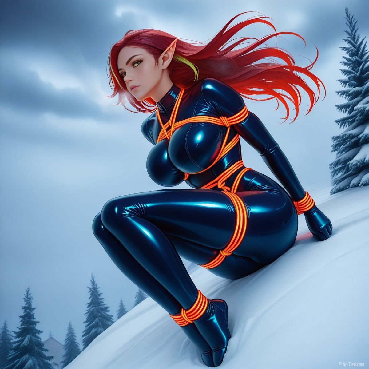 My body’s a battlefield of unrelieved agony and violent motion. Every villager’s climax is a fresh stab, the fused catsuit channeling their bliss into my nerves, burning and pressing against my tits and pussy, a reminder of my fucking greed. A third pulse, brilliant blue, sends my head tipping back, a desperate cry escaping as my muscles clench, chasing a peak that won’t come. The ropes jerk me into a standing pose, arms in front, the tight bindings biting deep as the suit dances through indigo, then violet, its rainbow cycle a constant lesson in my stupid misuse of Christmas magic. My breaths come in ragged pants, sweat beading despite the light snowfall, the suit’s magic making every inch of me hypersensitive. Another climax, red again, rips through me, the ropes snapping me into a hogtied pose, wrists and ankles bound together behind me, my vision blurring as I writhe, the bindings creaking with my futile struggles. “Fuck these elves,” I snarl, but my sarcasm’s cracking, anguish seeping in.