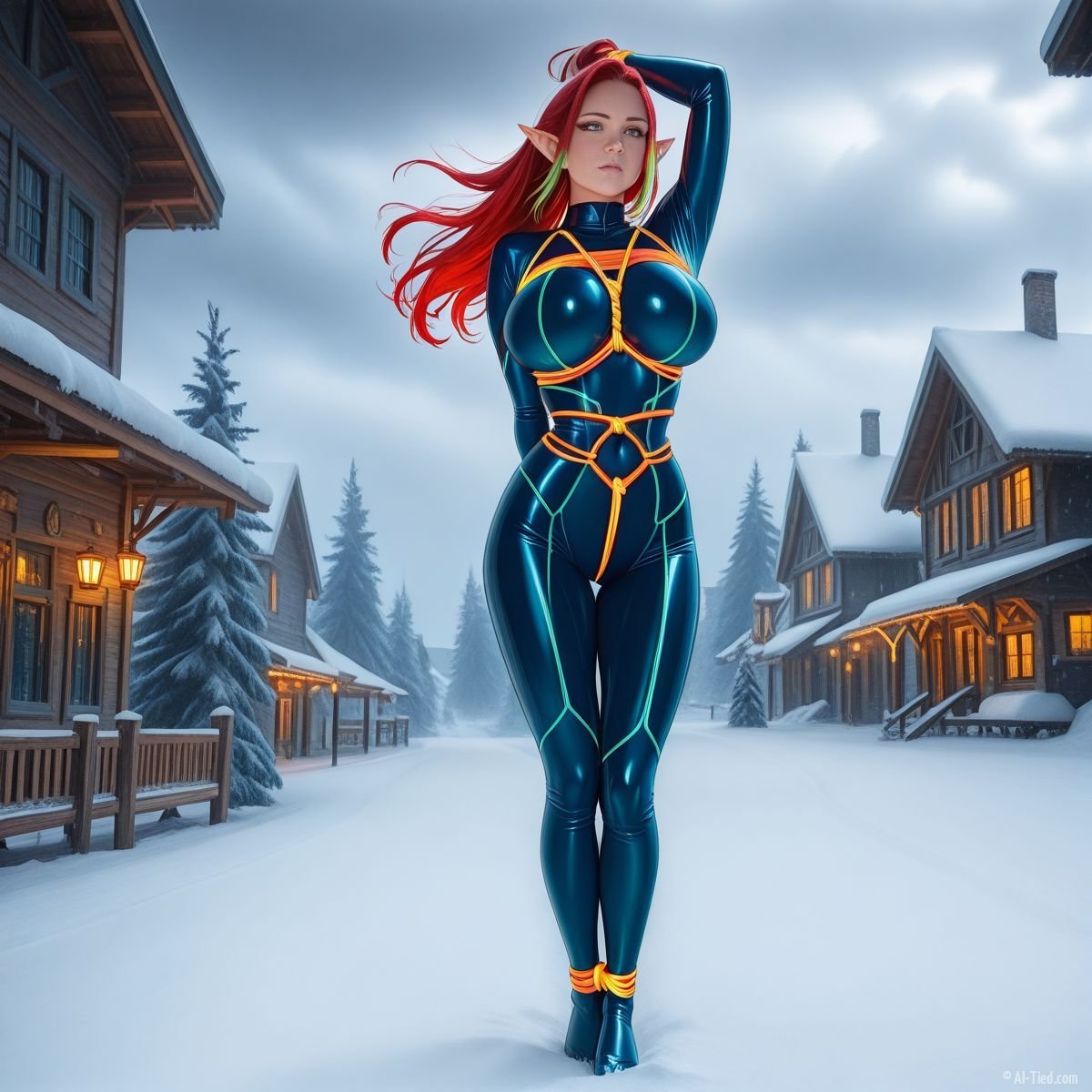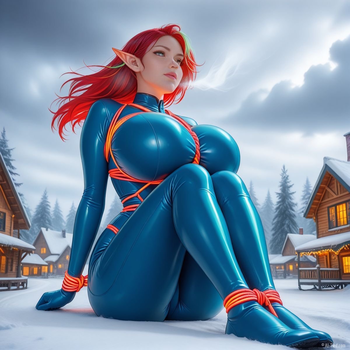 “Taylor, you selfish elf,” thunders the council, their words woven into the frost-laden air, ever-present bastards guarding Christmas magic. “Three strikes for twisting our magic for your own gain. For the rest of December, you’ll pay on our square’s sidewalk.” My heart thuds as a magical pulse rips through the alley, the leotard dissolving, reforming as a skintight catsuit, fused to my body, replacing my skin entirely. The suit burns and presses against my tits and pussy, binding me to the village’s pulse. “This catsuit will cycle through the rainbow, red, orange, yellow, green, blue, indigo, violet, with every climax in the village, teaching you selflessness. You’ll feel their pleasure, but never your own.” Normal ropes, shimmering with enchanted Christmas magic, snake from the ground, coiling tightly around my wrists behind my back and ankles together, yanking me to stand on the sidewalk in the village square’s center. Bound under the aurora’s kaleidoscopic glow, I’m a wriggling spectacle, the suit’s surface catching every flicker of light. “Fucking perfect,” I spit, sarcasm dripping.
