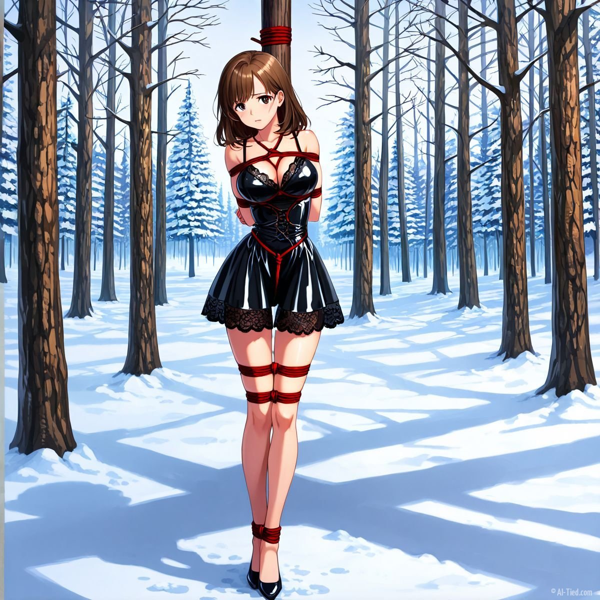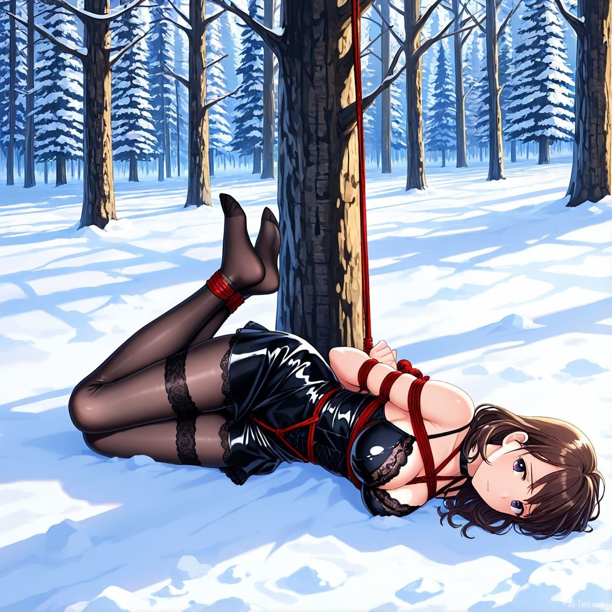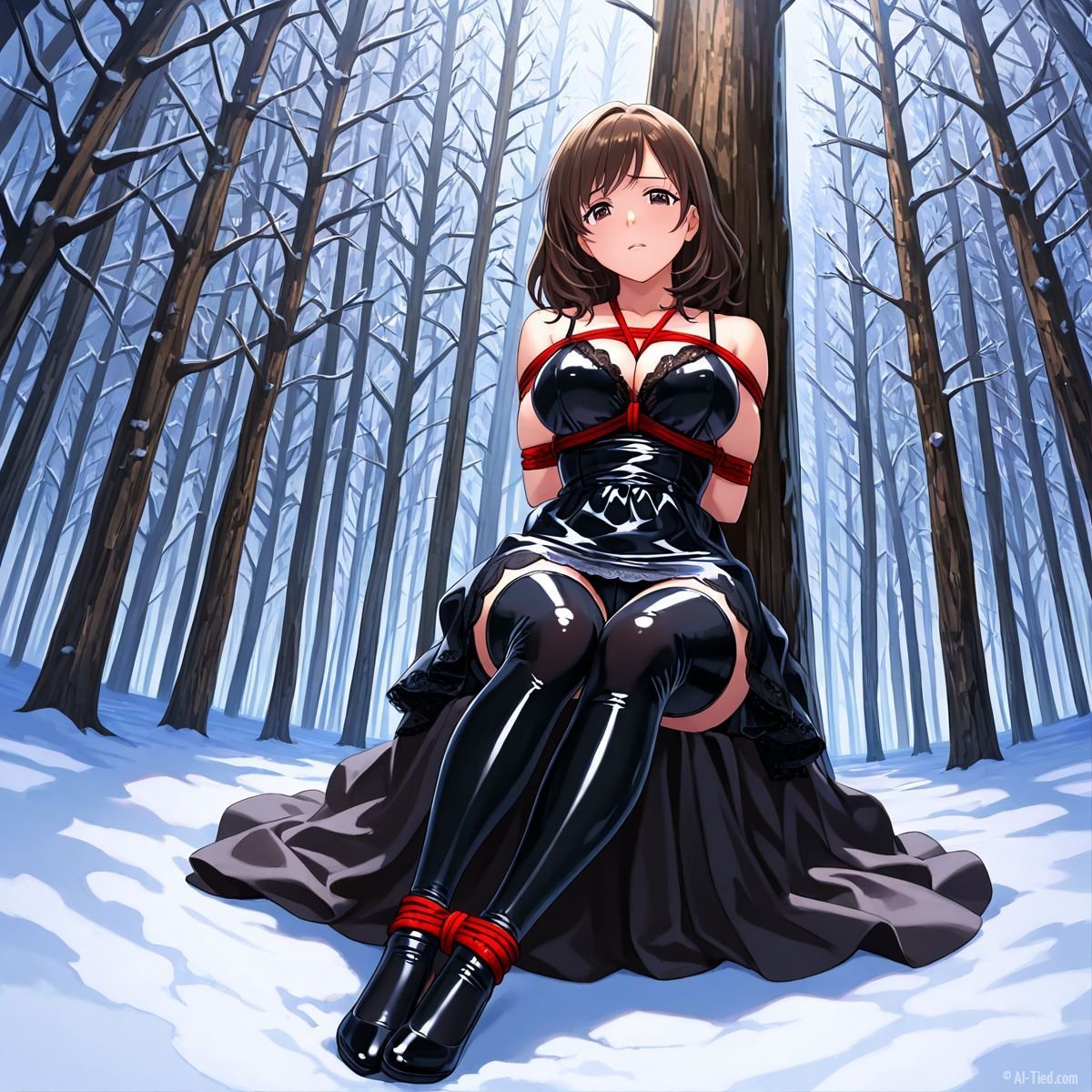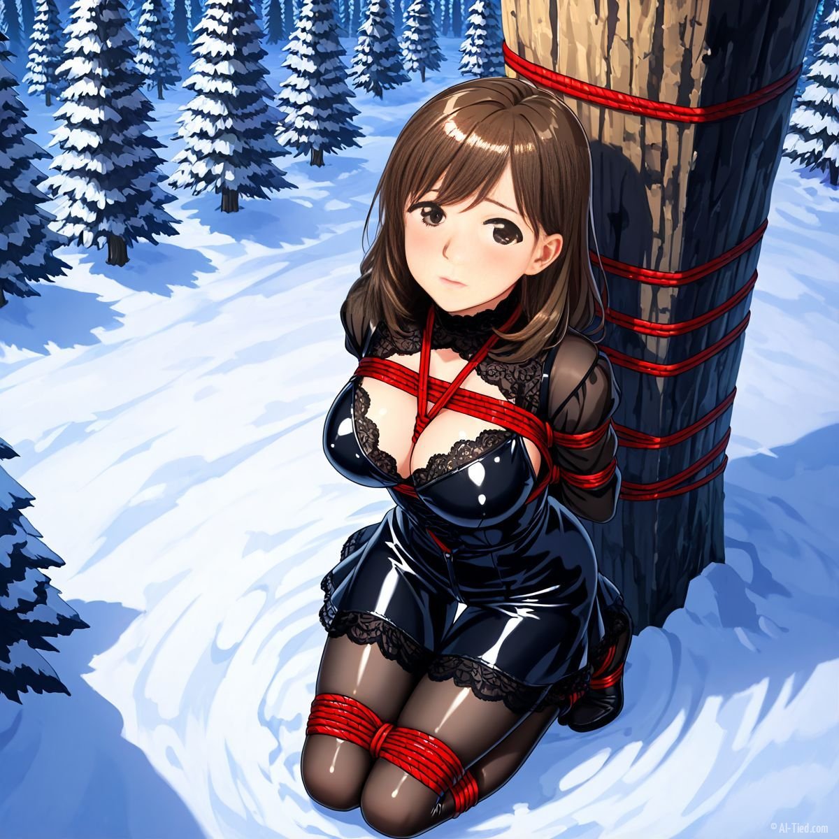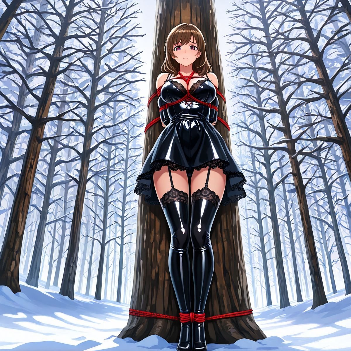 Briar stood with her back pressed hard against the rough bark of the tall pine, red ropes looped tight around her torso and the trunk, pinning her in place. The shiny black latex teddy hugged every inch of her thin frame, stretching taut over her full chest, the material so thin it offered nothing against the winter bite. Snow covered the forest floor in a thick, untouched blanket, daylight filtering through bare branches and casting cold light across her exposed skin. Her wrists were bound tight behind her back, red cords digging deep into her flesh, forcing her shoulders to pull back and push her breasts forward. More rope cinched her ankles together, keeping her legs pressed close, no room to step or run.