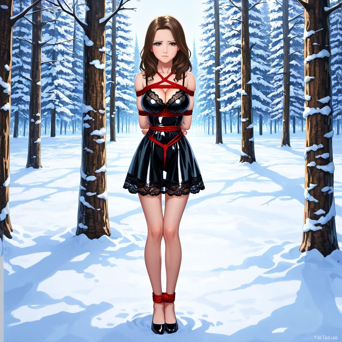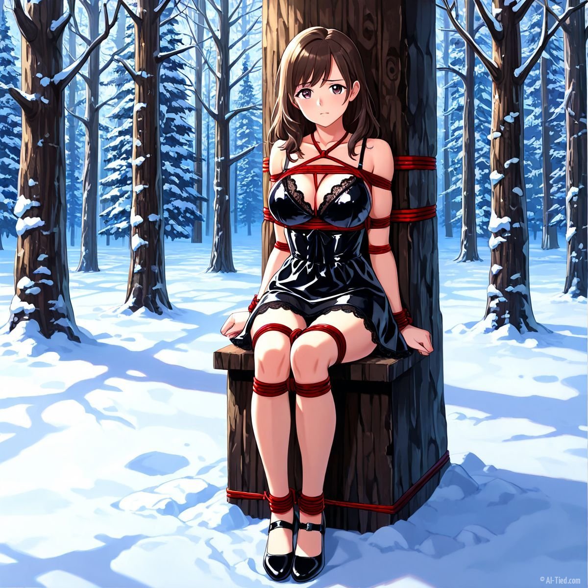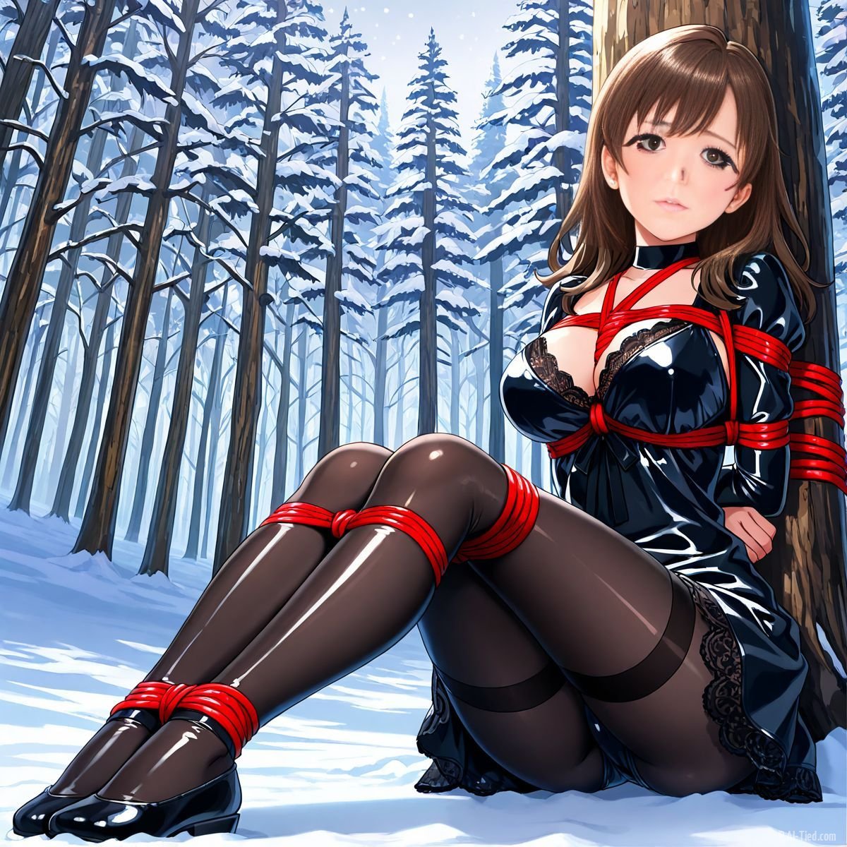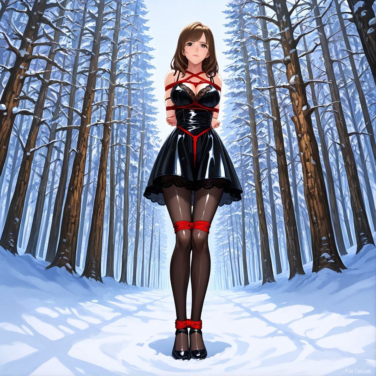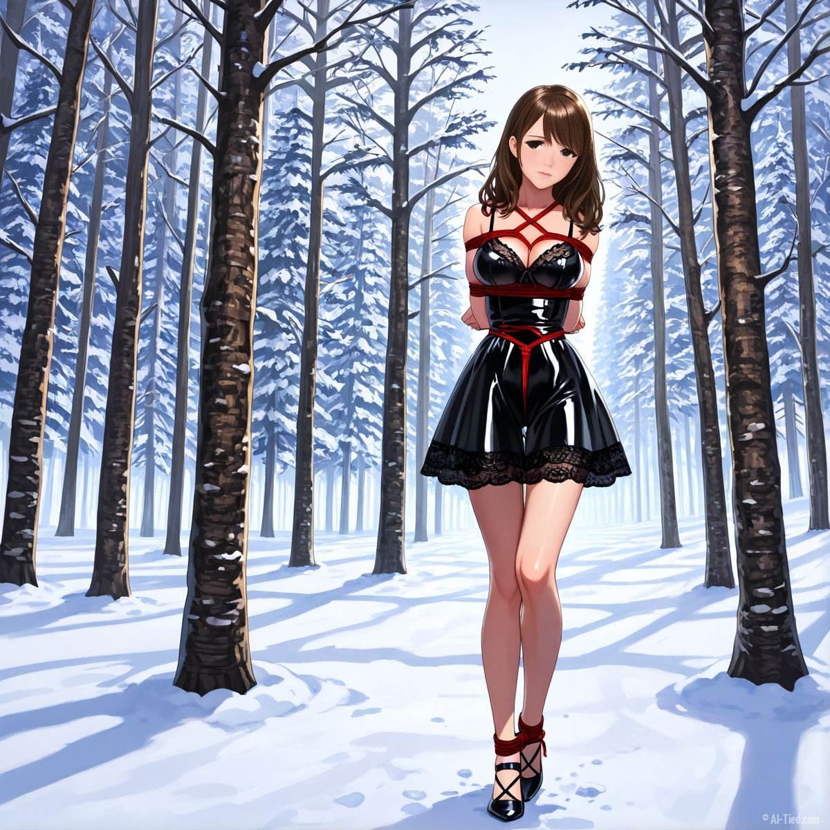 Briar stood with her back pressed hard against the rough bark of the tall pine, red ropes looped tight around her torso and the trunk, pinning her in place. The shiny black latex teddy hugged every inch of her thin frame, stretching taut over her full chest, the material so thin it offered nothing against the winter bite. Snow covered the forest floor in a thick, untouched blanket, daylight filtering through bare branches and casting cold light across her exposed skin. Her wrists were bound tight behind her back, red cords digging deep into her flesh, forcing her shoulders to pull back and push her breasts forward. More rope cinched her ankles together, keeping her legs pressed close, no room to step or run.