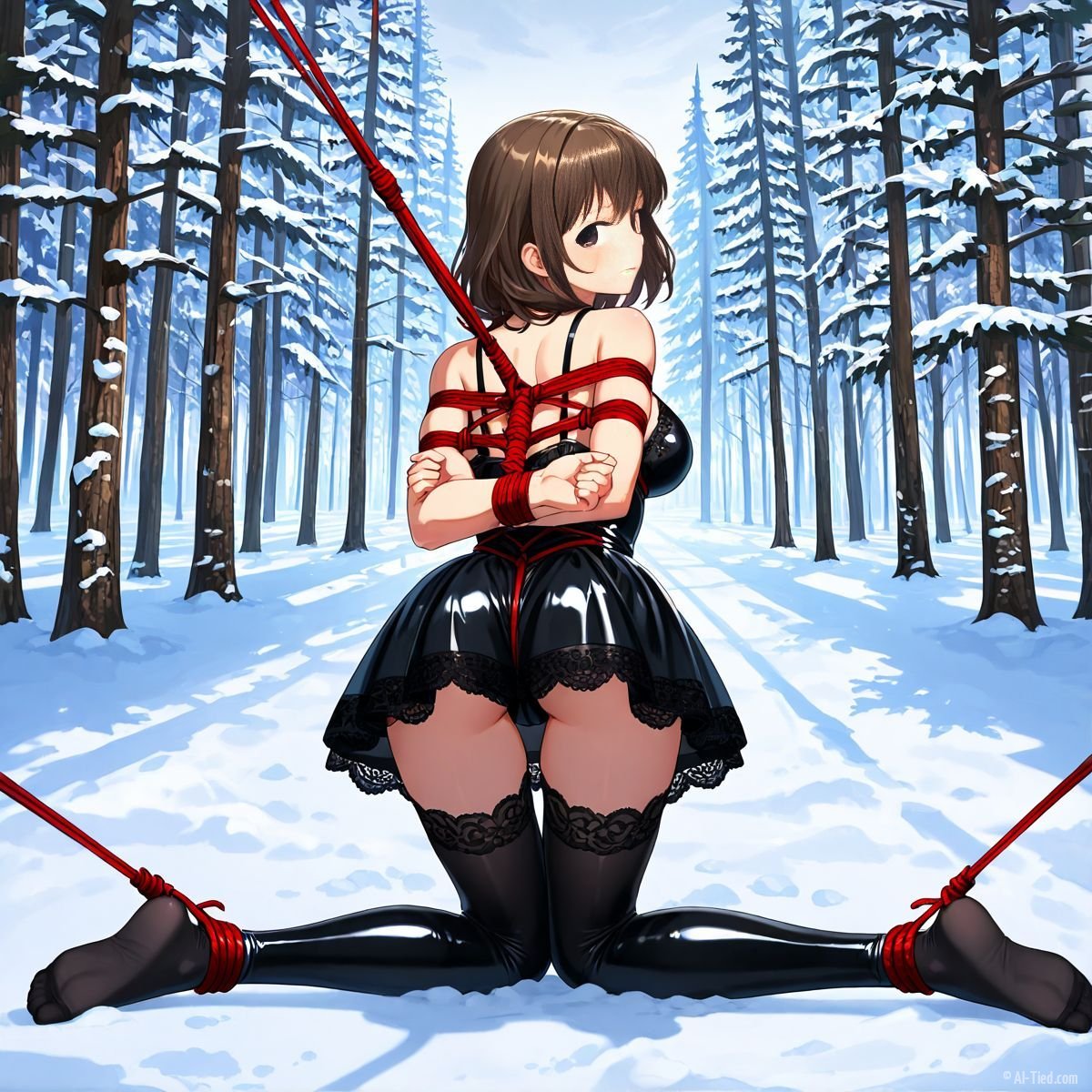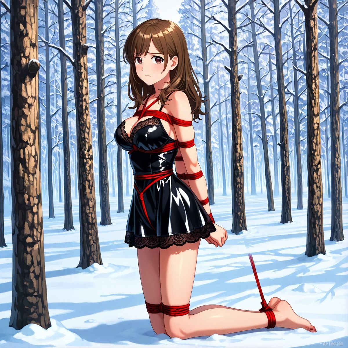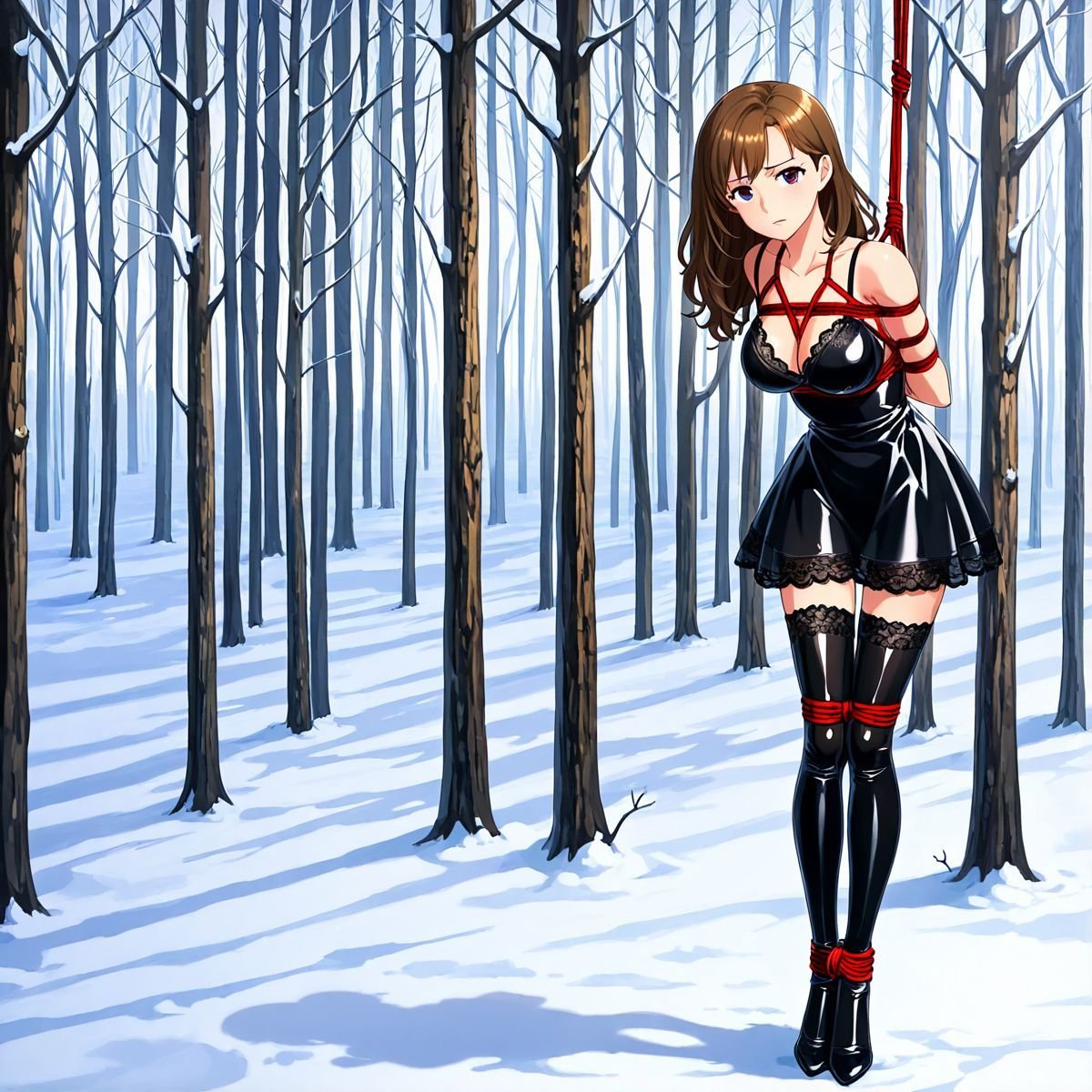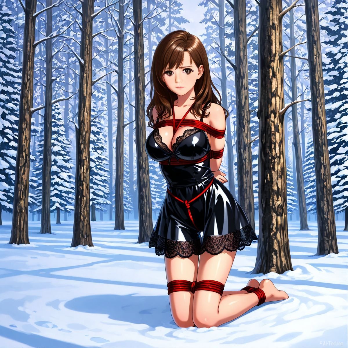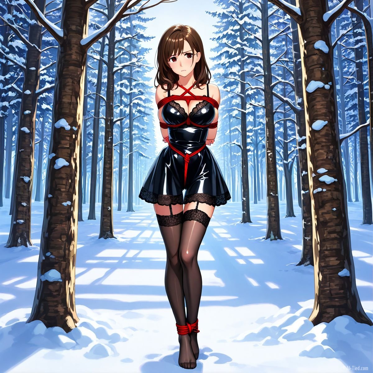 Briar stood with her back pressed hard against the rough bark of the tall pine, red ropes looped tight around her torso and the trunk, pinning her in place. The shiny black latex teddy hugged every inch of her thin frame, stretching taut over her full chest, the material so thin it offered nothing against the winter bite. Snow covered the forest floor in a thick, untouched blanket, daylight filtering through bare branches and casting cold light across her exposed skin. Her wrists were bound tight behind her back, red cords digging deep into her flesh, forcing her shoulders to pull back and push her breasts forward. More rope cinched her ankles together, keeping her legs pressed close, no room to step or run.