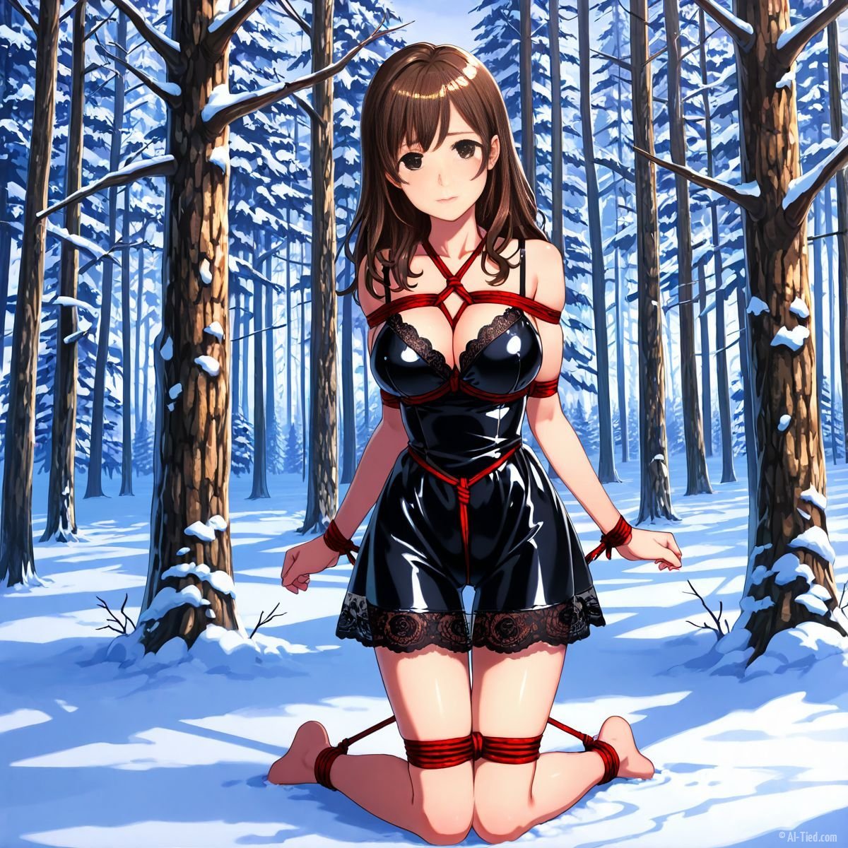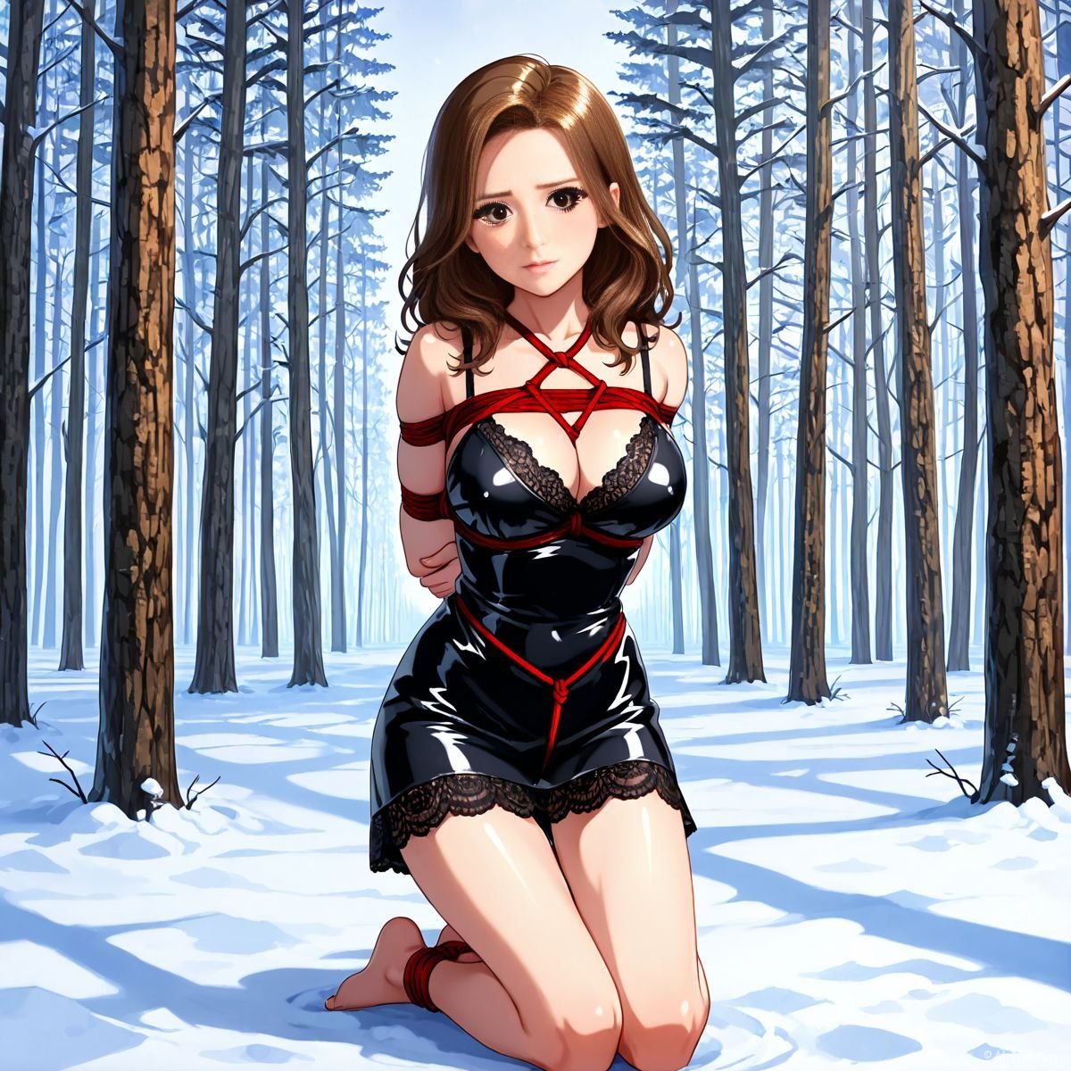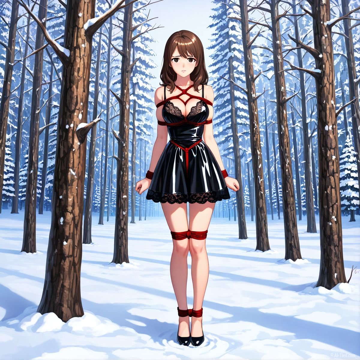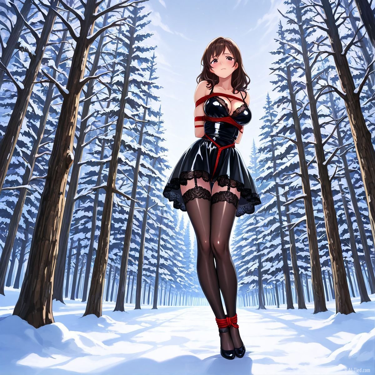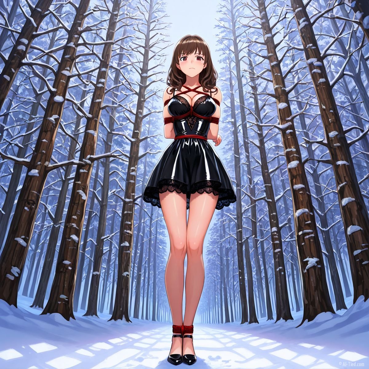 Briar stood with her back pressed hard against the rough bark of the tall pine, red ropes looped tight around her torso and the trunk, pinning her in place. The shiny black latex teddy hugged every inch of her thin frame, stretching taut over her full chest, the material so thin it offered nothing against the winter bite. Snow covered the forest floor in a thick, untouched blanket, daylight filtering through bare branches and casting cold light across her exposed skin. Her wrists were bound tight behind her back, red cords digging deep into her flesh, forcing her shoulders to pull back and push her breasts forward. More rope cinched her ankles together, keeping her legs pressed close, no room to step or run.
