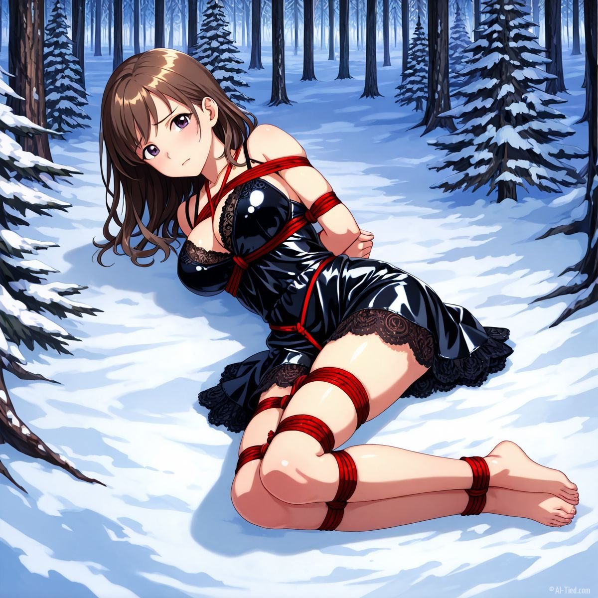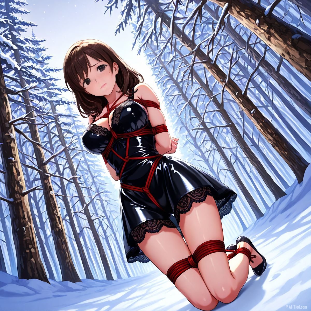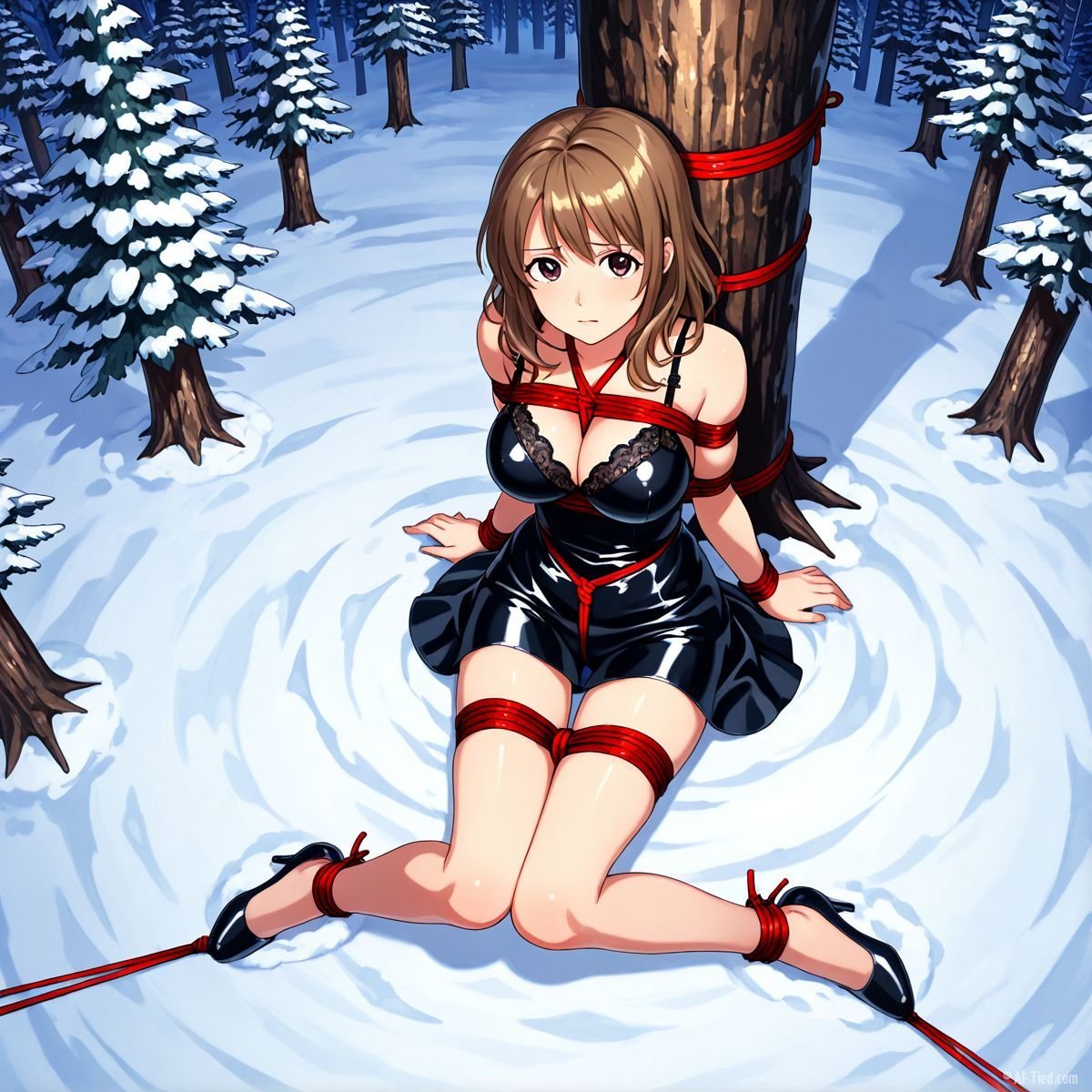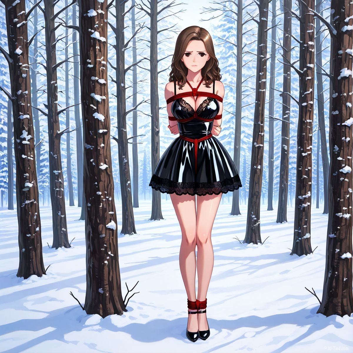 Briar stood with her back pressed hard against the rough bark of the tall pine, red ropes looped tight around her torso and the trunk, pinning her in place. The shiny black latex teddy hugged every inch of her thin frame, stretching taut over her full chest, the material so thin it offered nothing against the winter bite. Snow covered the forest floor in a thick, untouched blanket, daylight filtering through bare branches and casting cold light across her exposed skin. Her wrists were bound tight behind her back, red cords digging deep into her flesh, forcing her shoulders to pull back and push her breasts forward. More rope cinched her ankles together, keeping her legs pressed close, no room to step or run.