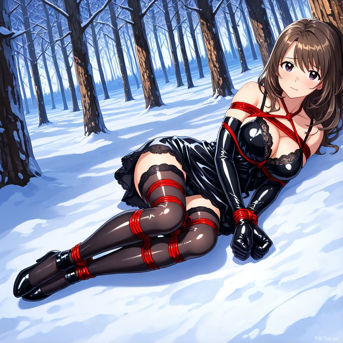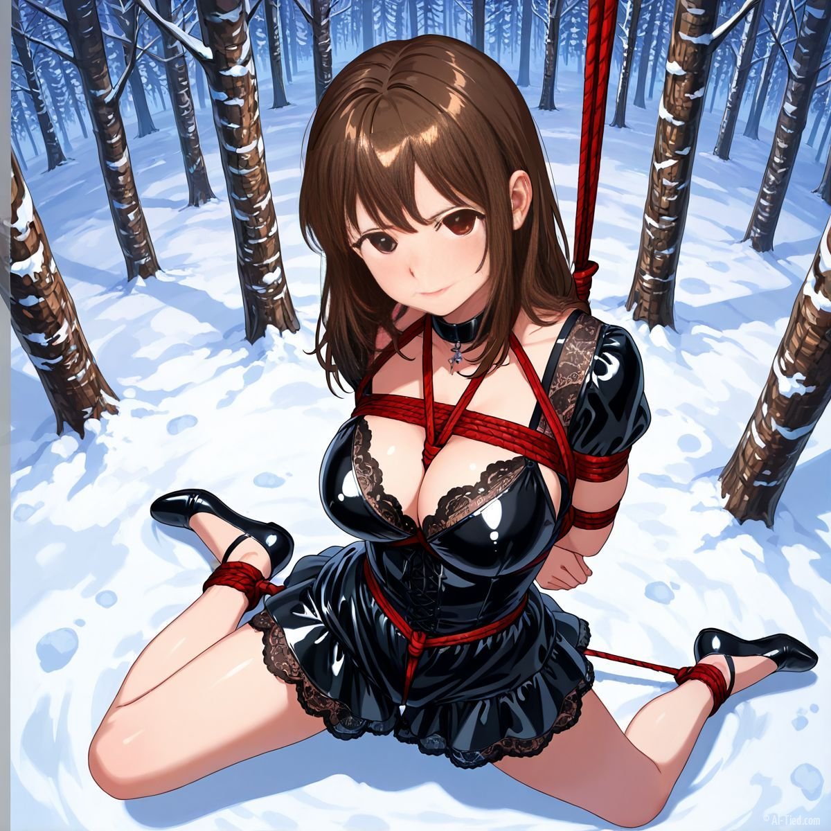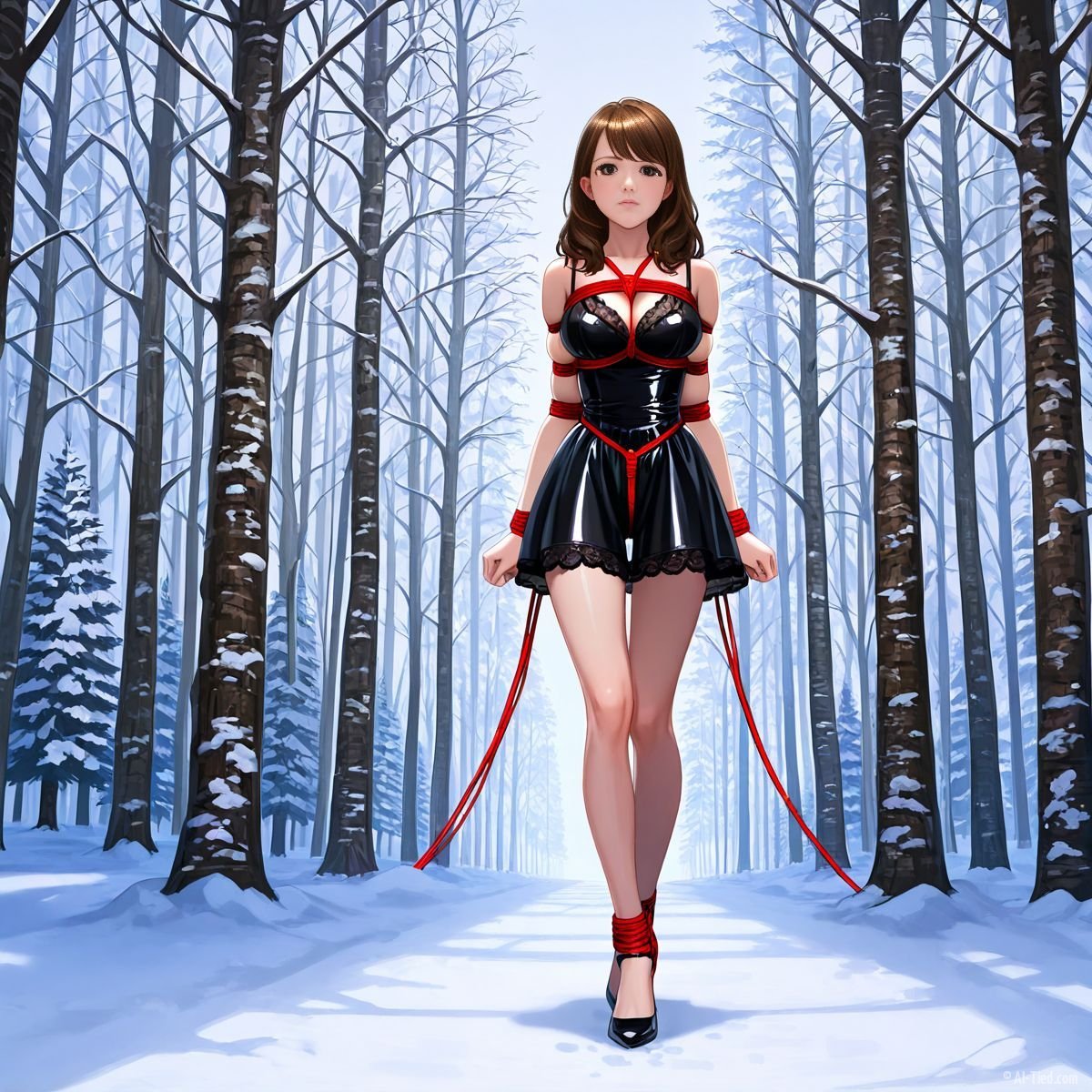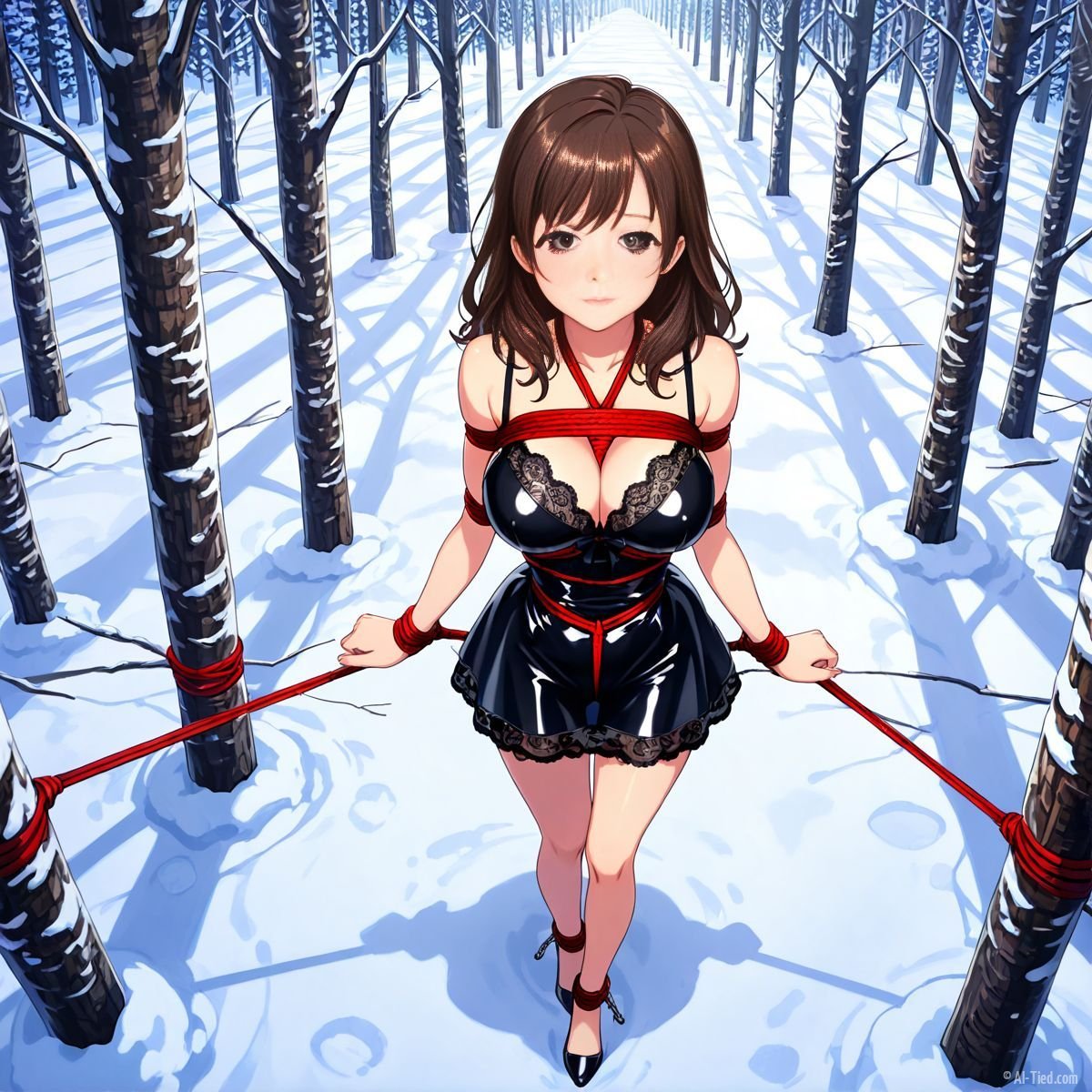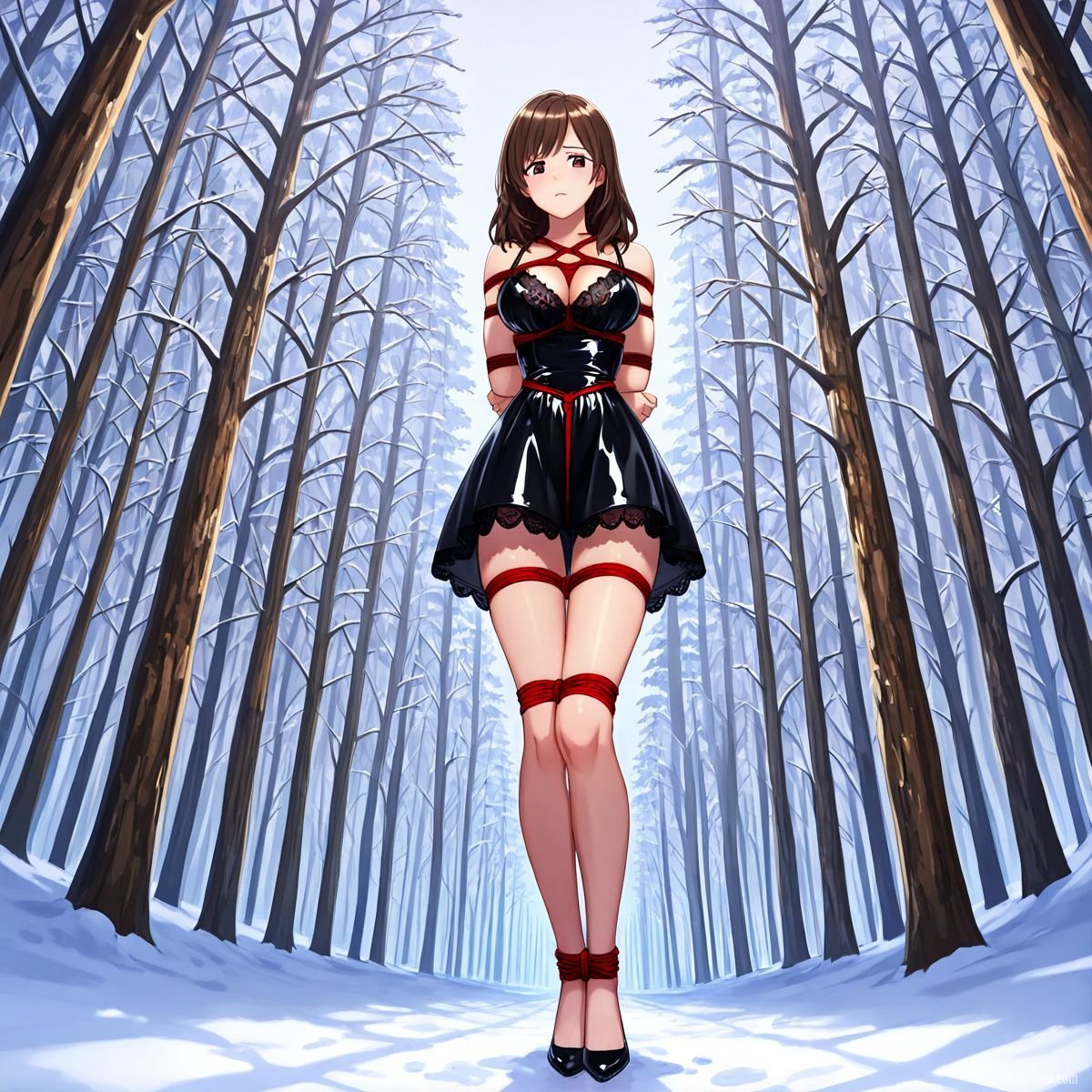 Briar stood with her back pressed hard against the rough bark of the tall pine, red ropes looped tight around her torso and the trunk, pinning her in place. The shiny black latex teddy hugged every inch of her thin frame, stretching taut over her full chest, the material so thin it offered nothing against the winter bite. Snow covered the forest floor in a thick, untouched blanket, daylight filtering through bare branches and casting cold light across her exposed skin. Her wrists were bound tight behind her back, red cords digging deep into her flesh, forcing her shoulders to pull back and push her breasts forward. More rope cinched her ankles together, keeping her legs pressed close, no room to step or run.