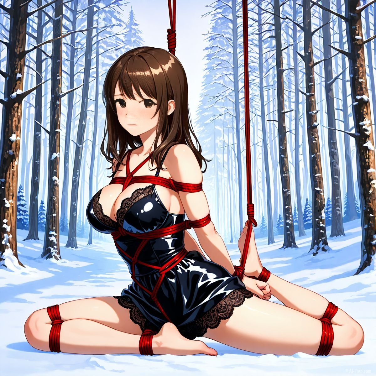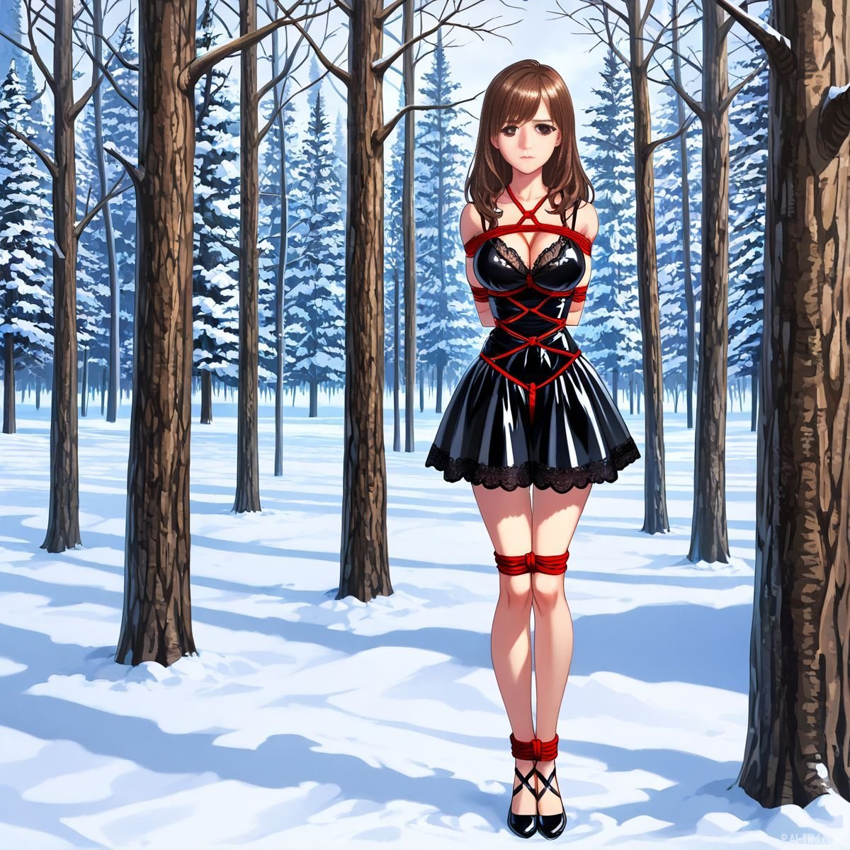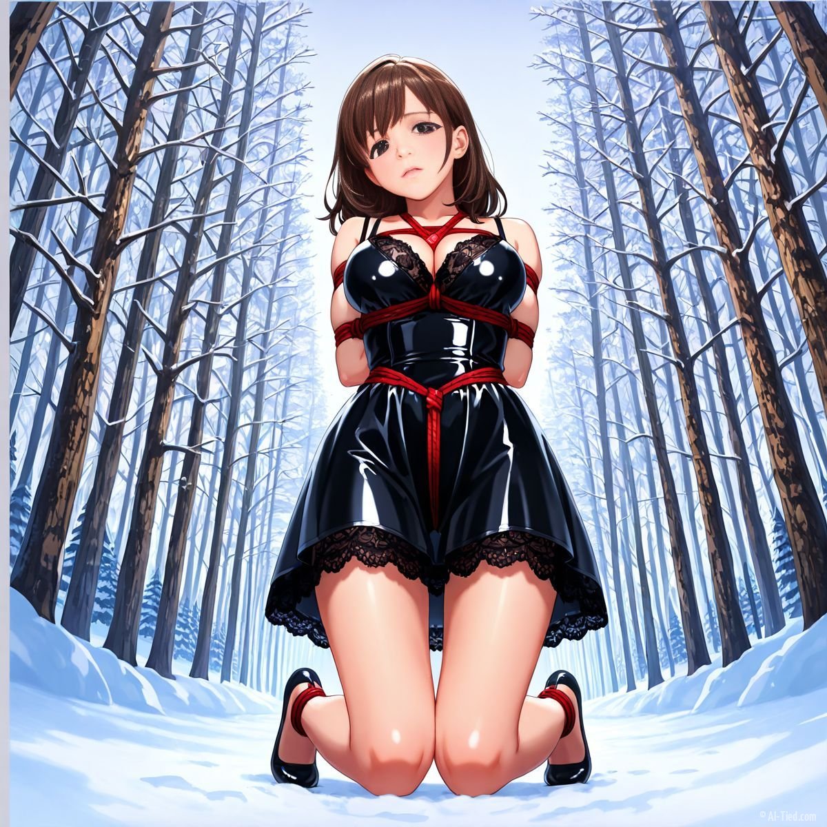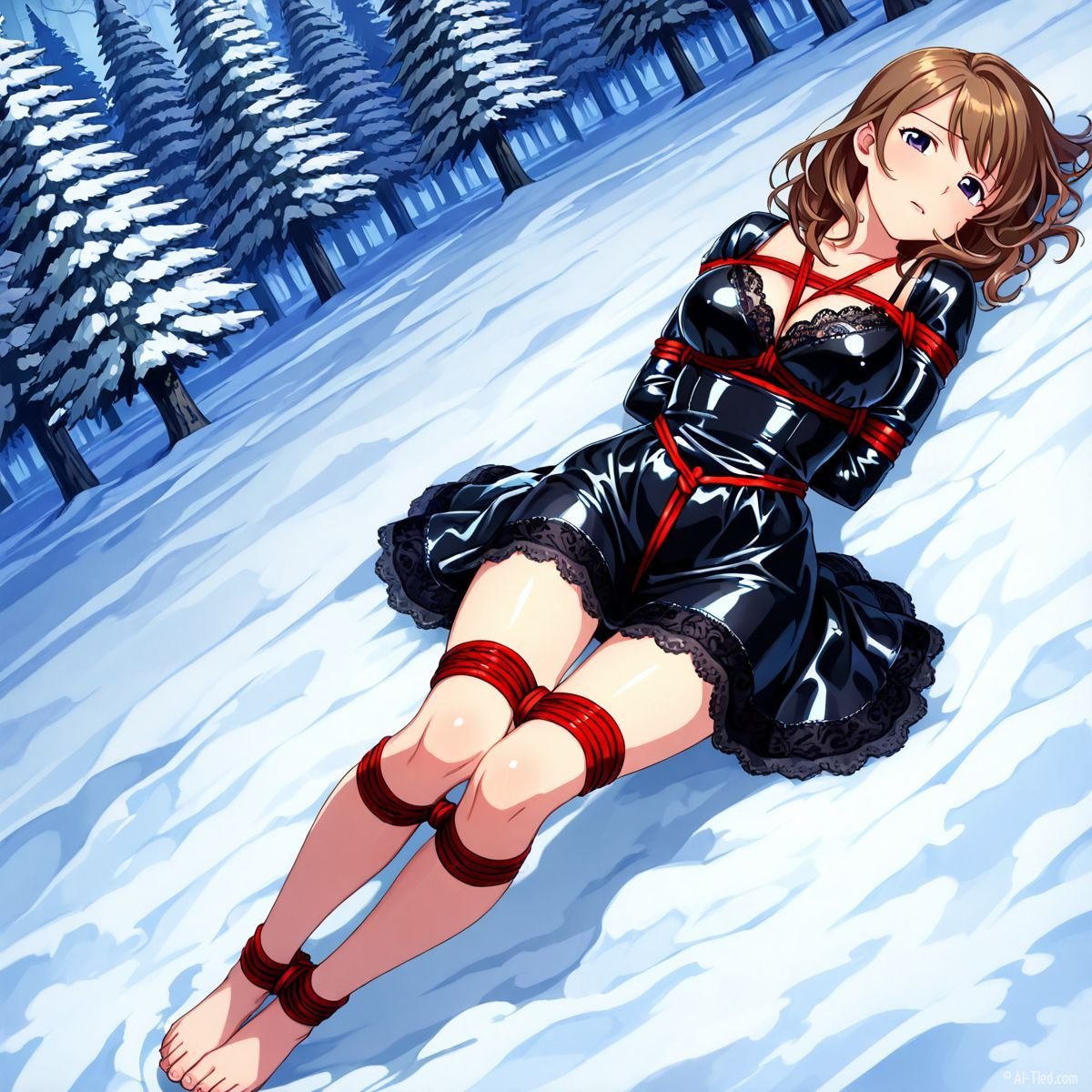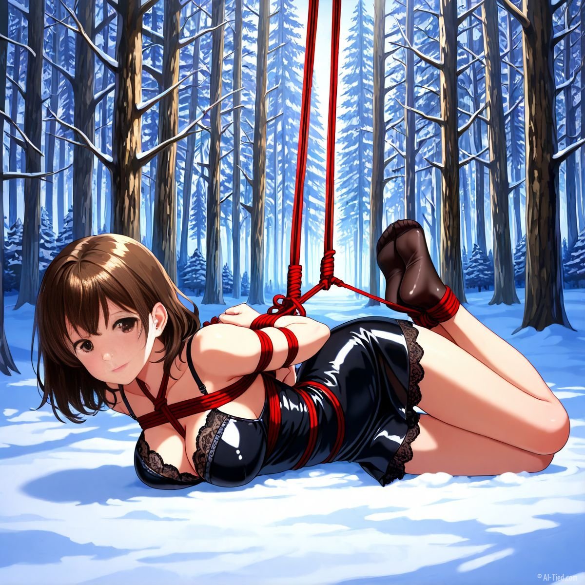 Briar stood with her back pressed hard against the rough bark of the tall pine, red ropes looped tight around her torso and the trunk, pinning her in place. The shiny black latex teddy hugged every inch of her thin frame, stretching taut over her full chest, the material so thin it offered nothing against the winter bite. Snow covered the forest floor in a thick, untouched blanket, daylight filtering through bare branches and casting cold light across her exposed skin. Her wrists were bound tight behind her back, red cords digging deep into her flesh, forcing her shoulders to pull back and push her breasts forward. More rope cinched her ankles together, keeping her legs pressed close, no room to step or run.