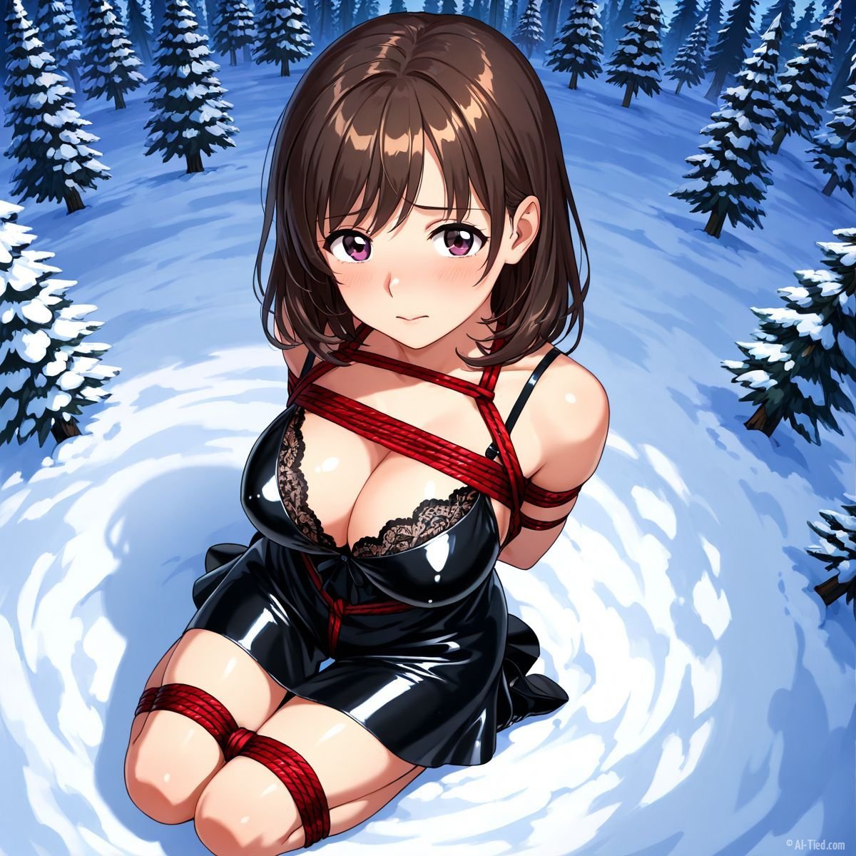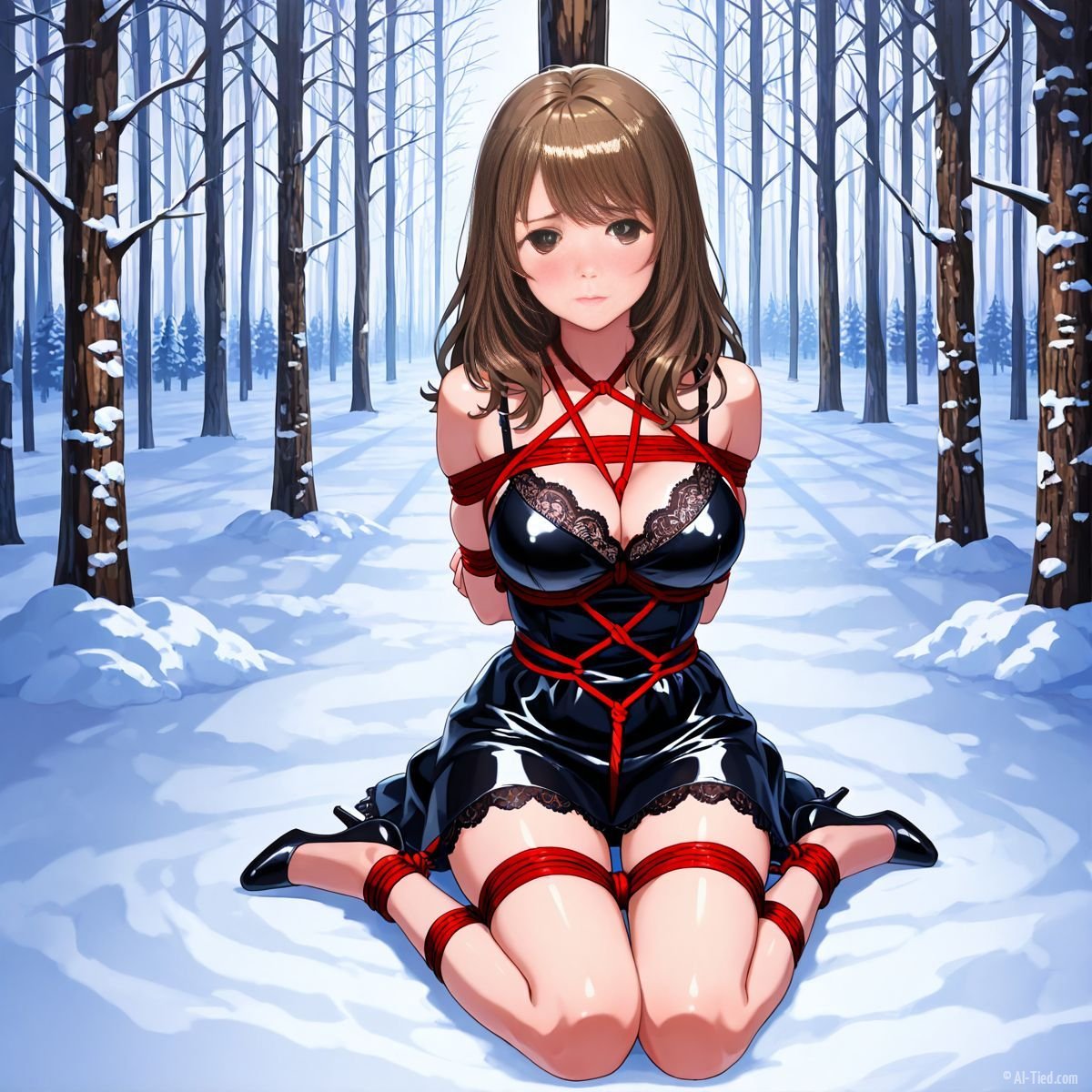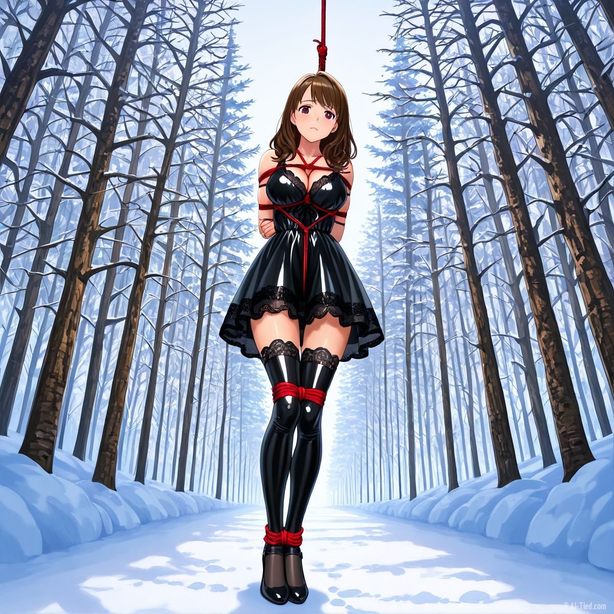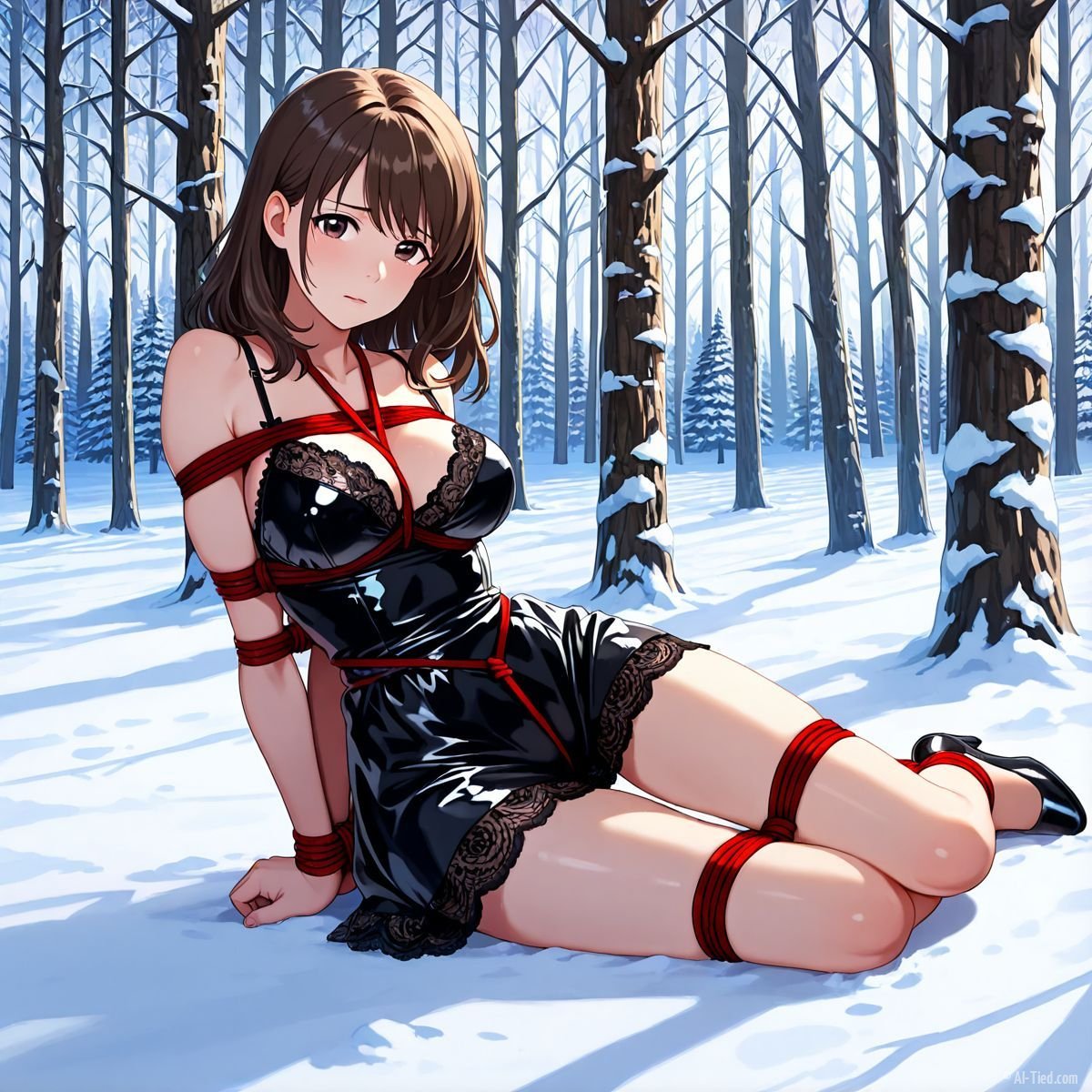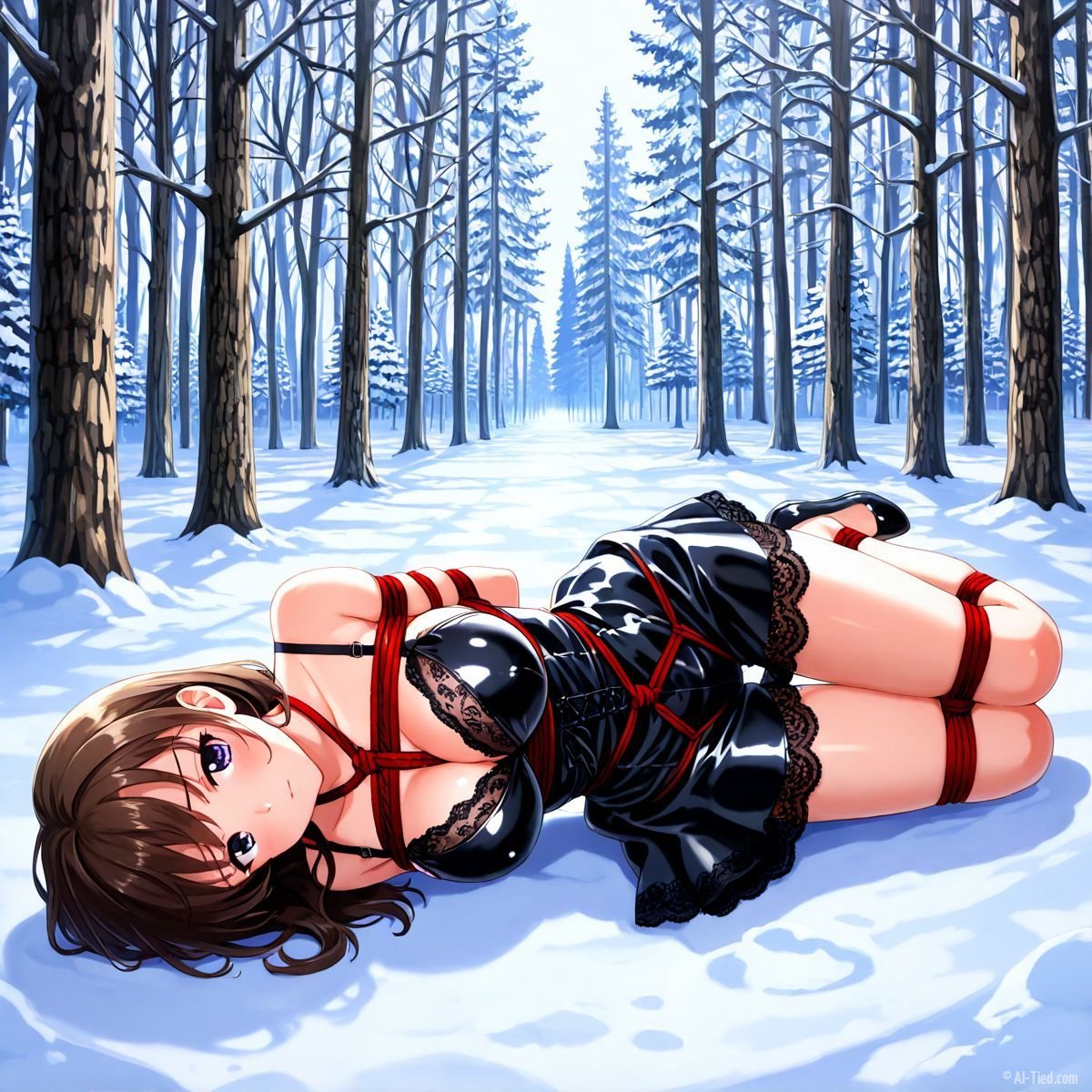 Briar stood with her back pressed hard against the rough bark of the tall pine, red ropes looped tight around her torso and the trunk, pinning her in place. The shiny black latex teddy hugged every inch of her thin frame, stretching taut over her full chest, the material so thin it offered nothing against the winter bite. Snow covered the forest floor in a thick, untouched blanket, daylight filtering through bare branches and casting cold light across her exposed skin. Her wrists were bound tight behind her back, red cords digging deep into her flesh, forcing her shoulders to pull back and push her breasts forward. More rope cinched her ankles together, keeping her legs pressed close, no room to step or run.