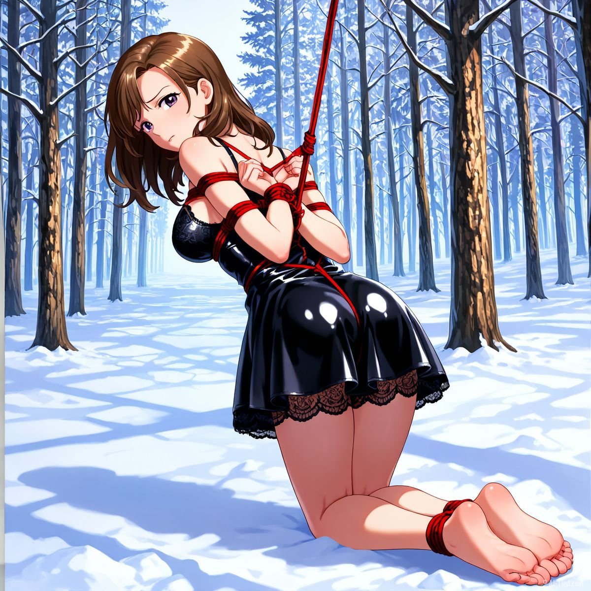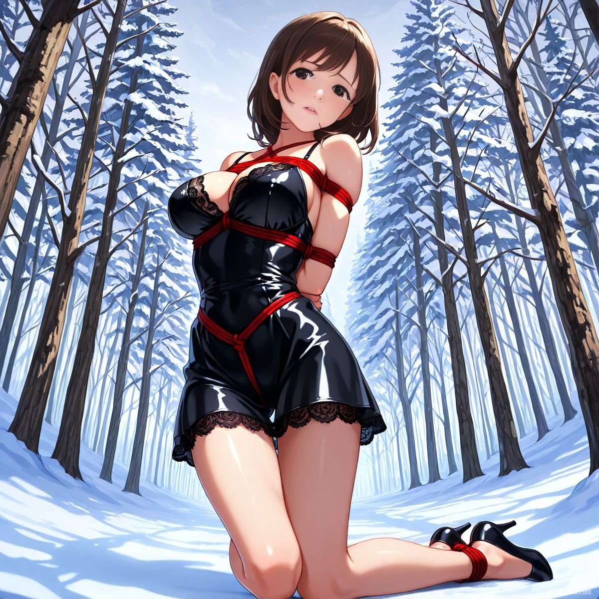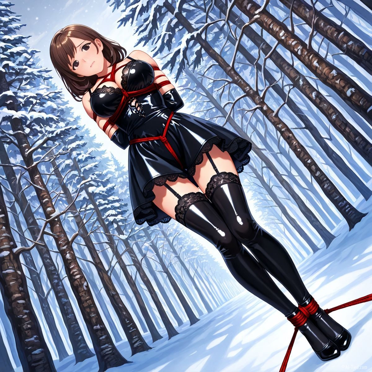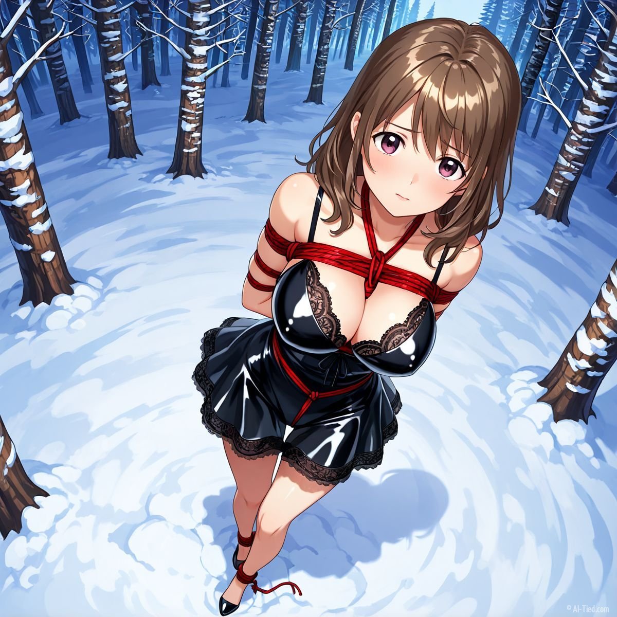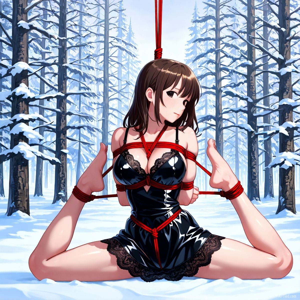 Briar stood with her back pressed hard against the rough bark of the tall pine, red ropes looped tight around her torso and the trunk, pinning her in place. The shiny black latex teddy hugged every inch of her thin frame, stretching taut over her full chest, the material so thin it offered nothing against the winter bite. Snow covered the forest floor in a thick, untouched blanket, daylight filtering through bare branches and casting cold light across her exposed skin. Her wrists were bound tight behind her back, red cords digging deep into her flesh, forcing her shoulders to pull back and push her breasts forward. More rope cinched her ankles together, keeping her legs pressed close, no room to step or run.