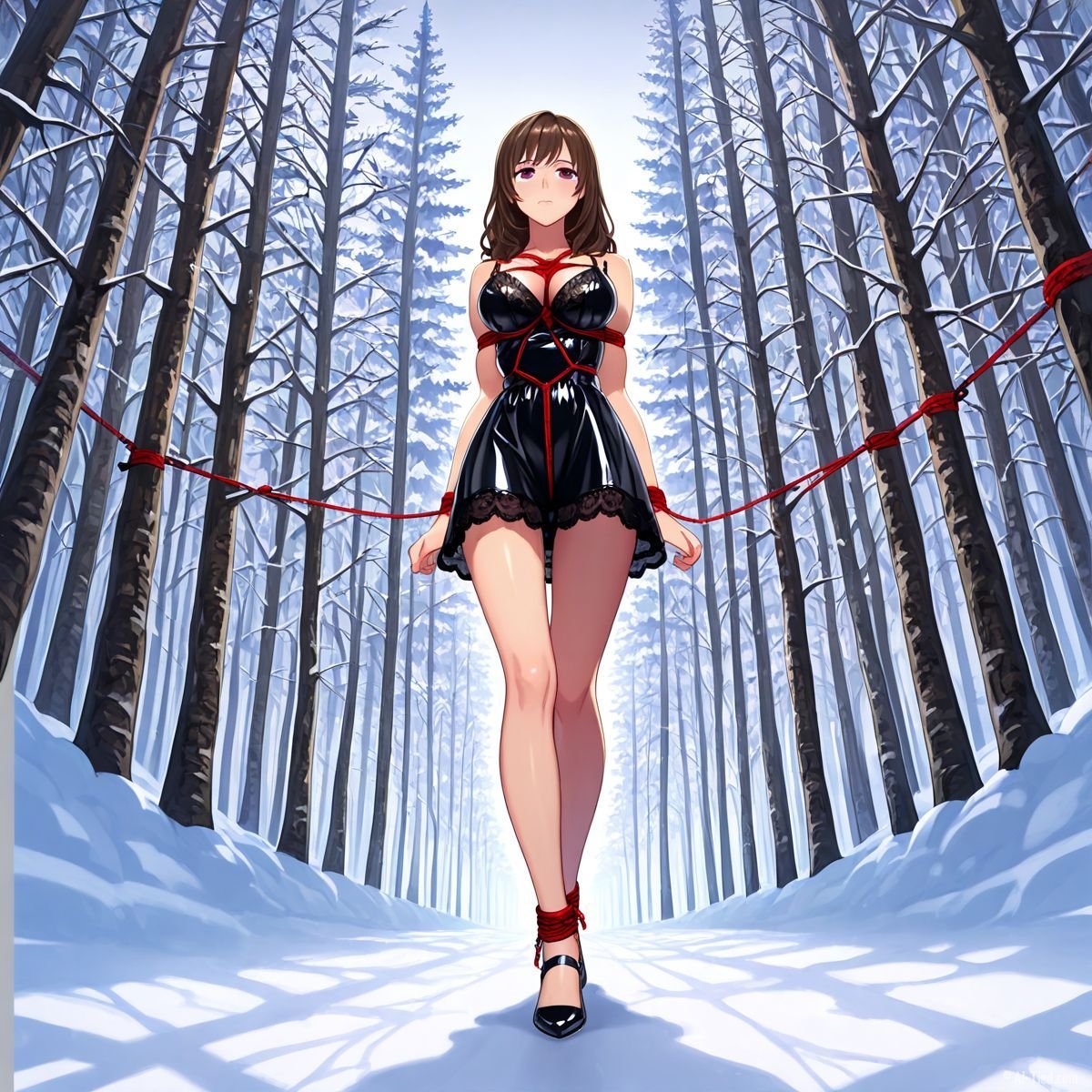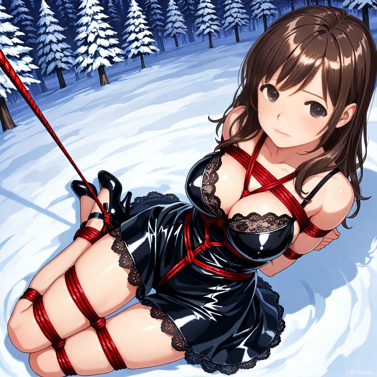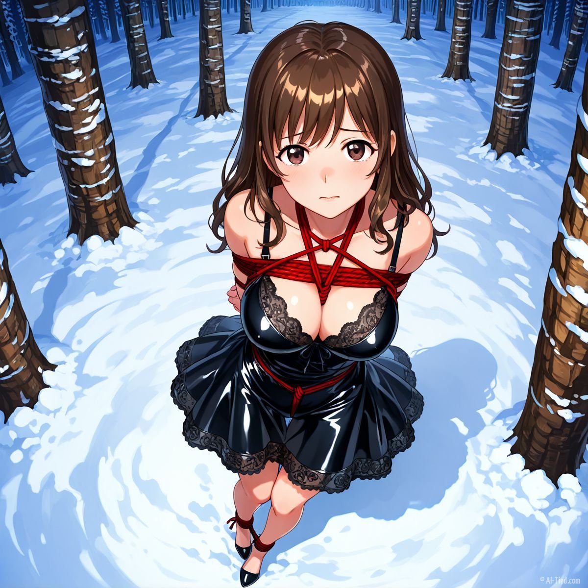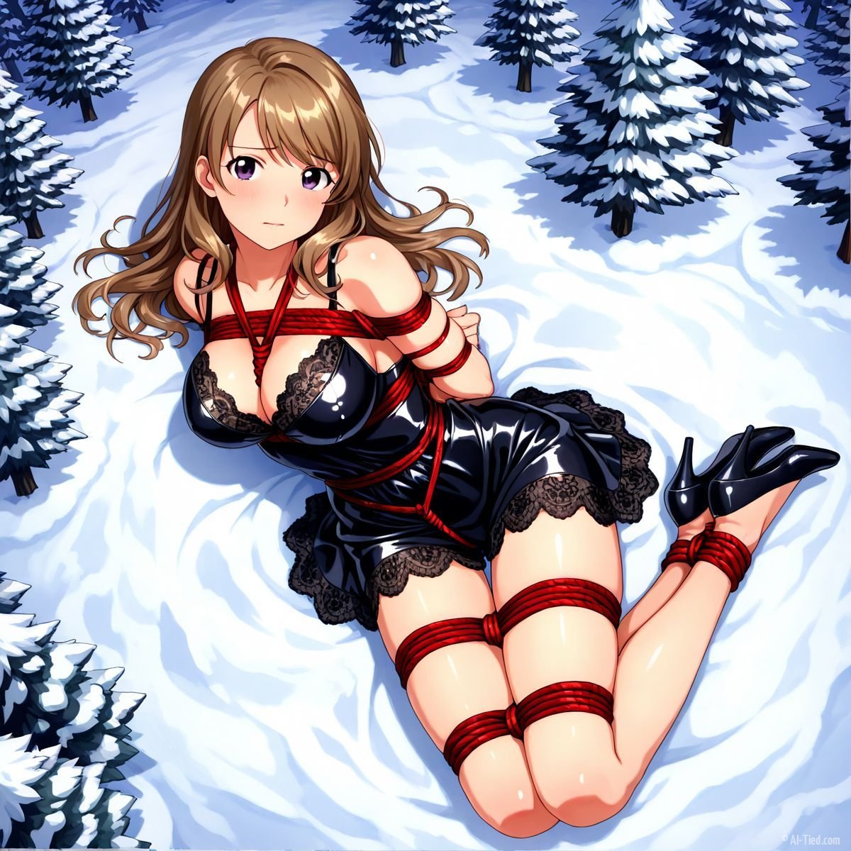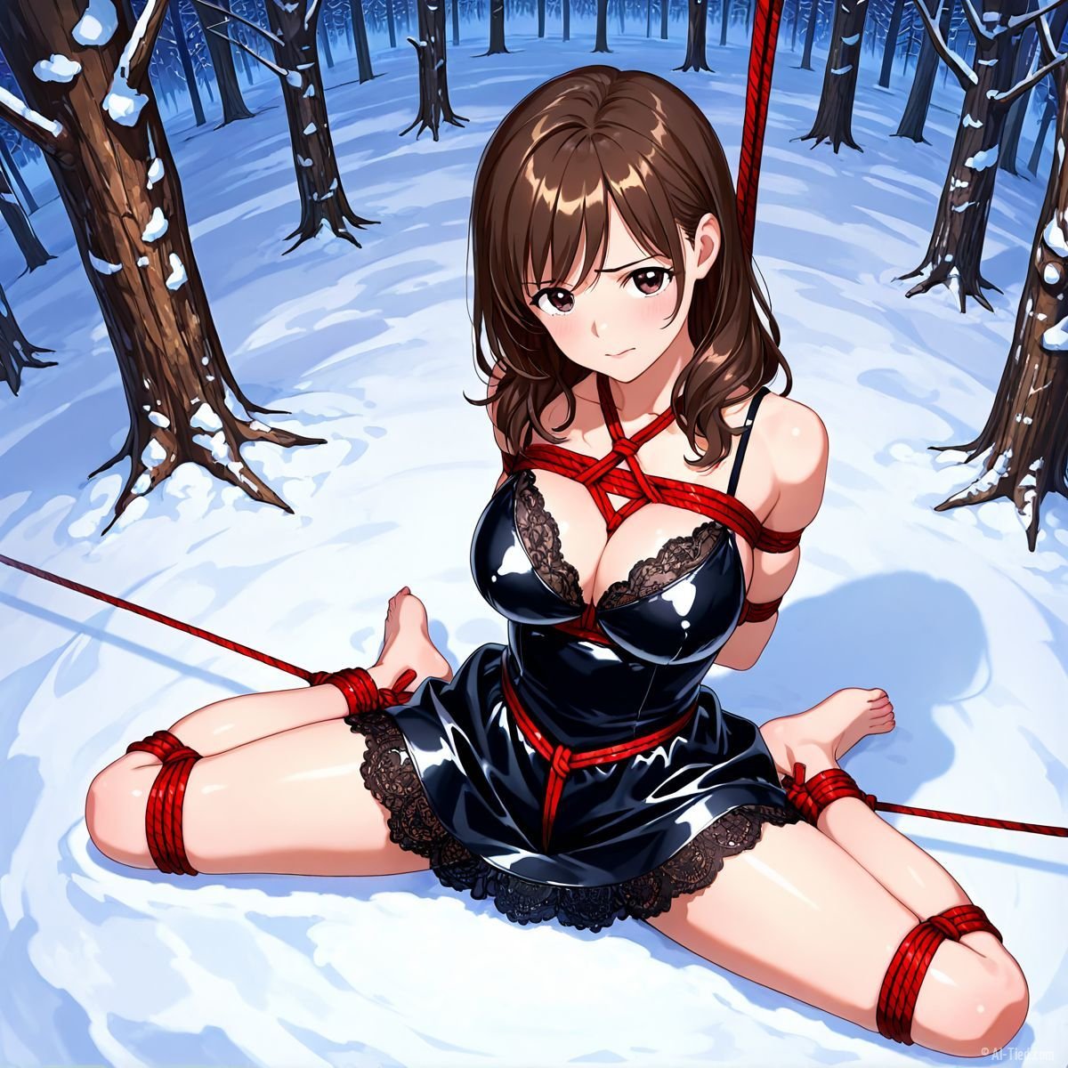 Briar stood with her back pressed hard against the rough bark of the tall pine, red ropes looped tight around her torso and the trunk, pinning her in place. The shiny black latex teddy hugged every inch of her thin frame, stretching taut over her full chest, the material so thin it offered nothing against the winter bite. Snow covered the forest floor in a thick, untouched blanket, daylight filtering through bare branches and casting cold light across her exposed skin. Her wrists were bound tight behind her back, red cords digging deep into her flesh, forcing her shoulders to pull back and push her breasts forward. More rope cinched her ankles together, keeping her legs pressed close, no room to step or run.