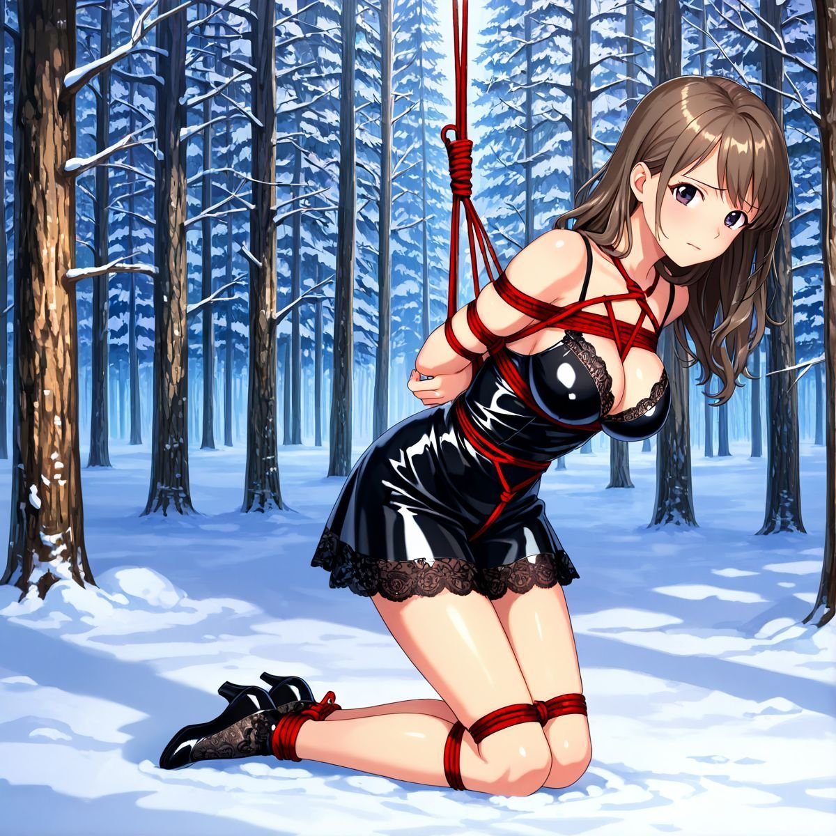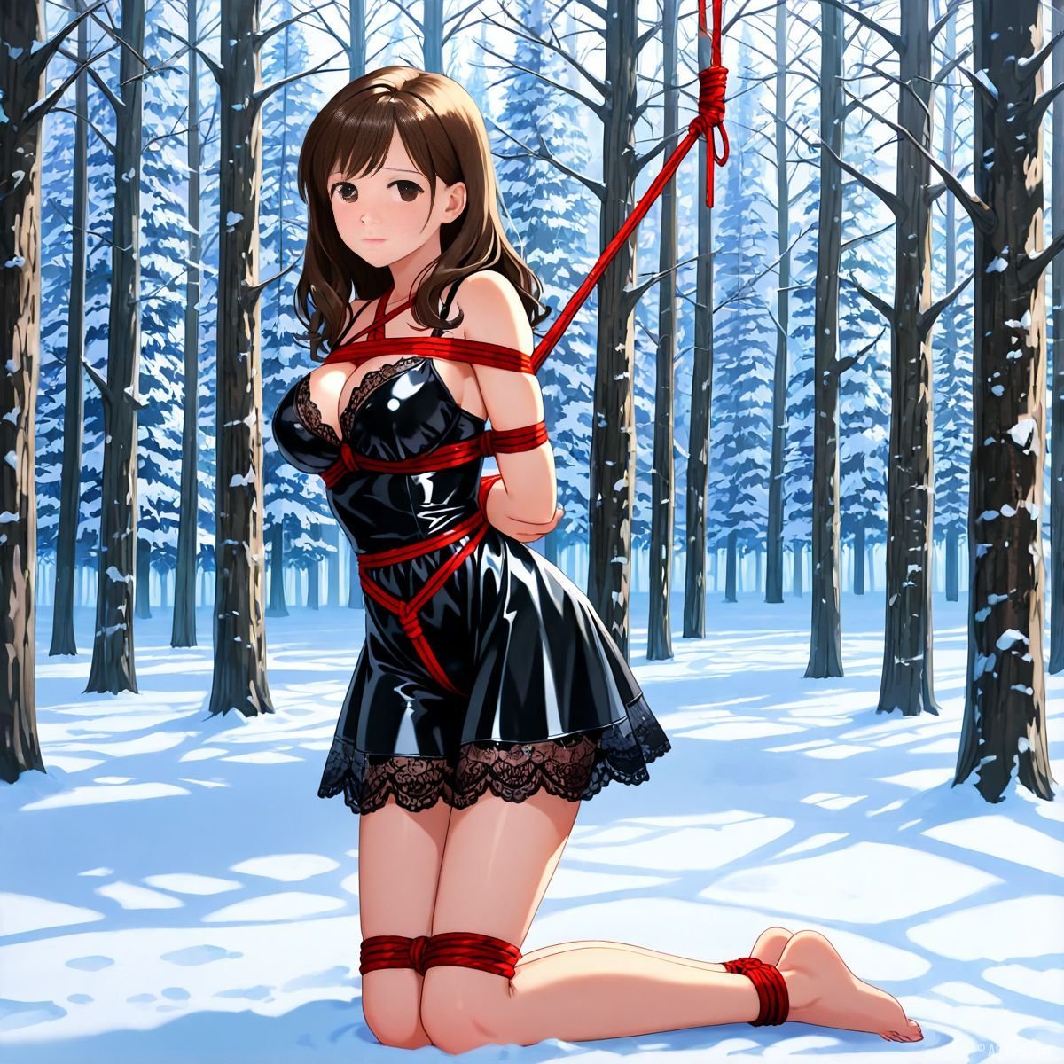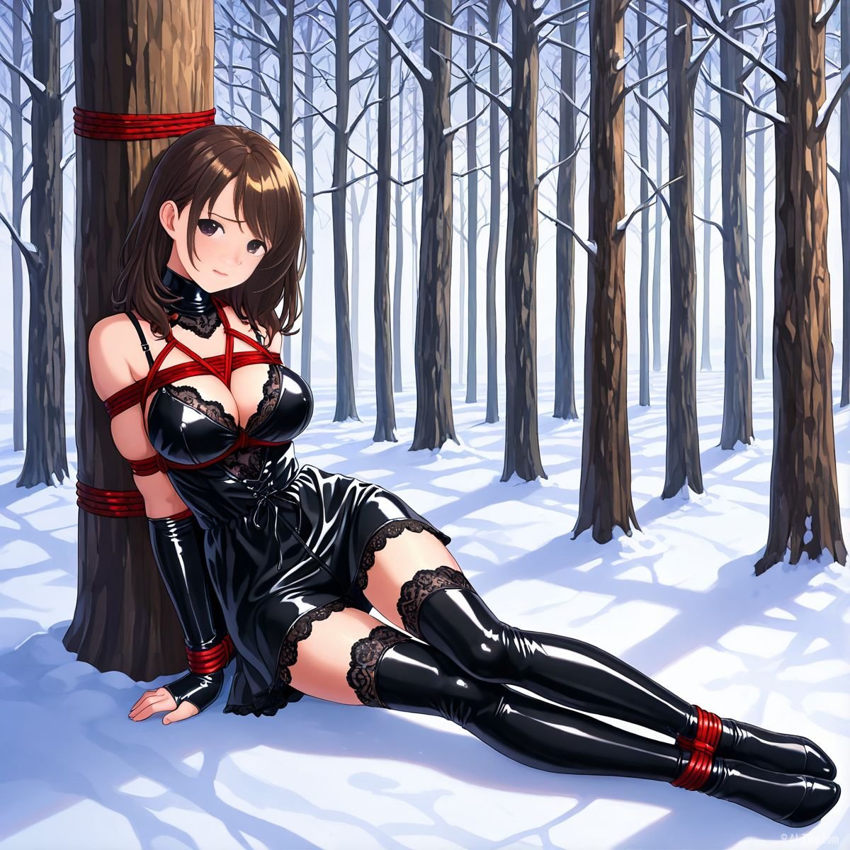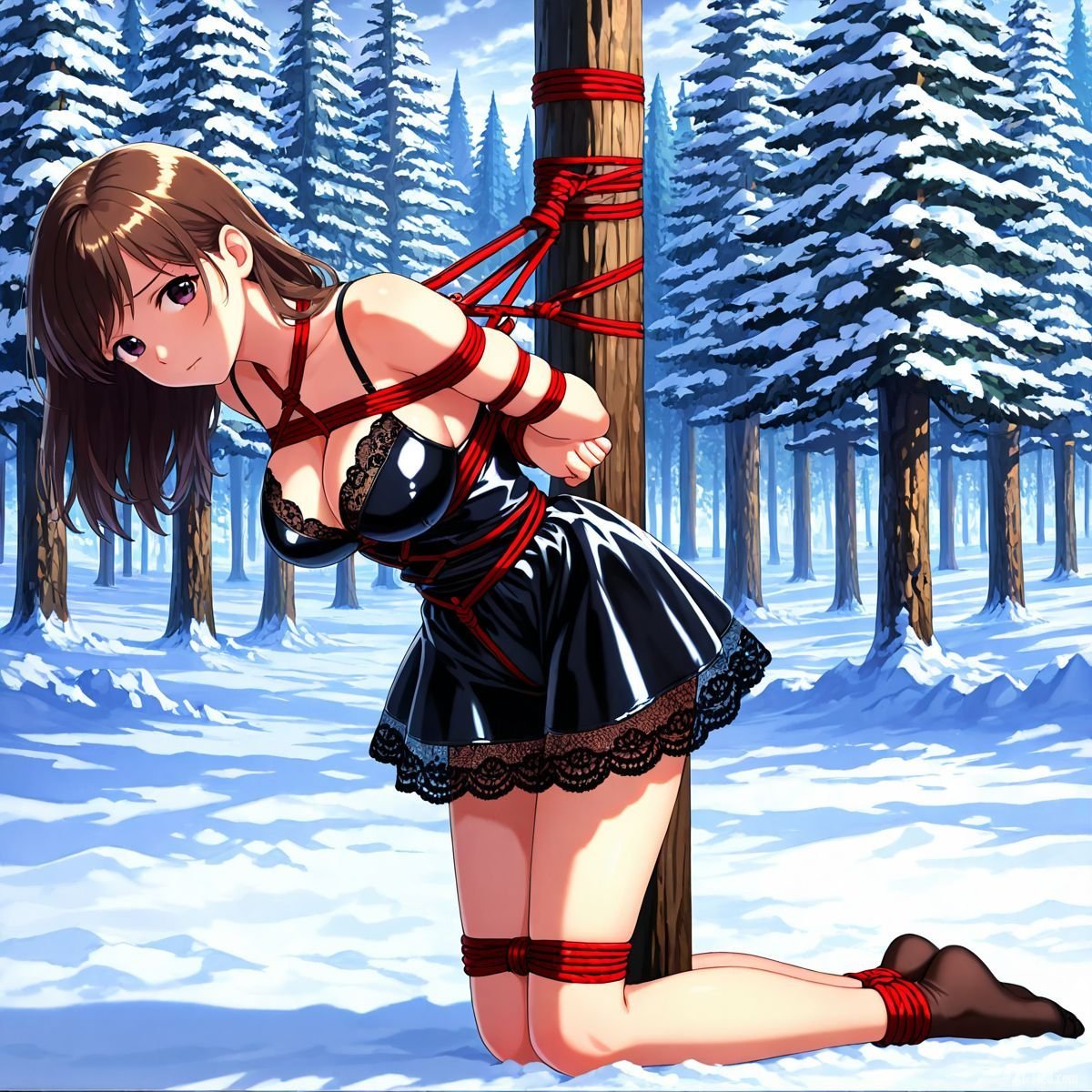 Her legs finally buckled. She sank slowly, the ropes around her torso sliding just enough to let her drop to her knees in the deep snow. The impact drove cold powder up against the backs of her thighs, packing instantly against bare skin where the latex ended. A sharp gasp escaped her lips, white cloud bursting out as the shock hit. Kneeling now, the red ropes still held her upper body snug to the trunk, but her bound ankles sank deeper into the drift, snow pressing cold and wet against her shins.