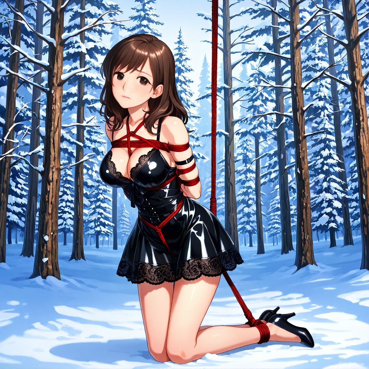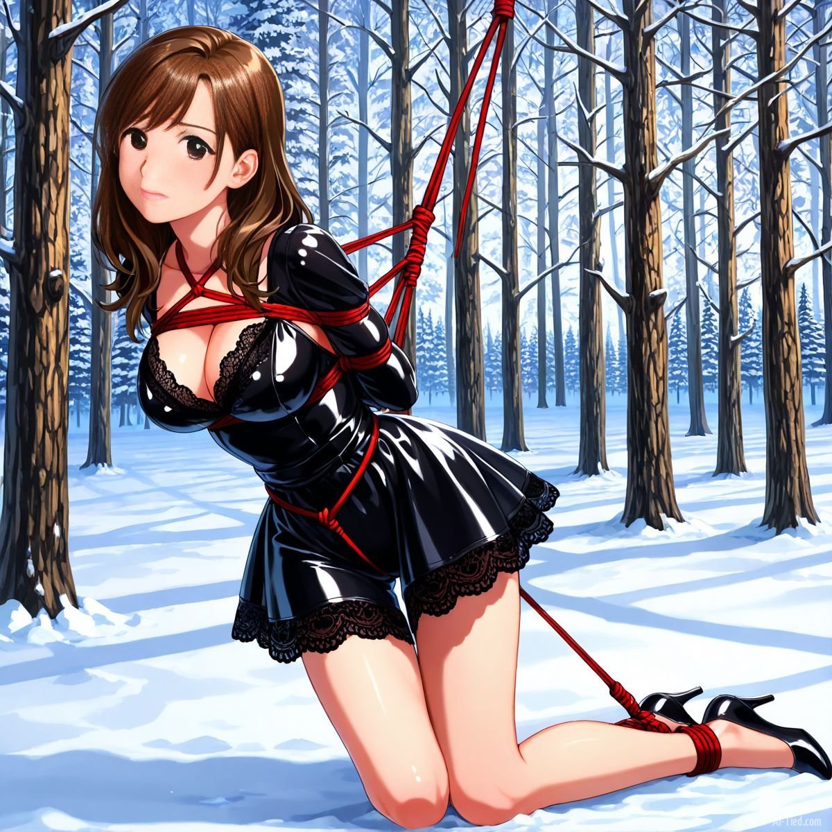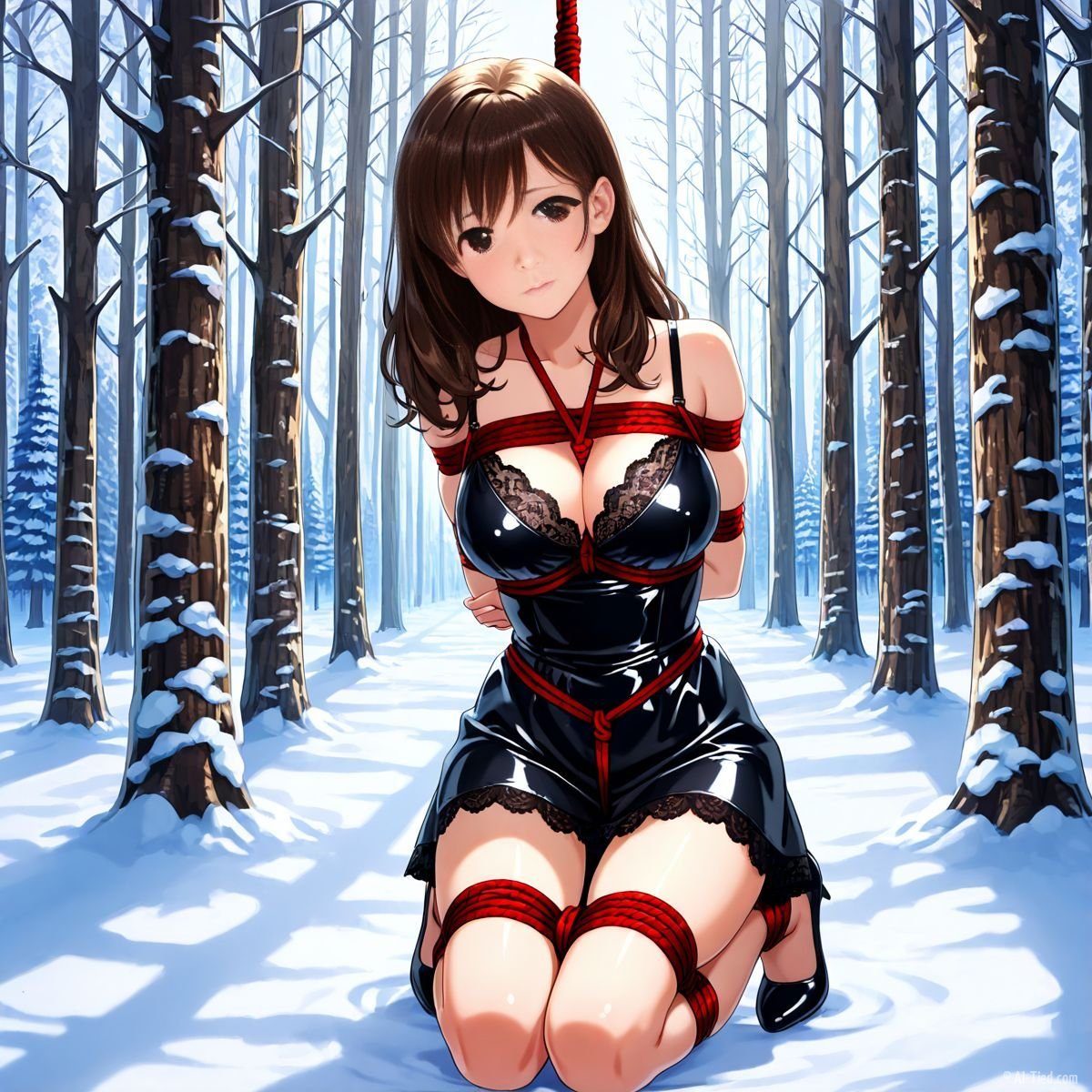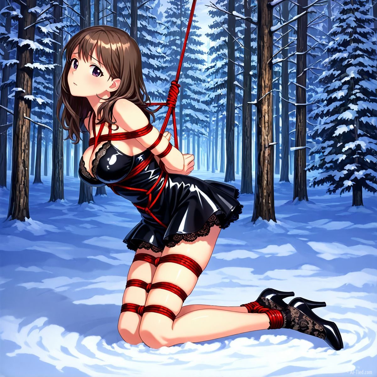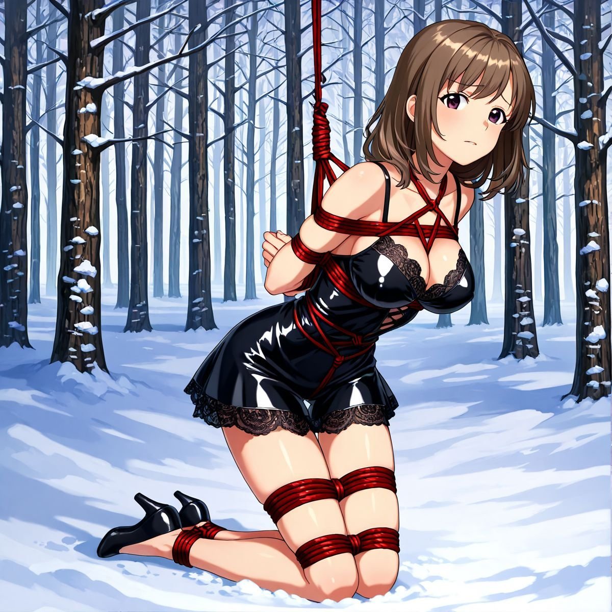 Her legs finally buckled. She sank slowly, the ropes around her torso sliding just enough to let her drop to her knees in the deep snow. The impact drove cold powder up against the backs of her thighs, packing instantly against bare skin where the latex ended. A sharp gasp escaped her lips, white cloud bursting out as the shock hit. Kneeling now, the red ropes still held her upper body snug to the trunk, but her bound ankles sank deeper into the drift, snow pressing cold and wet against her shins.