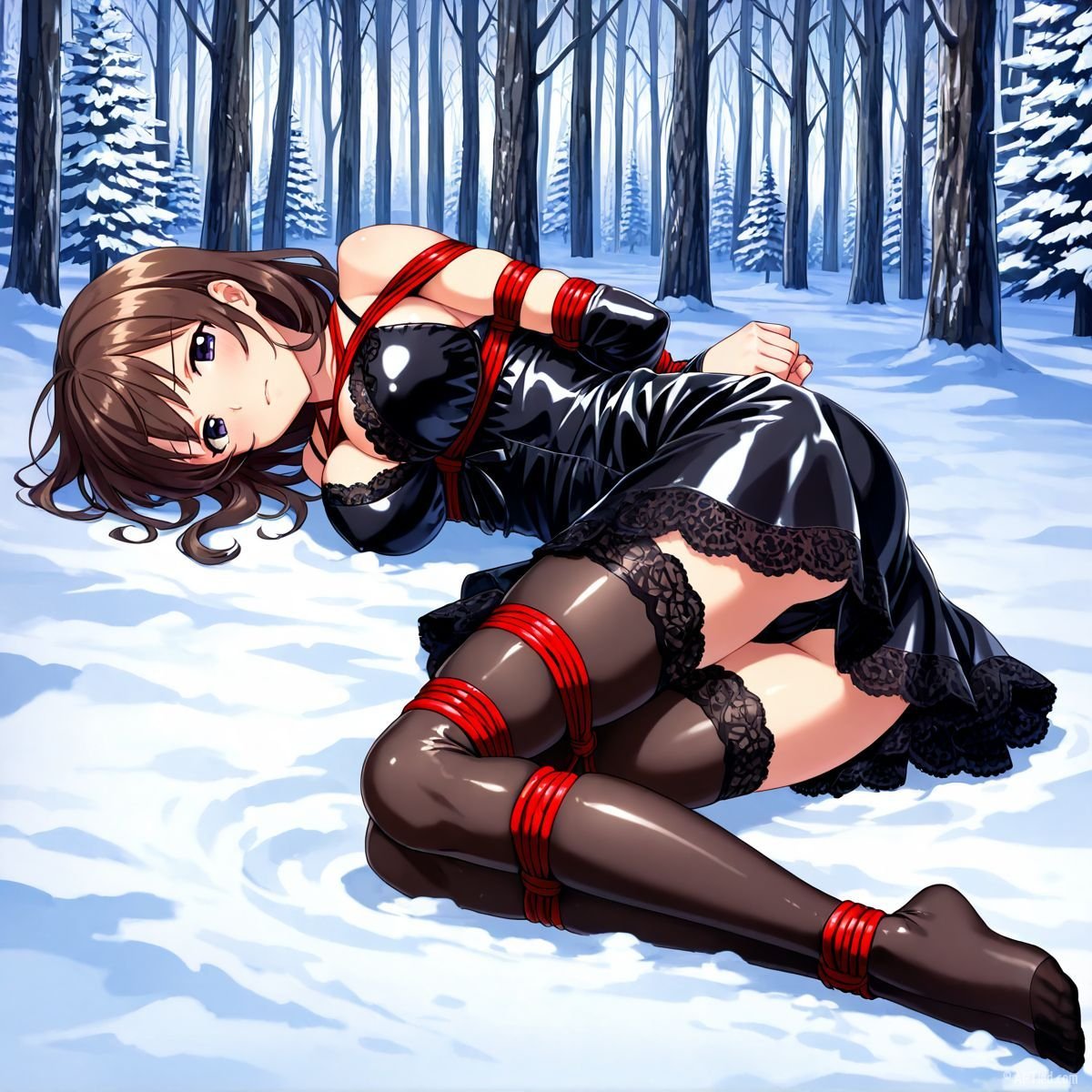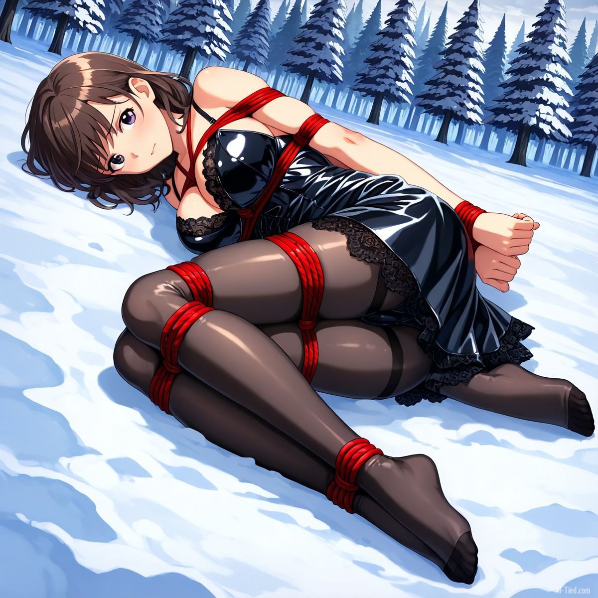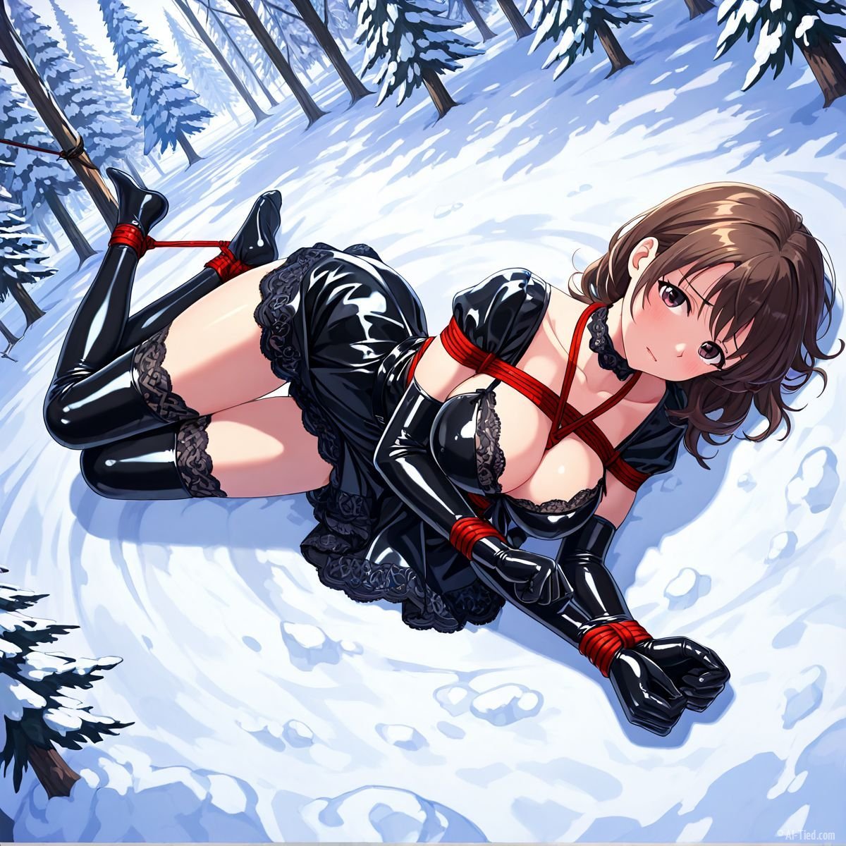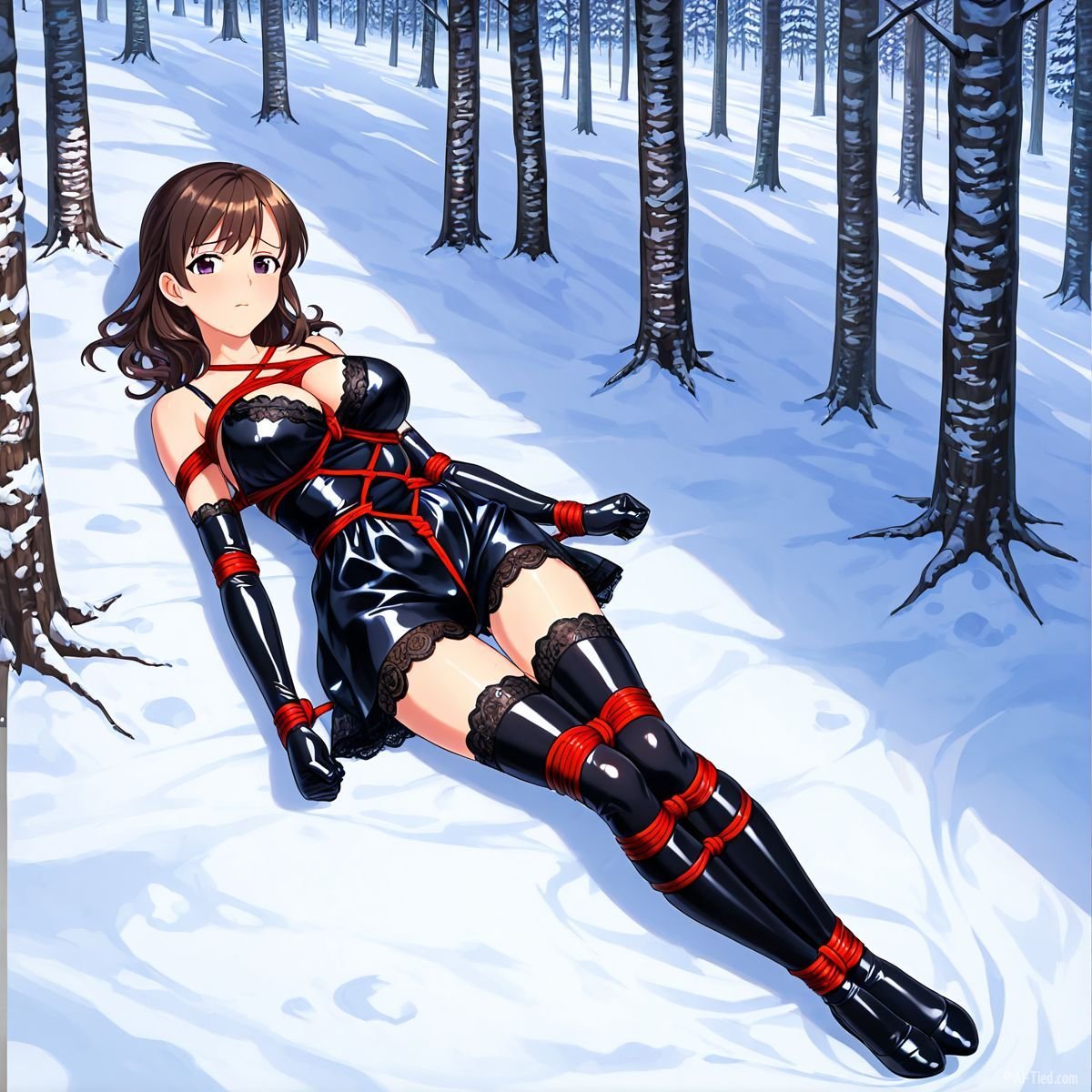 Her body gave out at last. Muscles shaking too hard to hold any position, she tipped sideways and collapsed fully onto her back in the snow. The impact drove a muffled grunt from her throat as cold powder swallowed her from shoulder blades to heels. The red ropes still connected her to the tree, keeping her torso slightly arched, breasts pushed upward, wrists trapped beneath her. Snow cradled her bound ankles, piled against the sides of her thighs, dusted across her stomach where the teddy had ridden up from the fall.