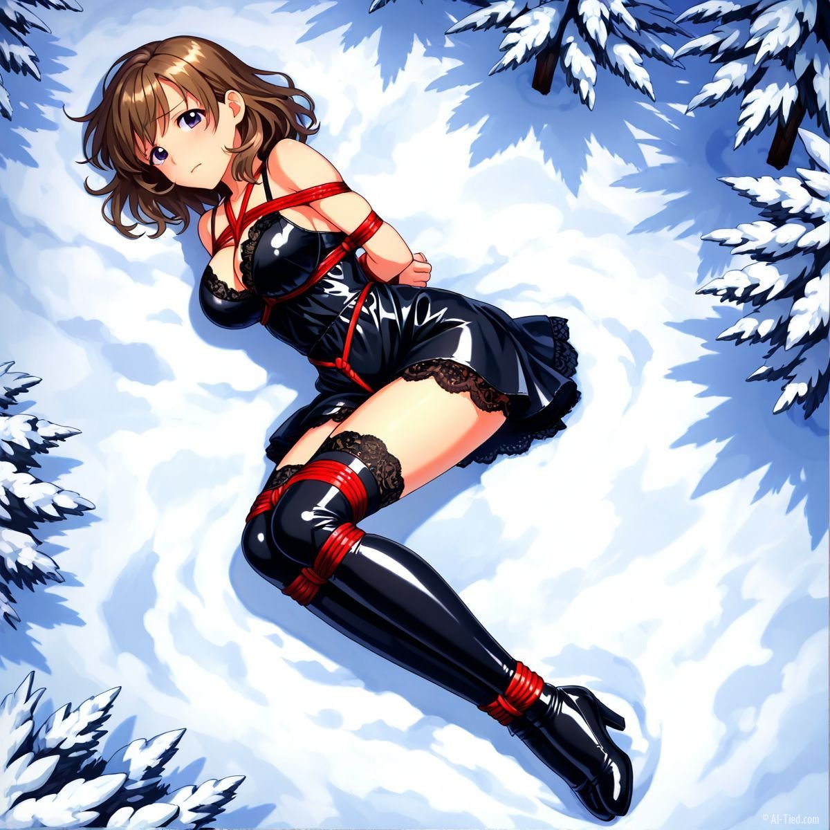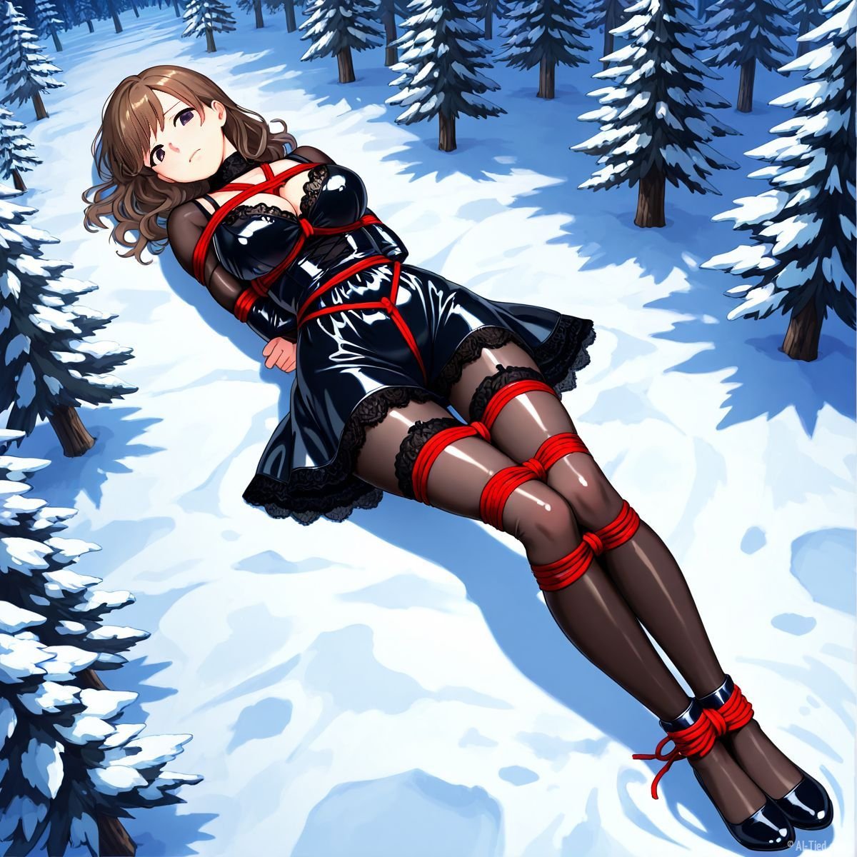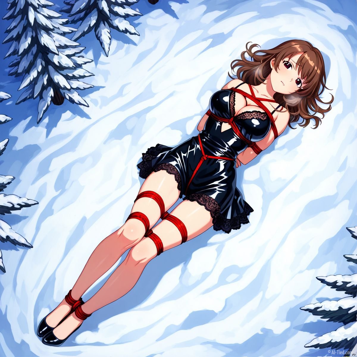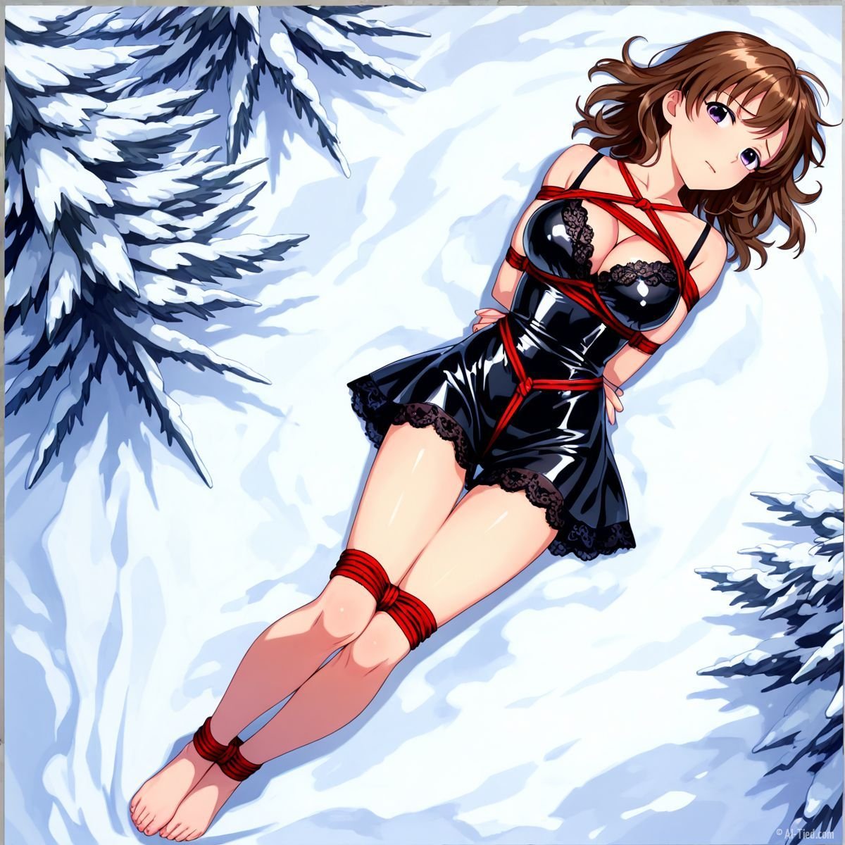Her body gave out at last. Muscles shaking too hard to hold any position, she tipped sideways and collapsed fully onto her back in the snow. The impact drove a muffled grunt from her throat as cold powder swallowed her from shoulder blades to heels. The red ropes still connected her to the tree, keeping her torso slightly arched, breasts pushed upward, wrists trapped beneath her. Snow cradled her bound ankles, piled against the sides of her thighs, dusted across her stomach where the teddy had ridden up from the fall.