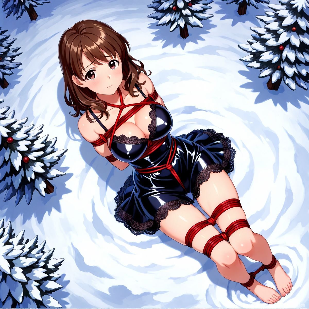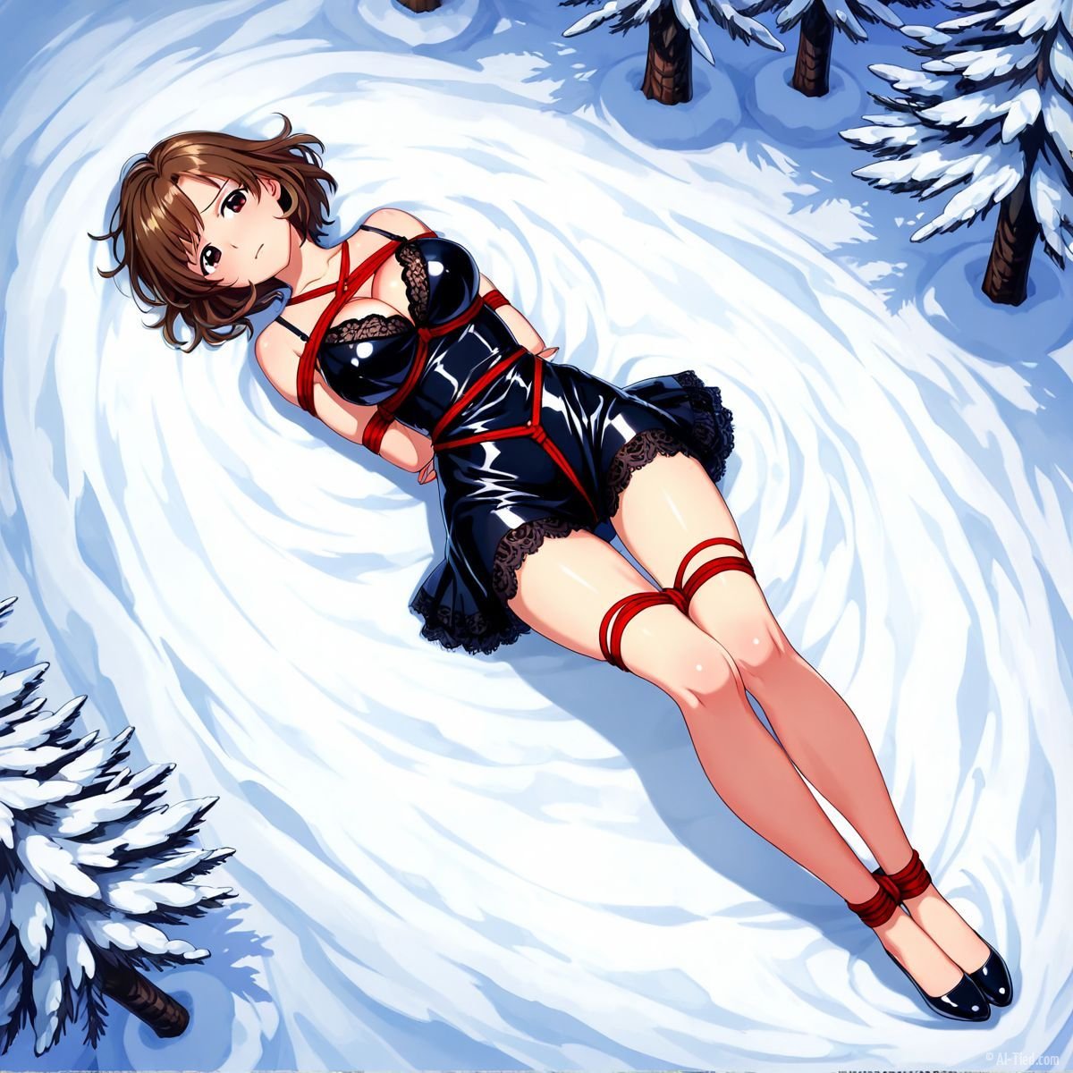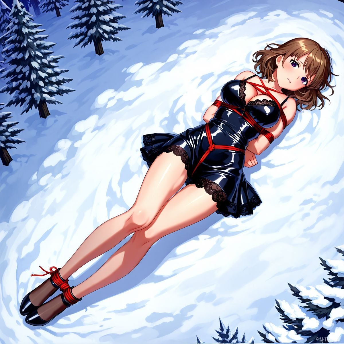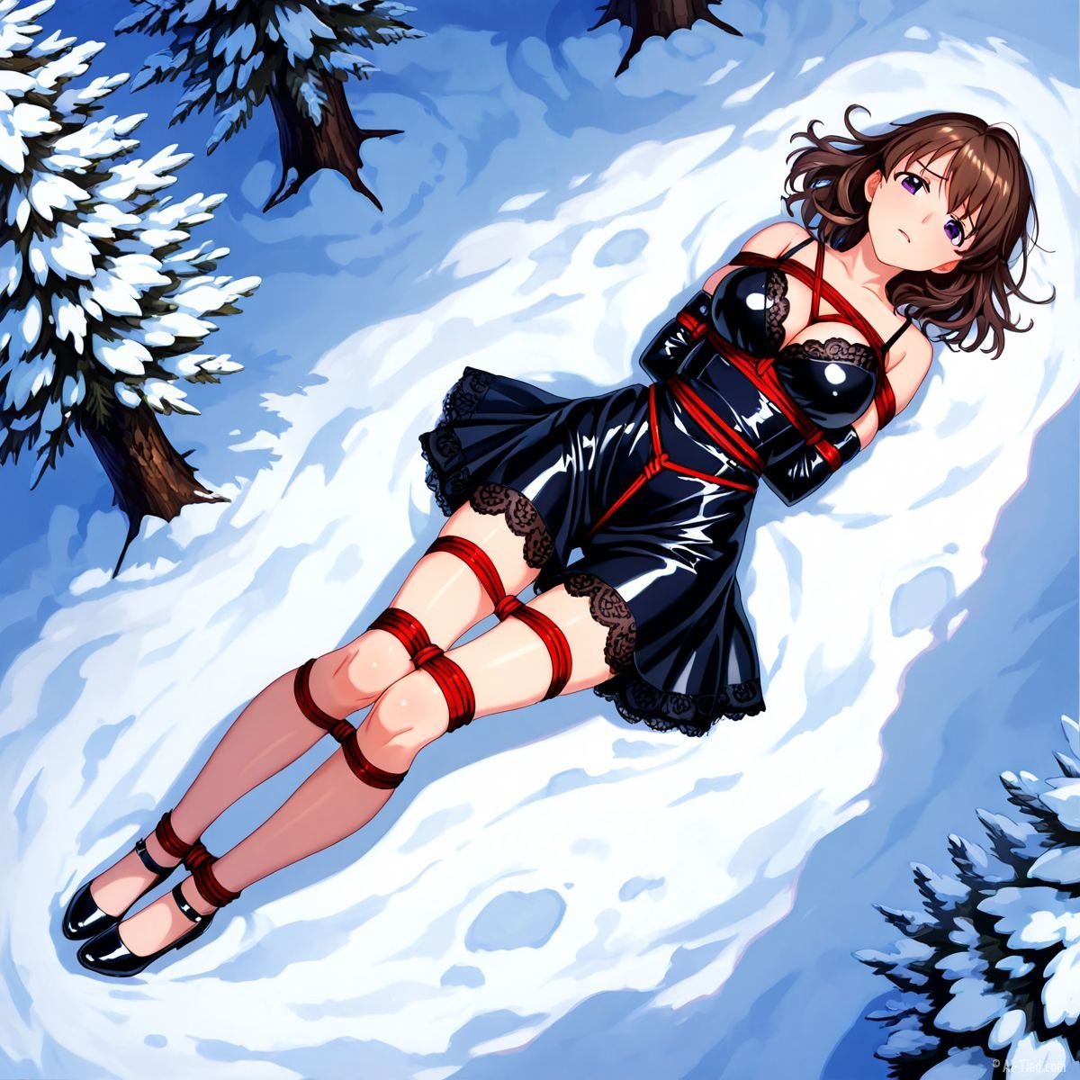 Her body gave out at last. Muscles shaking too hard to hold any position, she tipped sideways and collapsed fully onto her back in the snow. The impact drove a muffled grunt from her throat as cold powder swallowed her from shoulder blades to heels. The red ropes still connected her to the tree, keeping her torso slightly arched, breasts pushed upward, wrists trapped beneath her. Snow cradled her bound ankles, piled against the sides of her thighs, dusted across her stomach where the teddy had ridden up from the fall.