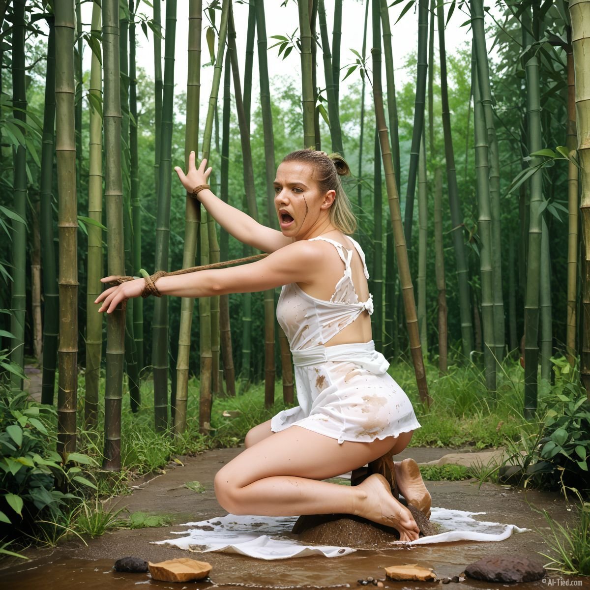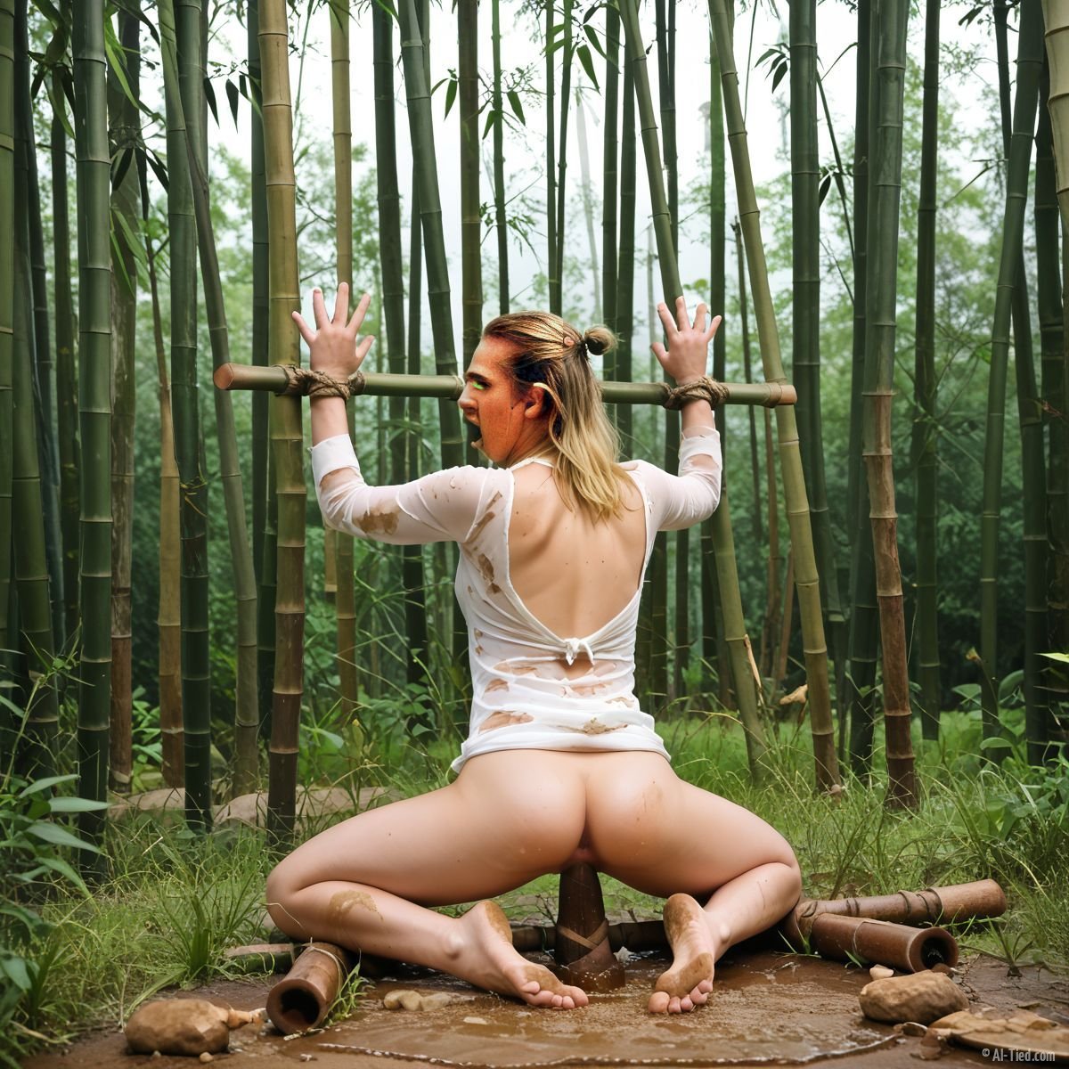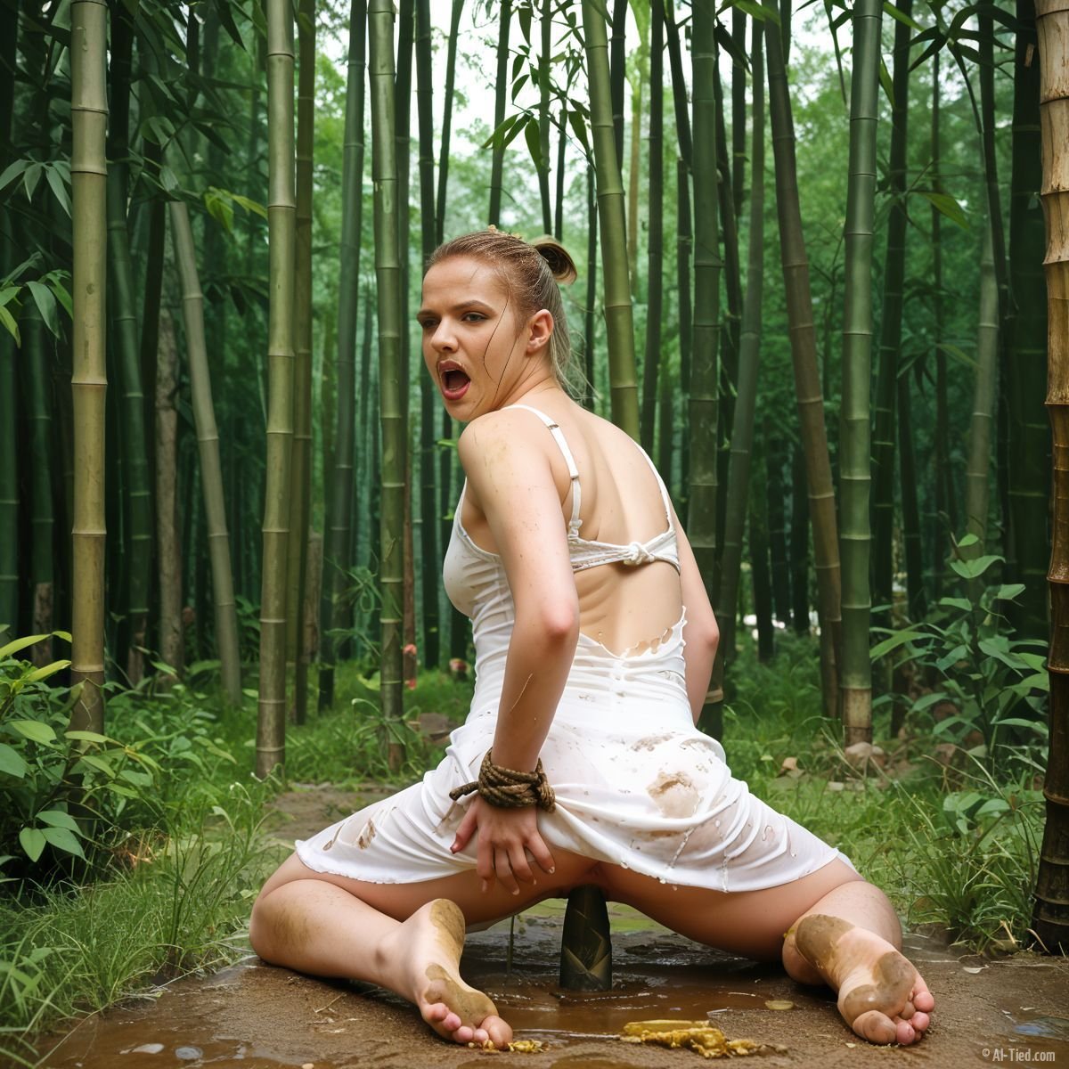 For one brief instant she felt the bamboo begin to slide outward. It eased the burning stretch inside her pussy by the smallest fraction as a flicker of desperate hope surged through her mind. Then her own weight betrayed her, dragging her back down so the shaft seated itself deeper with sudden brutal force. A choked, raw sound tore from her throat before she could swallow it down. Pain bloomed fresh and vicious. The dripping water, creaking bamboo, and her ragged breathing pressed in louder around her.