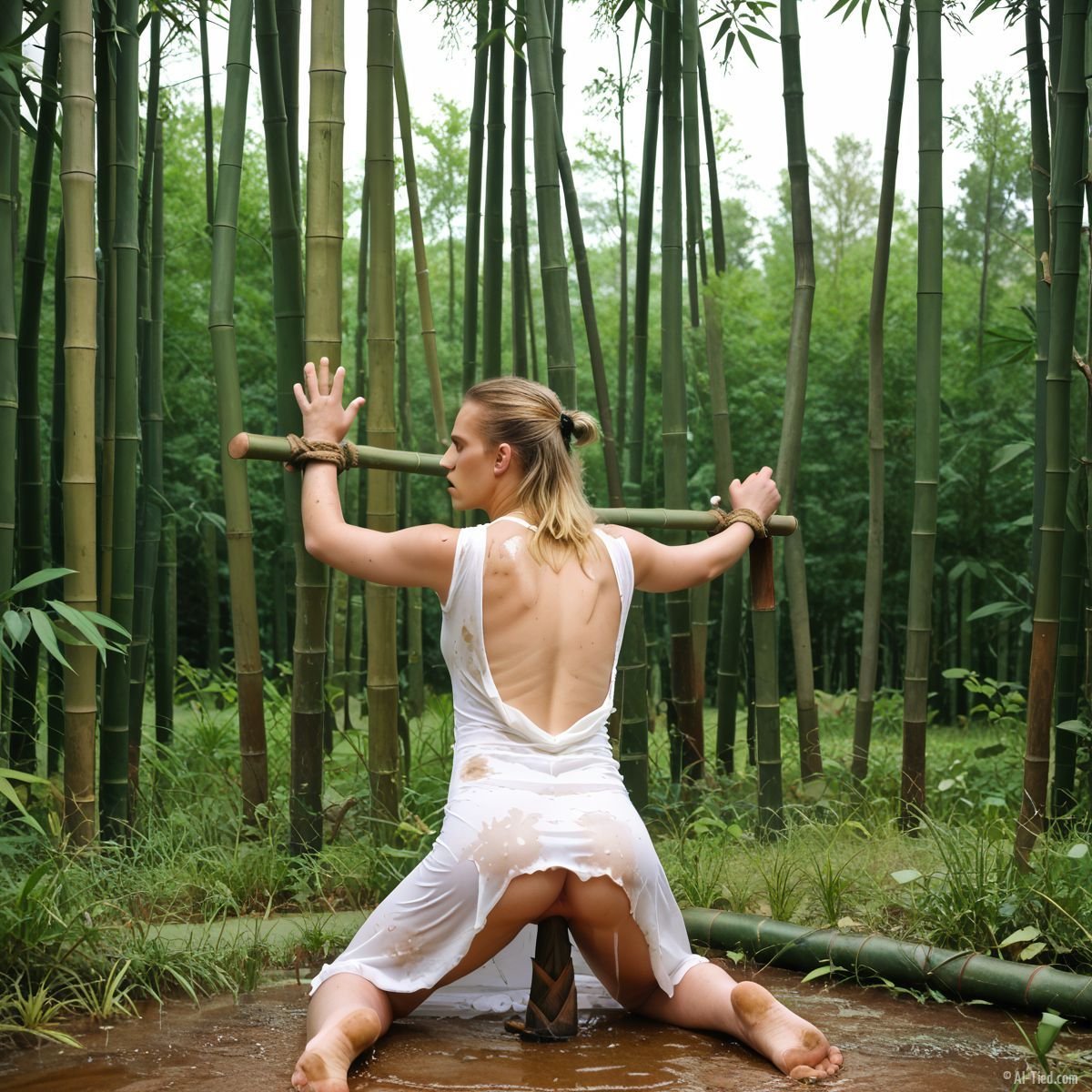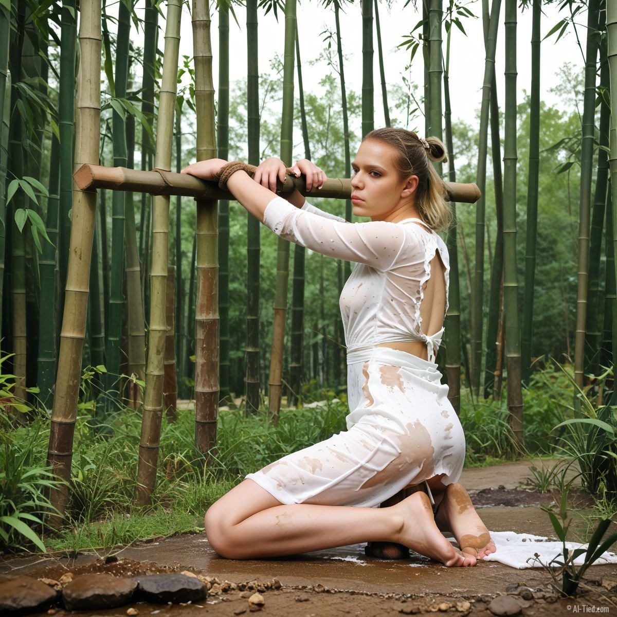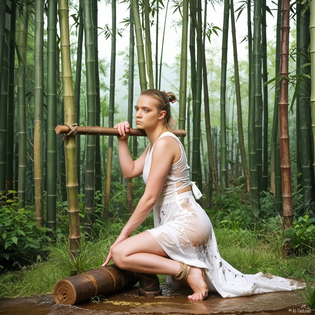 For one brief instant she felt the bamboo begin to slide outward. It eased the burning stretch inside her pussy by the smallest fraction as a flicker of desperate hope surged through her mind. Then her own weight betrayed her, dragging her back down so the shaft seated itself deeper with sudden brutal force. A choked, raw sound tore from her throat before she could swallow it down. Pain bloomed fresh and vicious. The dripping water, creaking bamboo, and her ragged breathing pressed in louder around her.