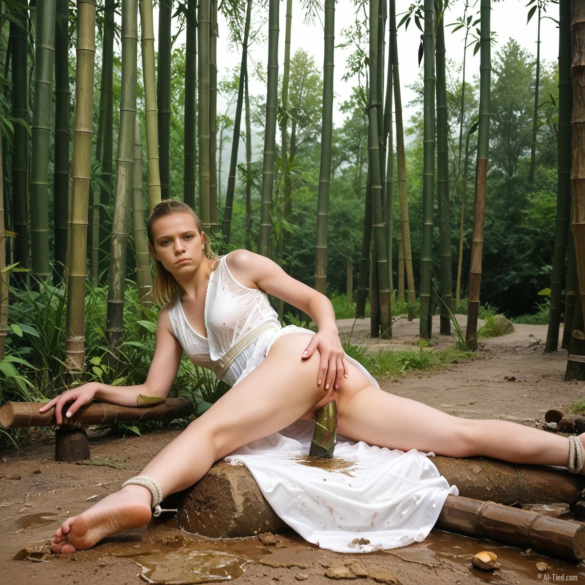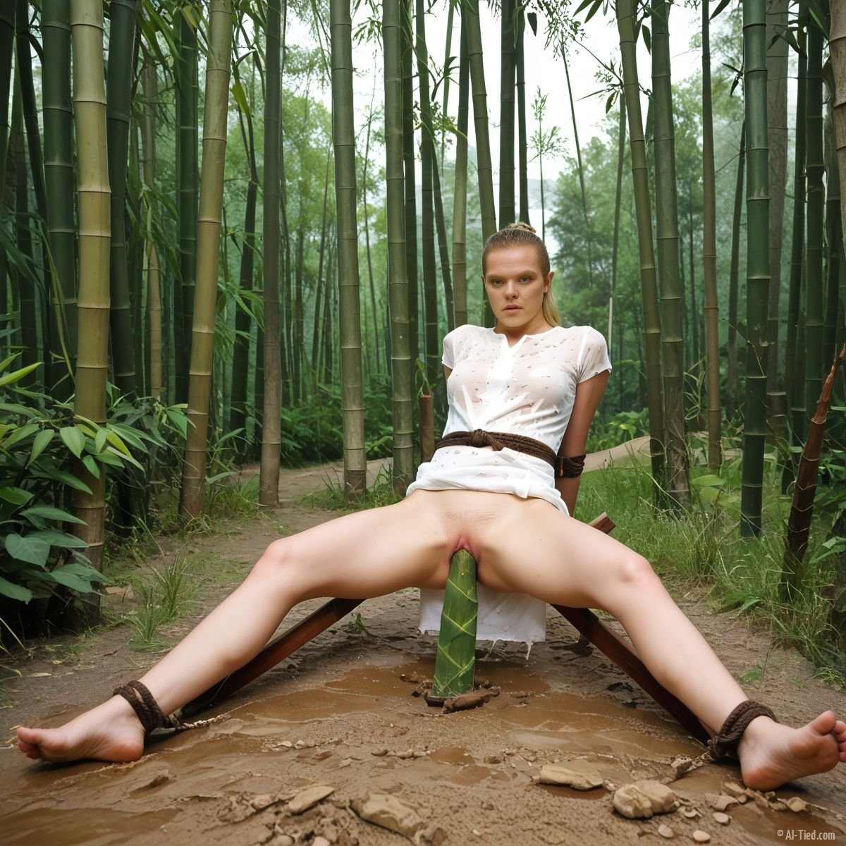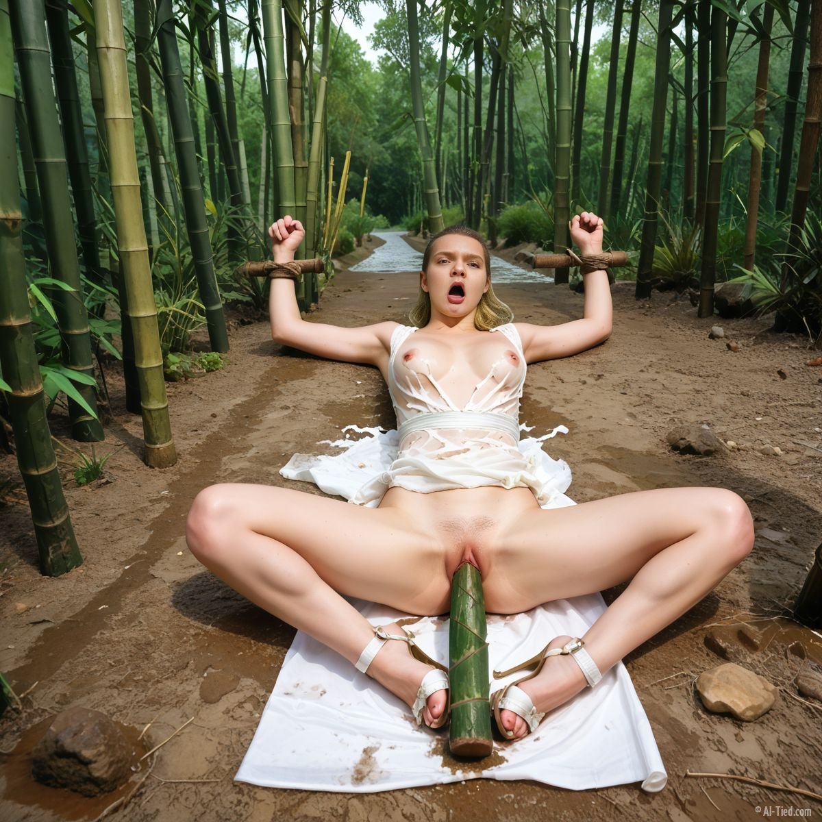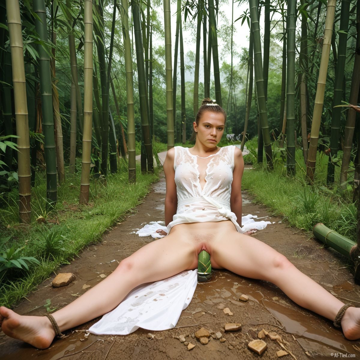 The deepest agony centered low in her body. A single young bamboo shoot rose straight from the mud and pierced upward into her pussy. The smooth, rigid length had driven several inches deep sometime during the fall or the frantic struggle that followed. Now it held her impaled with unyielding pressure. Her inner walls clenched uselessly around the hard intrusion but found no relief, only a sharper stretching ache that throbbed outward through her pelvis, up her spine, and into her clenched jaw.
