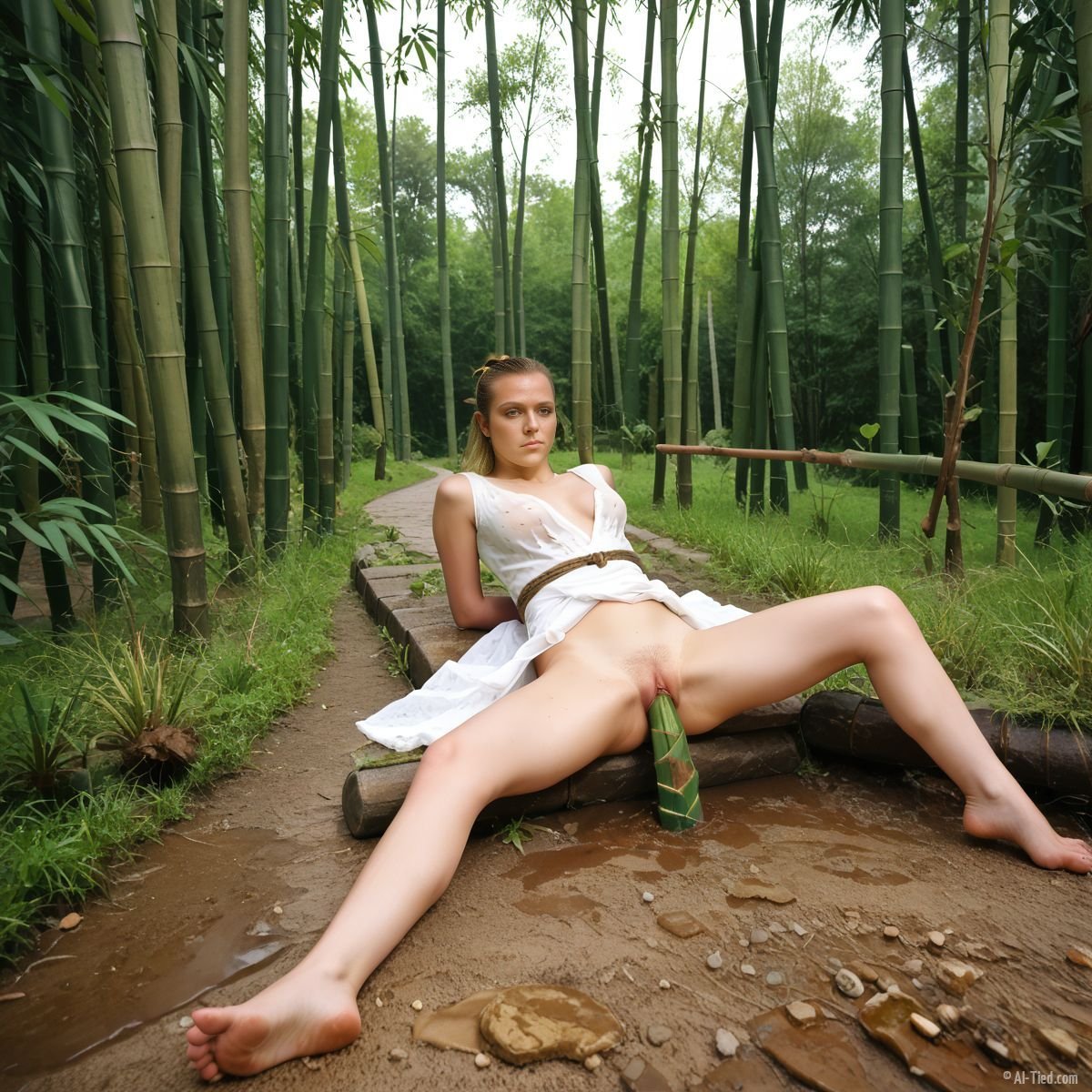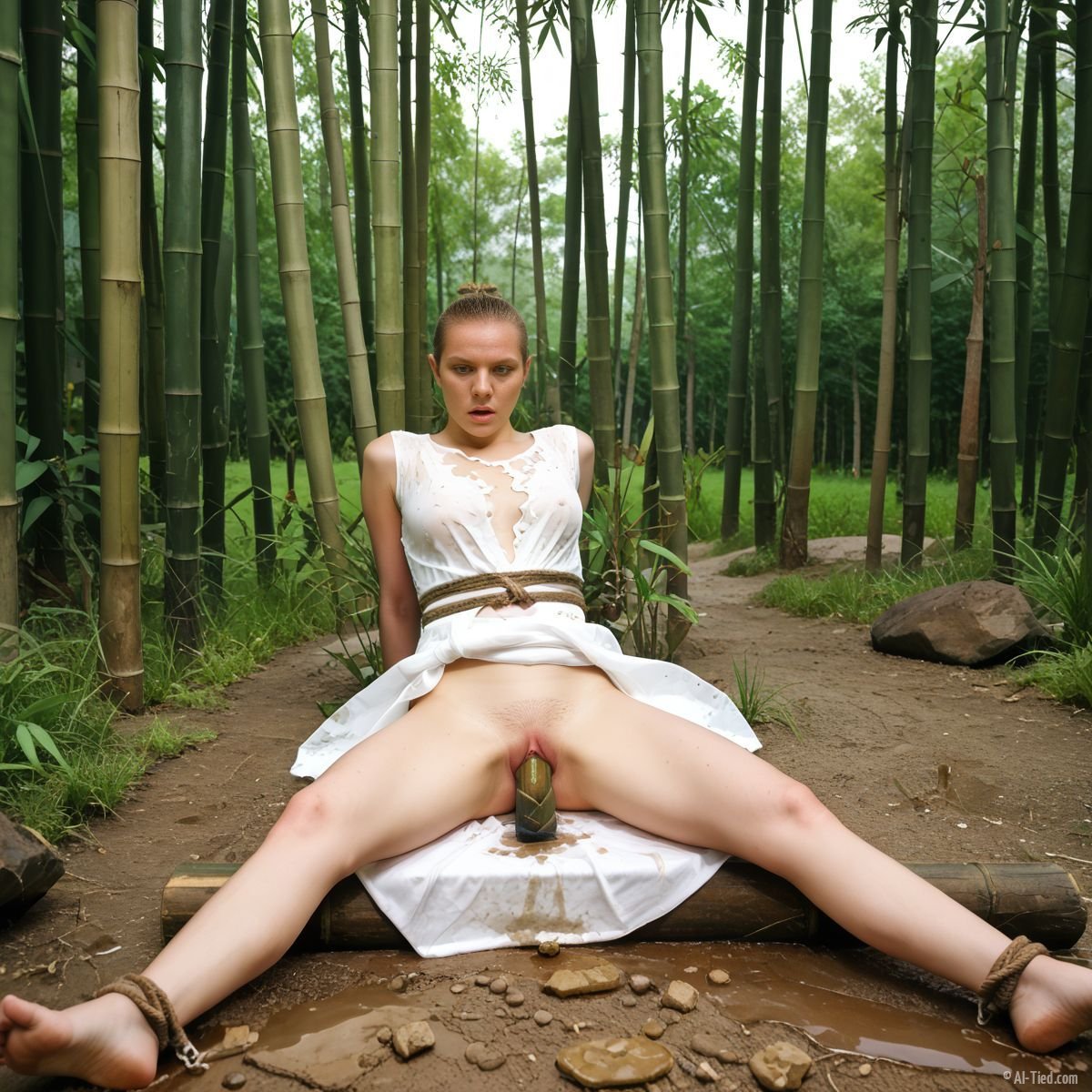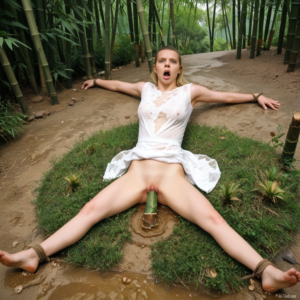 The deepest agony centered low in her body. A single young bamboo shoot rose straight from the mud and pierced upward into her pussy. The smooth, rigid length had driven several inches deep sometime during the fall or the frantic struggle that followed. Now it held her impaled with unyielding pressure. Her inner walls clenched uselessly around the hard intrusion but found no relief, only a sharper stretching ache that throbbed outward through her pelvis, up her spine, and into her clenched jaw.