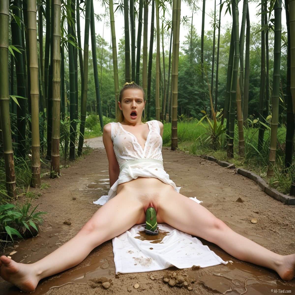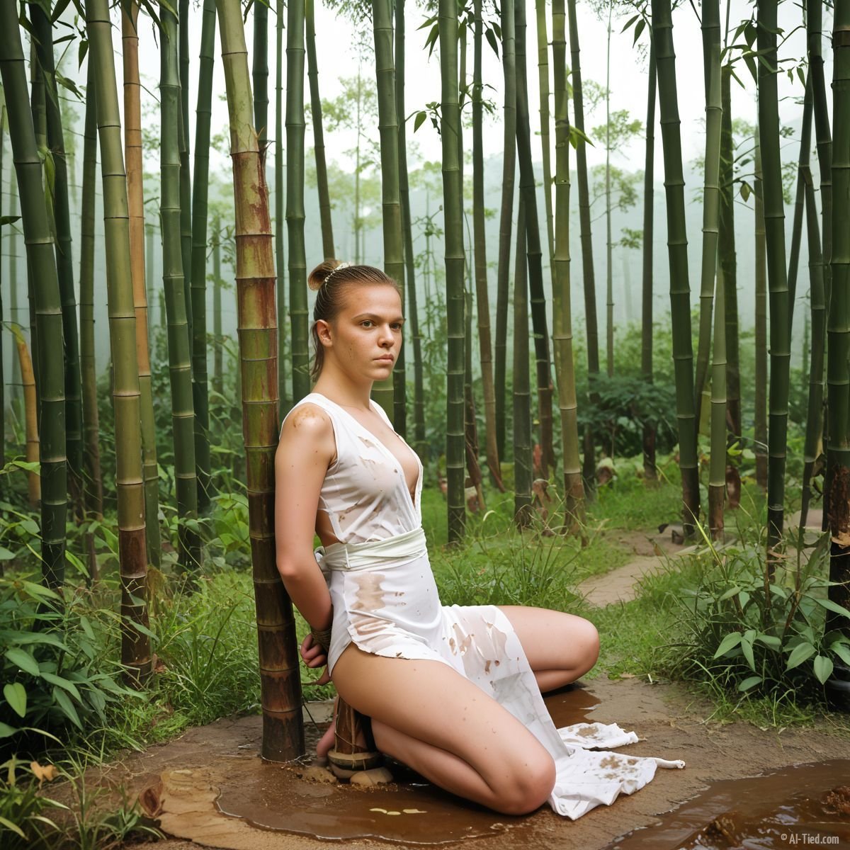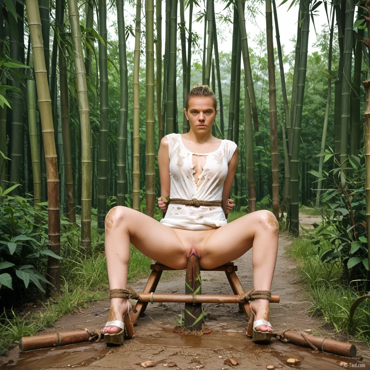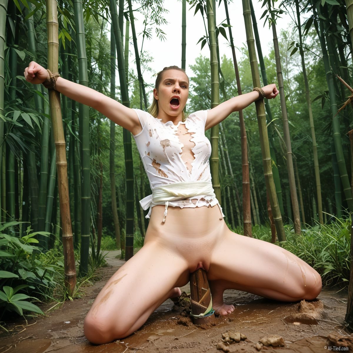 The deepest agony centered low in her body. A single young bamboo shoot rose straight from the mud and pierced upward into her pussy. The smooth, rigid length had driven several inches deep sometime during the fall or the frantic struggle that followed. Now it held her impaled with unyielding pressure. Her inner walls clenched uselessly around the hard intrusion but found no relief, only a sharper stretching ache that throbbed outward through her pelvis, up her spine, and into her clenched jaw.