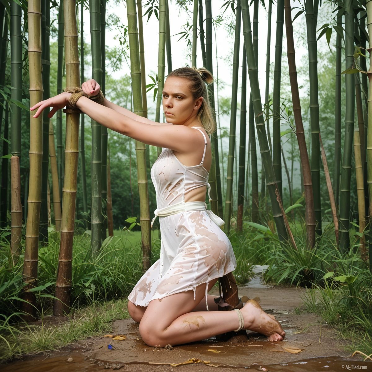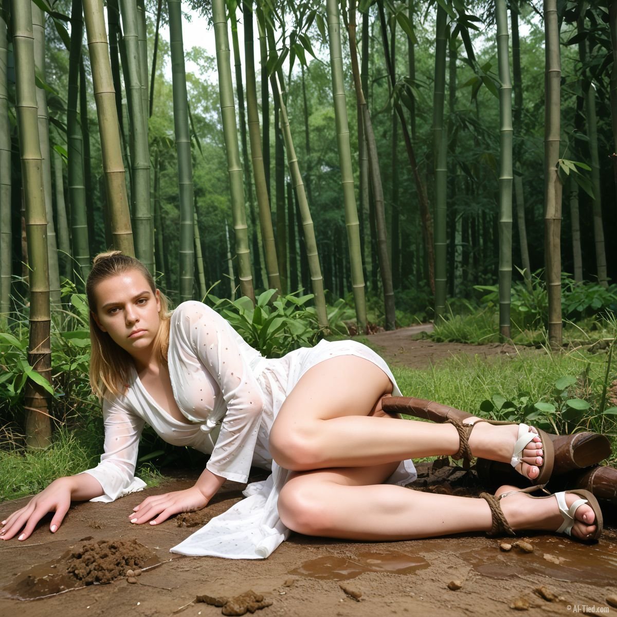 Her skimpy dress clung to her in sodden near-transparency. The pale yellow fabric, soaked through with mud and water, molded tightly over the swell of her tits and the hard points of her nipples. It plastered flat against the defined ridges of her abdomen, then flared outward at her hips, barely covering the place where the bamboo disappeared into her. The hem had ridden up from constant shifting, leaving long muddy streaks along her inner thighs and caking her knees where they sank deeper into the soft, sucking ground with every desperate attempt to rise or adjust.