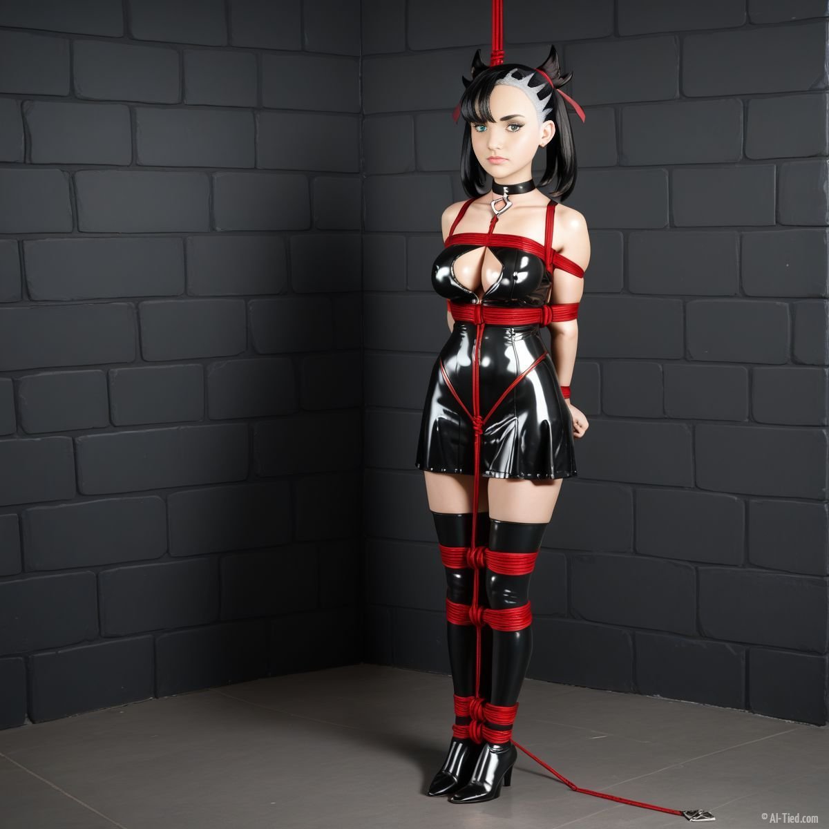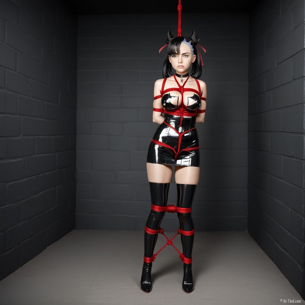 Red rope stood out sharply against the black of her outfit, a cruel contrast that made her stomach turn. The latex encased her completely, from the tall boots that hugged her calves to the tights that clung to her legs like a second skin, to the dress that pressed tight across her chest and torso. The material trapped her body heat, and she could already feel a thin sheen of sweat building beneath it, the sensation claustrophobic and maddening.