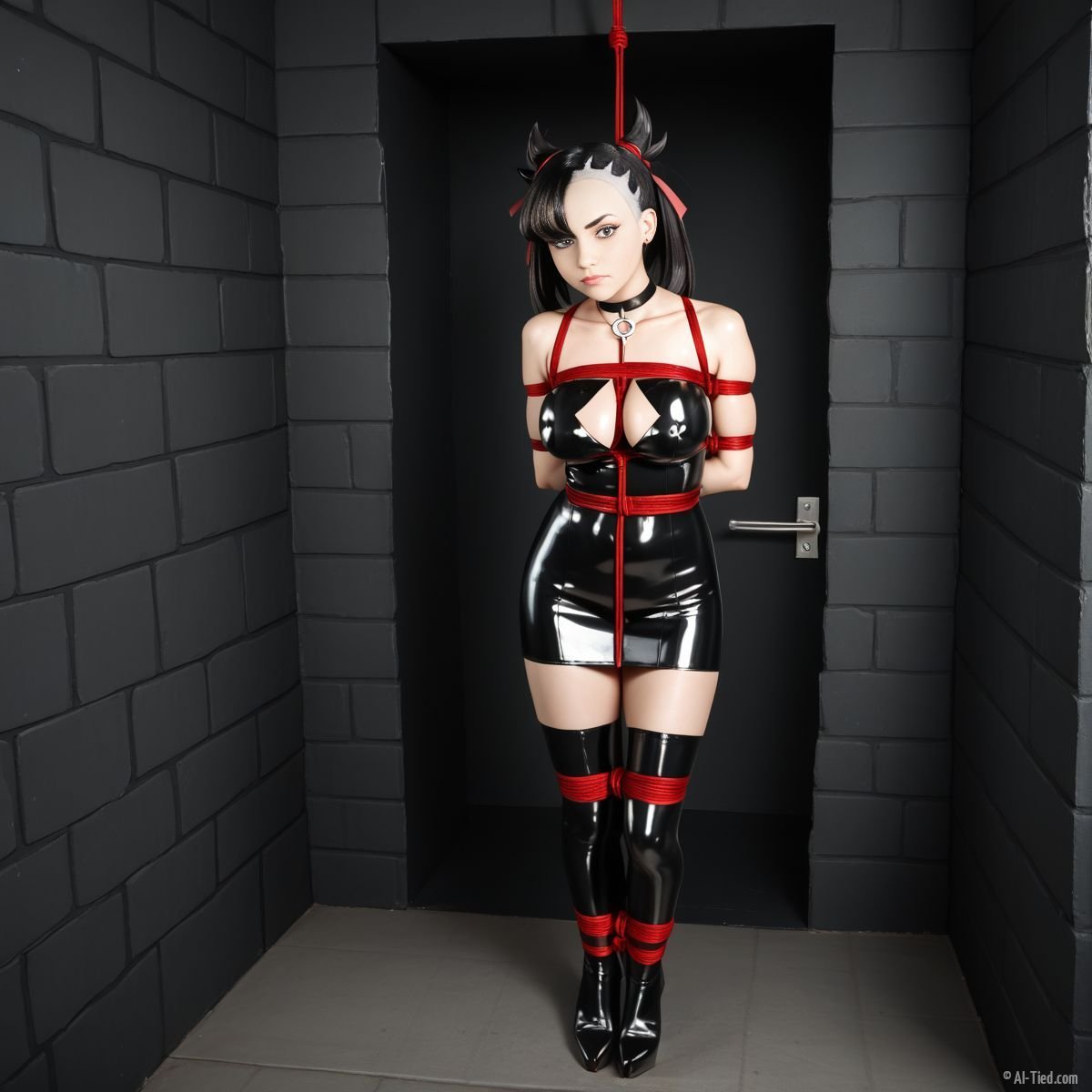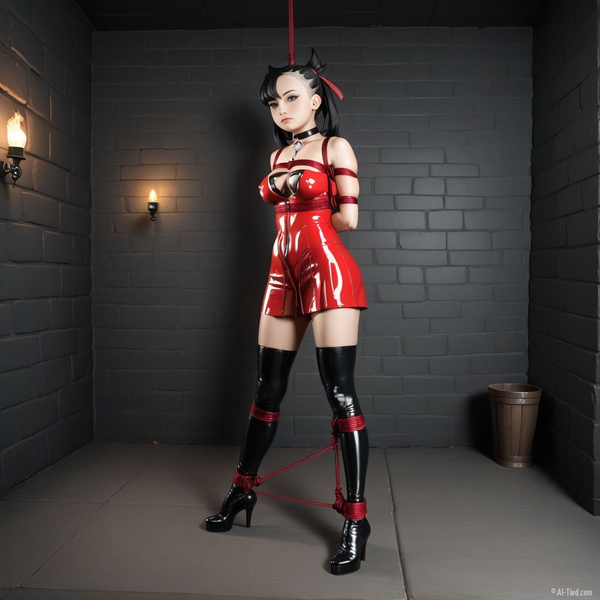 Red rope stood out sharply against the black of her outfit, a cruel contrast that made her stomach turn. The latex encased her completely, from the tall boots that hugged her calves to the tights that clung to her legs like a second skin, to the dress that pressed tight across her chest and torso. The material trapped her body heat, and she could already feel a thin sheen of sweat building beneath it, the sensation claustrophobic and maddening.